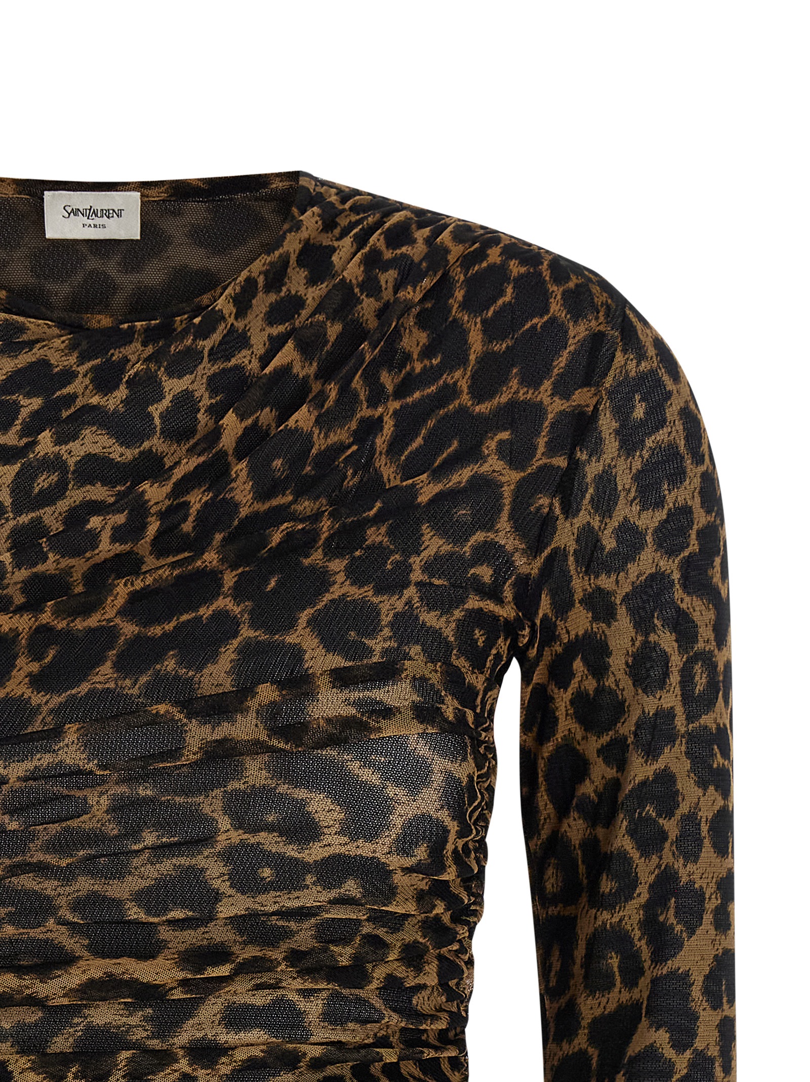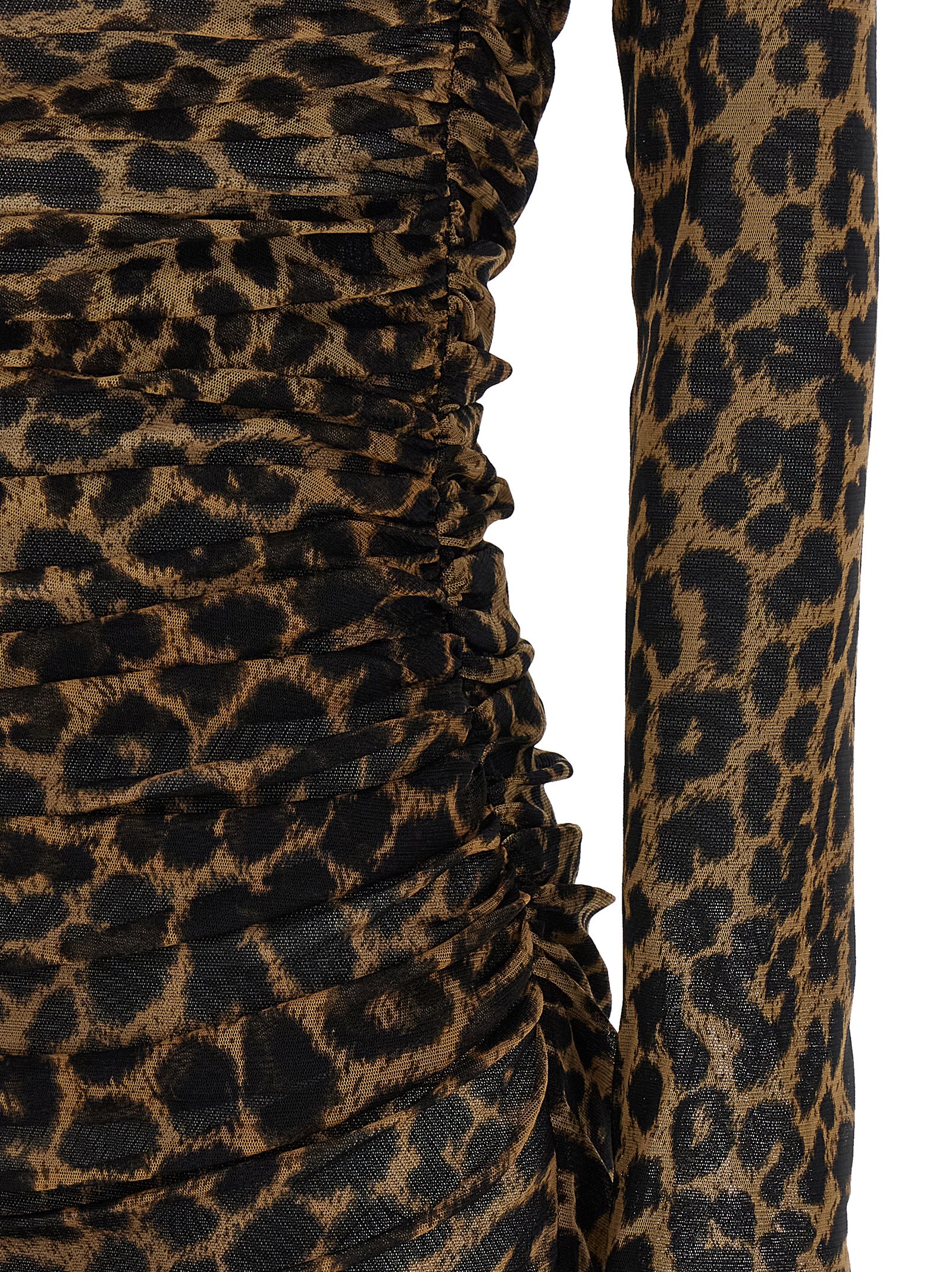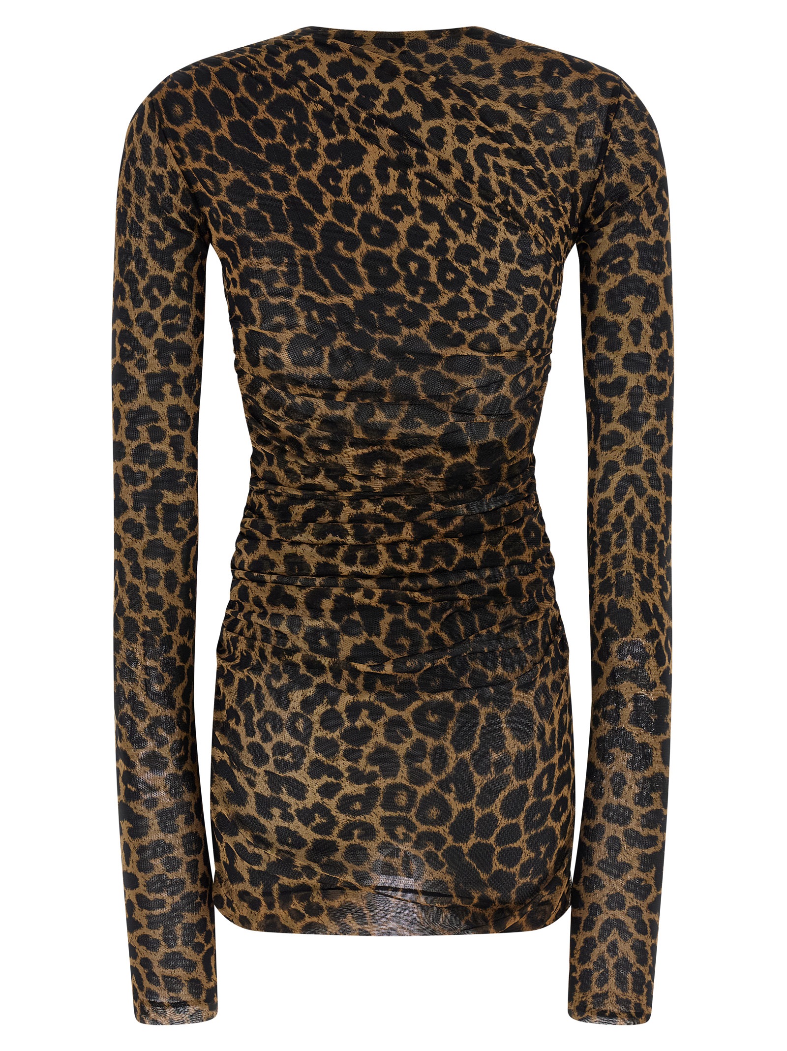 Mini dress in semi-transparent tulle jersey with crinkled leopard print, lining, crew neck, long sleeves.