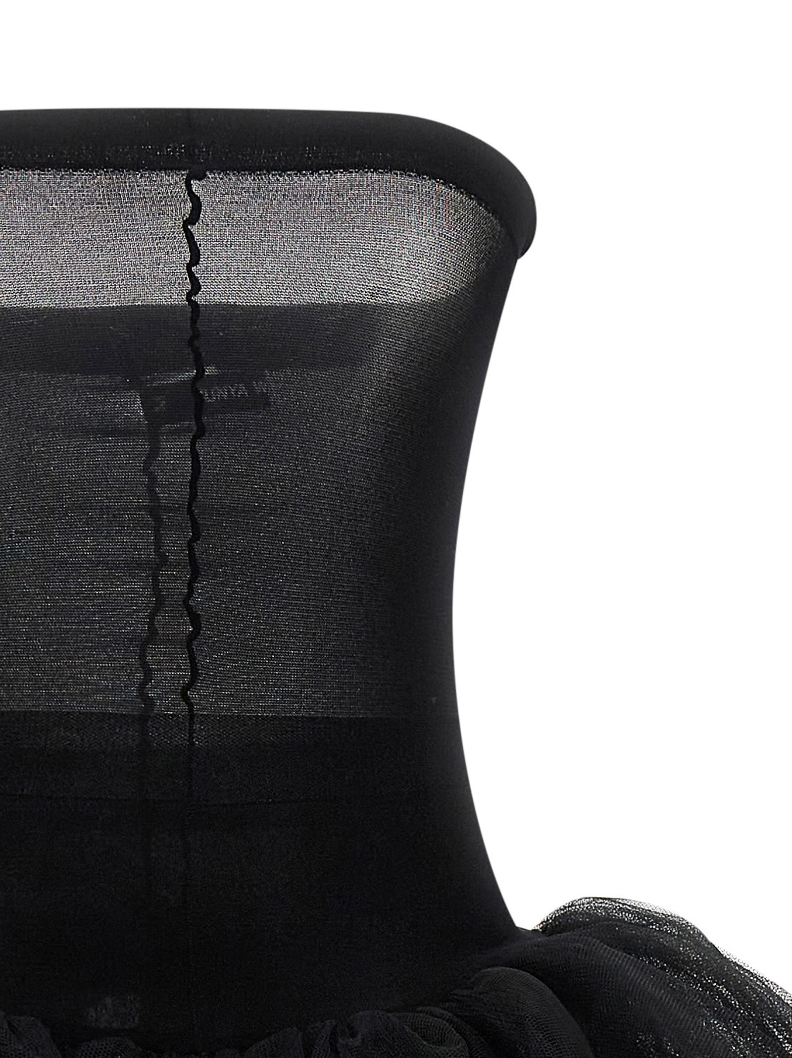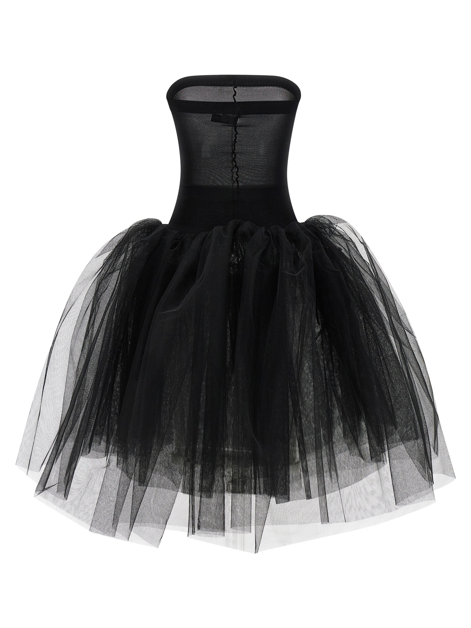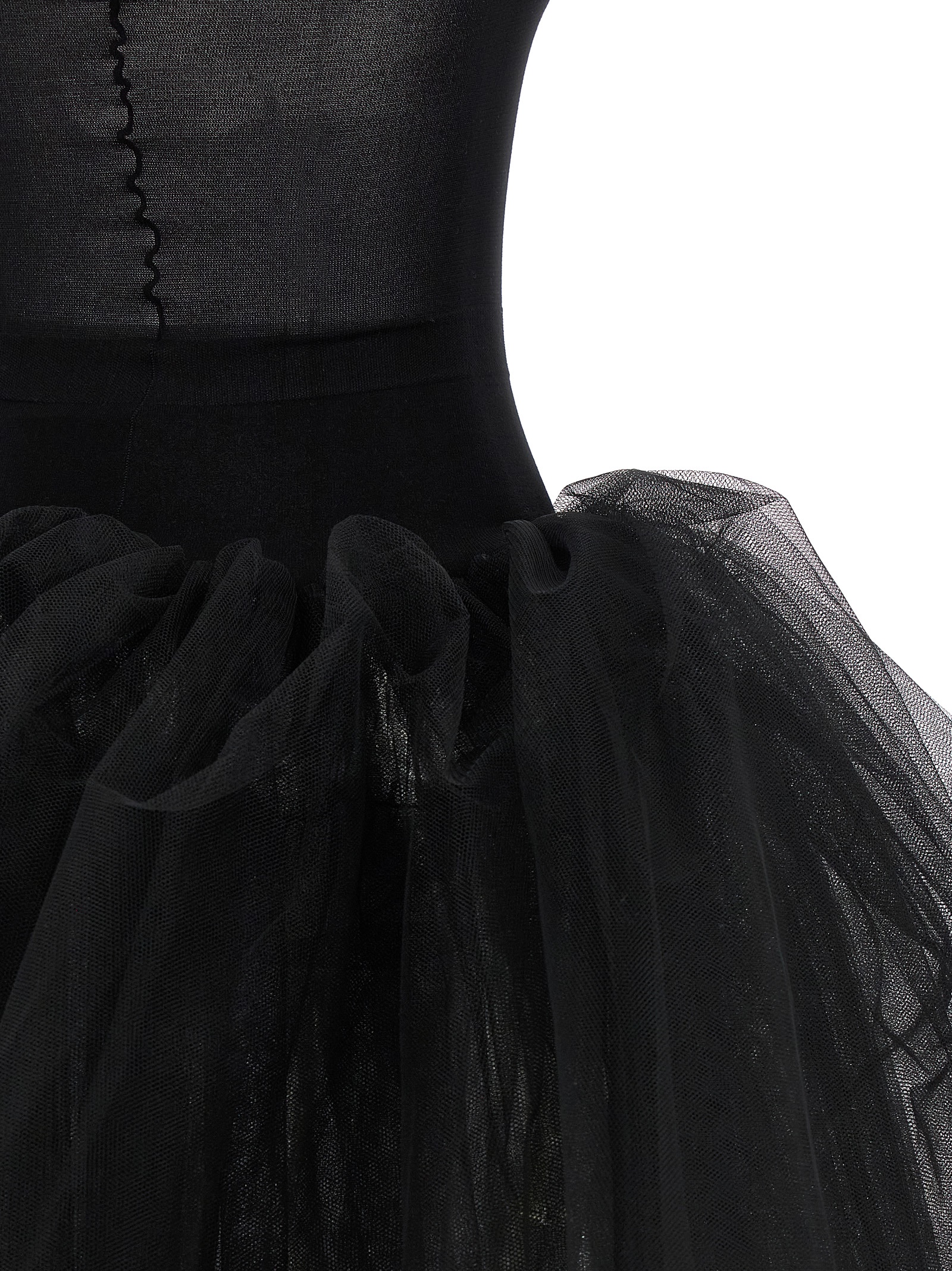 Midi dress composed of super stretch fabric top, off-the-shoulder model, sleeveless and skirt composed of several layers of structured tulle, asymmetrical hem.