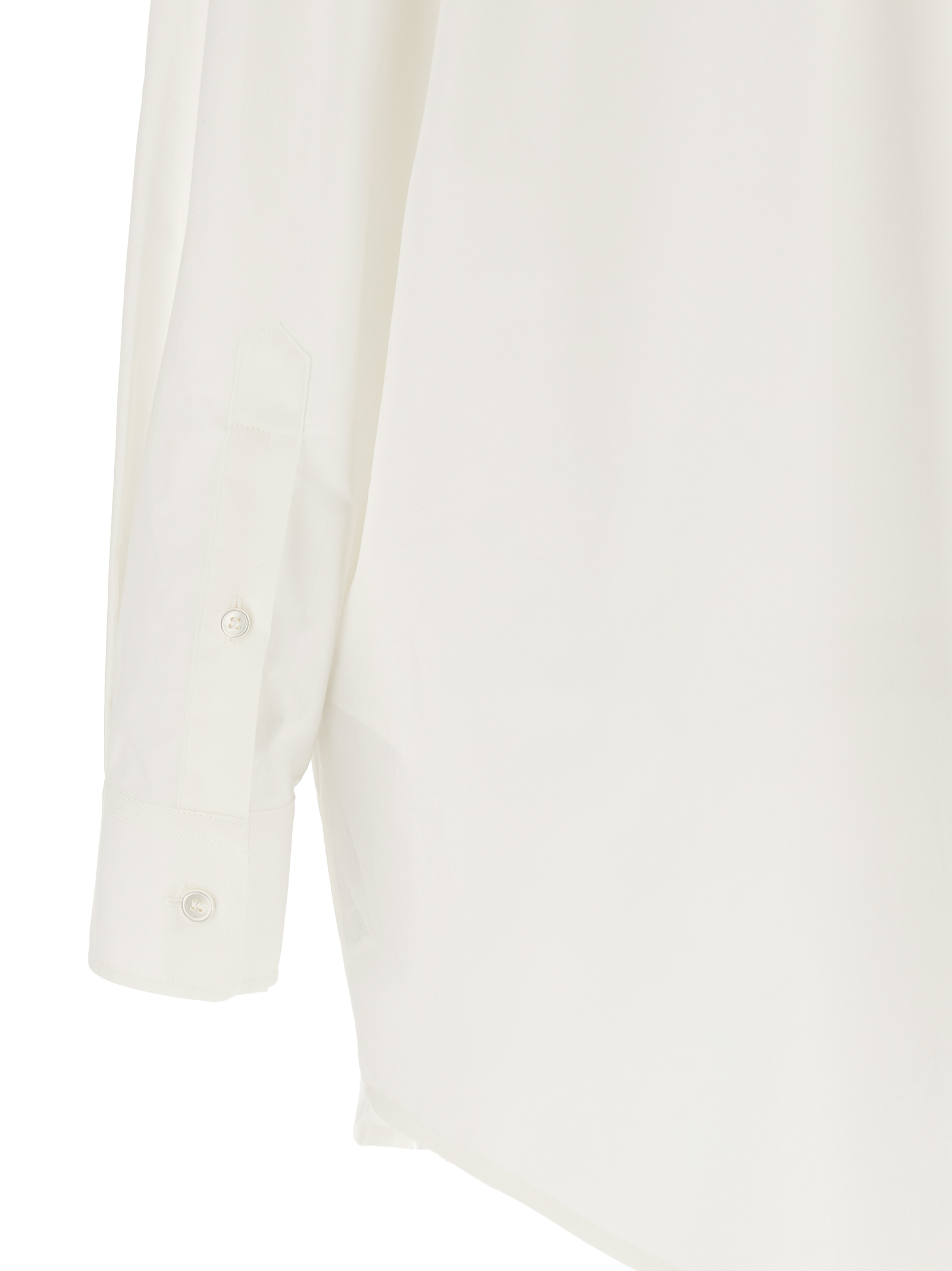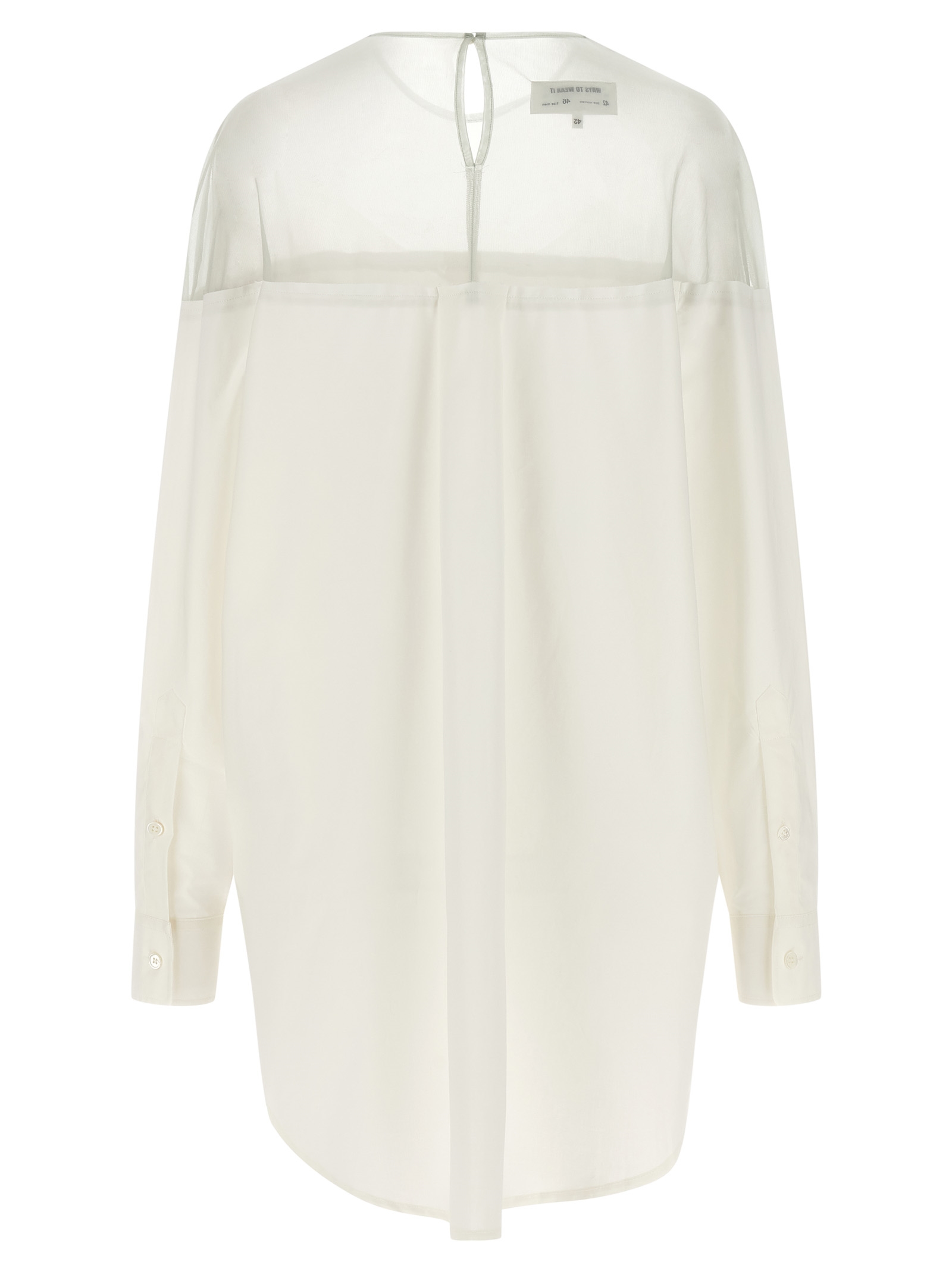 Cotton poplin shirt with semi-transparent top tulle insert, crew neck with back button closure and cut-out teardrop detail, breast pocket, front mother-of-pearl button closure, long cuffed sleeves, back rack with cannon pleats, rounded hem.
