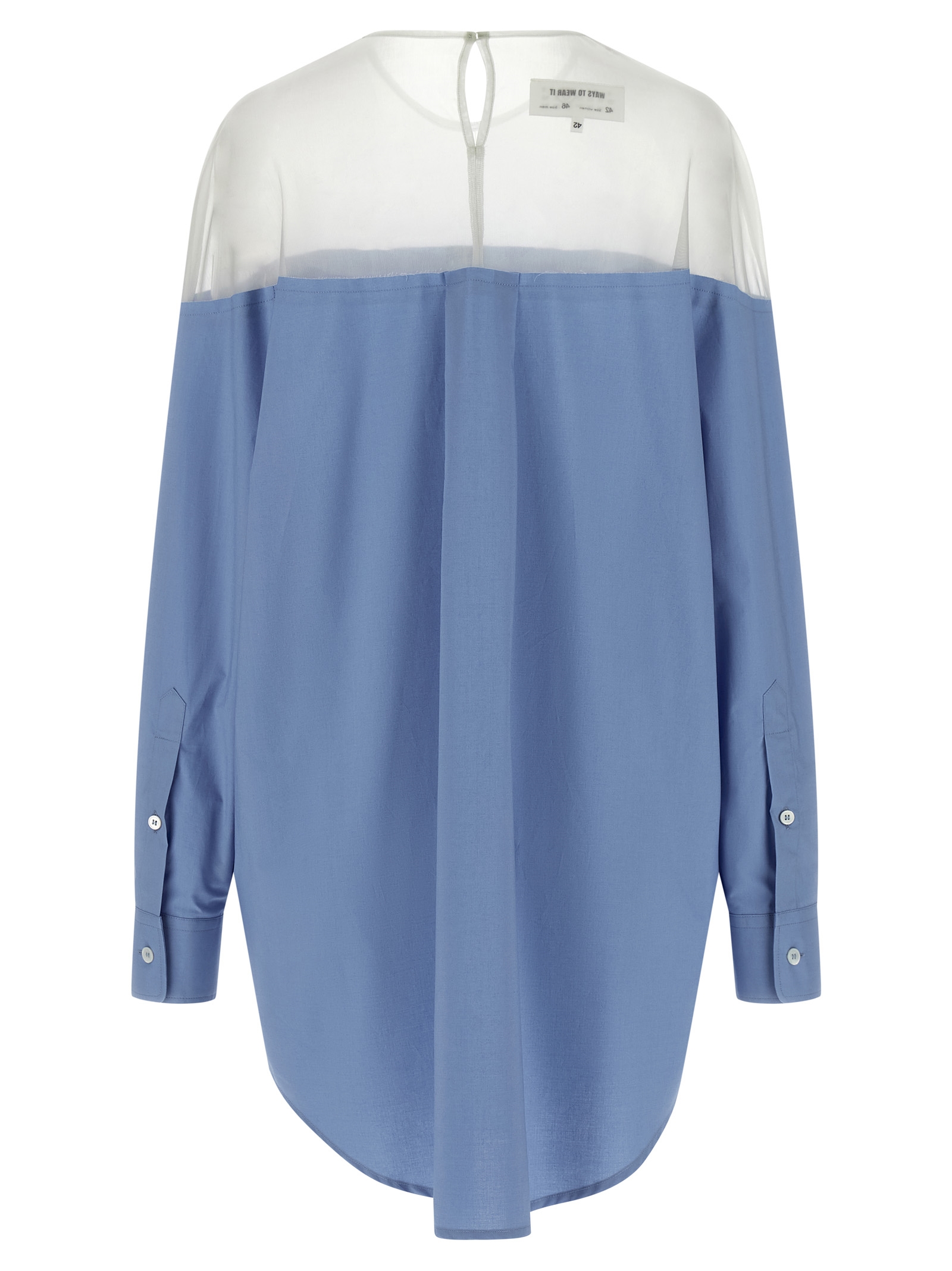 Cotton poplin shirt with semi-transparent top tulle insert, crew neck with back button closure and cut-out teardrop detail, breast pocket, front mother-of-pearl button closure, long cuffed sleeves, back rack with cannon pleats, rounded hem.