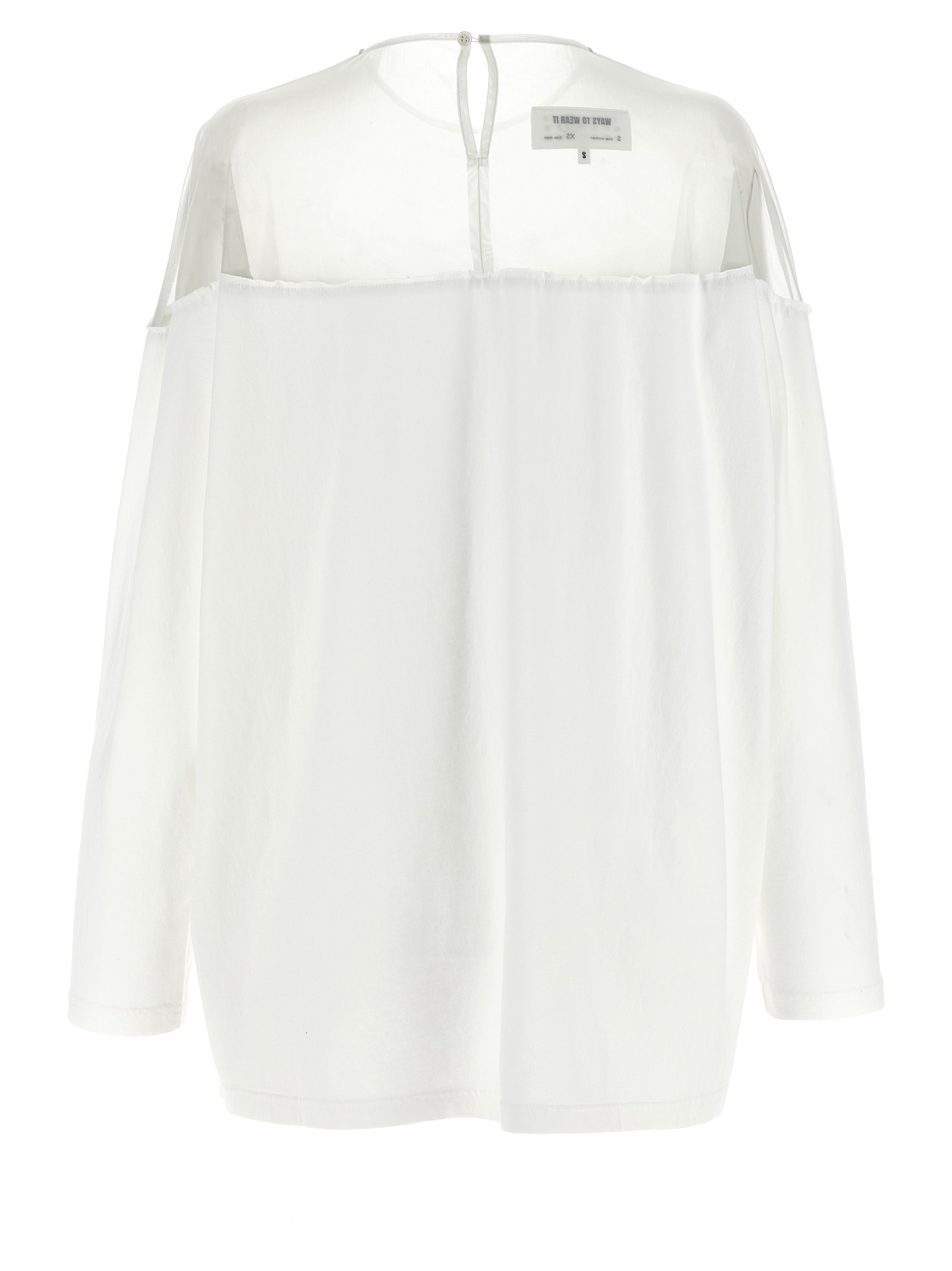 Heavy cotton jersey t-shirt, front ‘MM6’ print, semi-transparent top tulle insert, crew neck with back button closure and teardrop cut-out detail, long sleeves