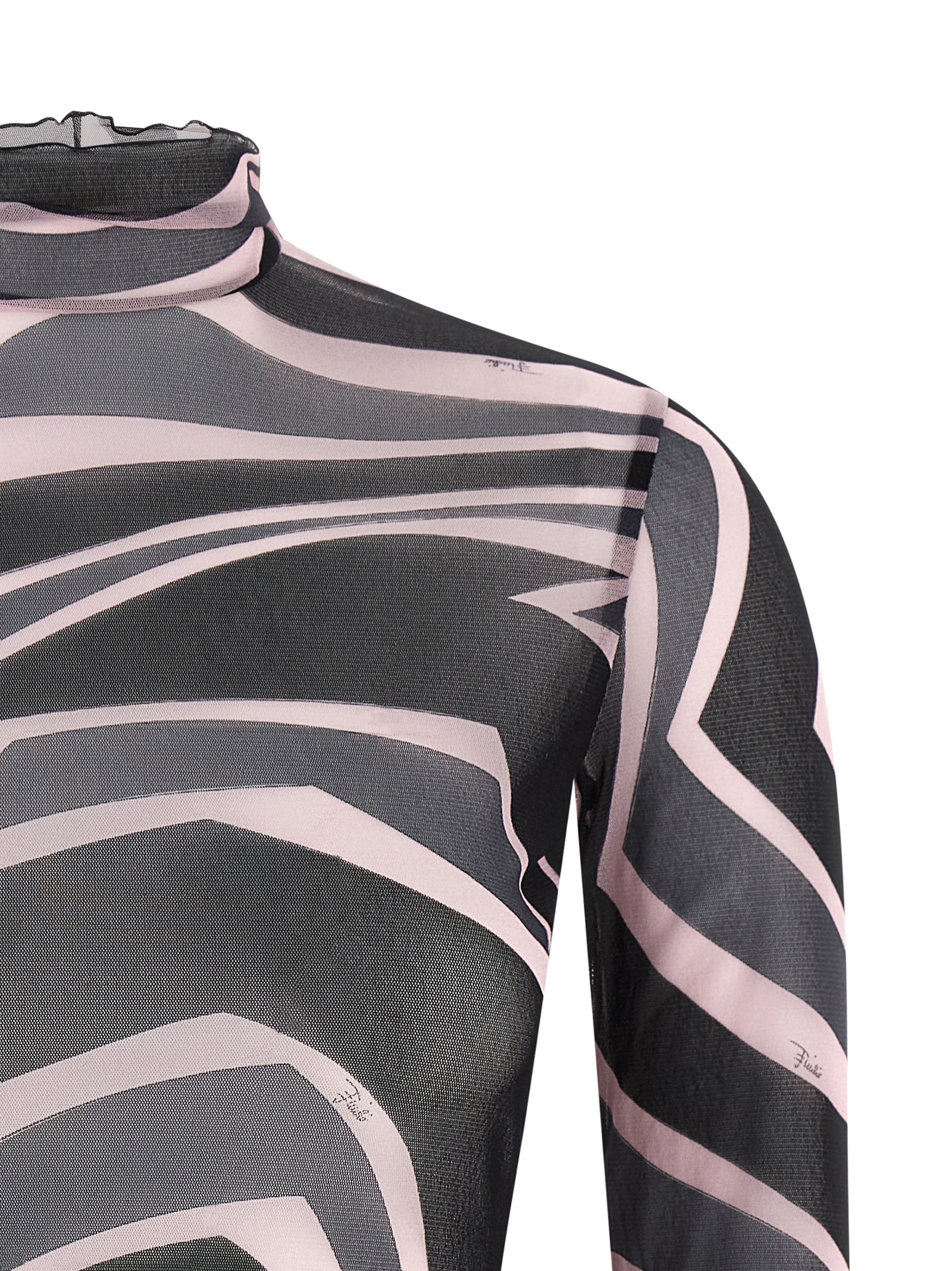Printed semi-transparent tulle sweater, high neck, long sleeves.