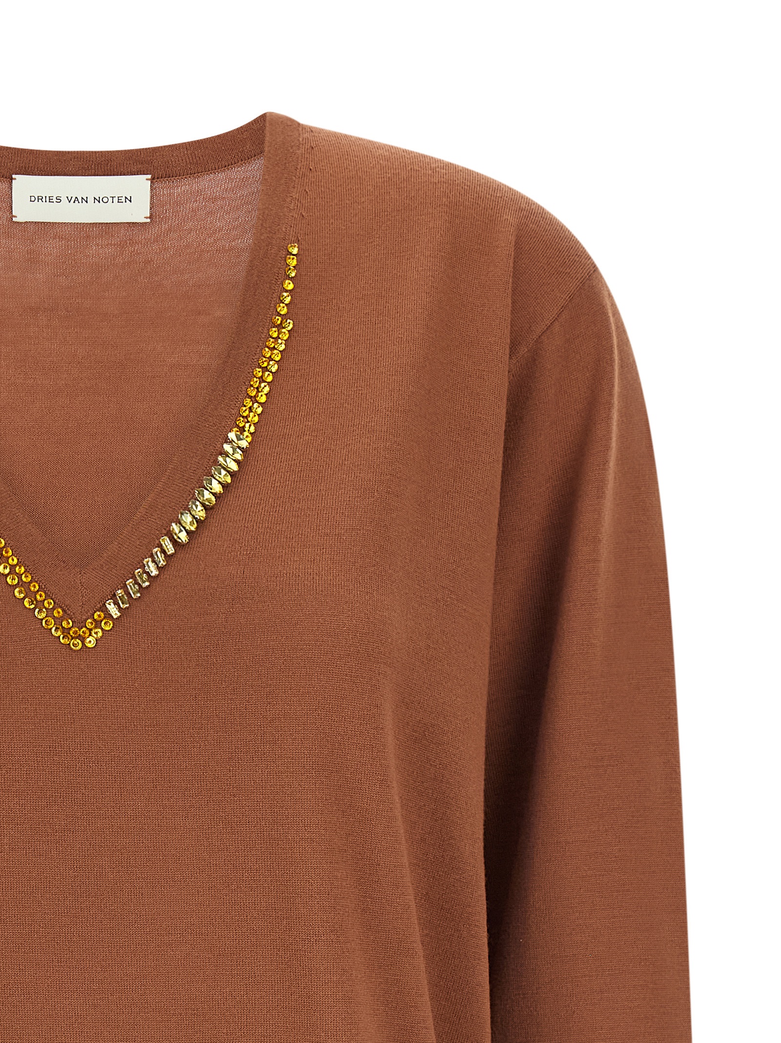 ‘Tuomas’ sweater in light merino wool, V-neck with crystal application, long sleeves with cuffs and dropped shoulder, band on the hem.