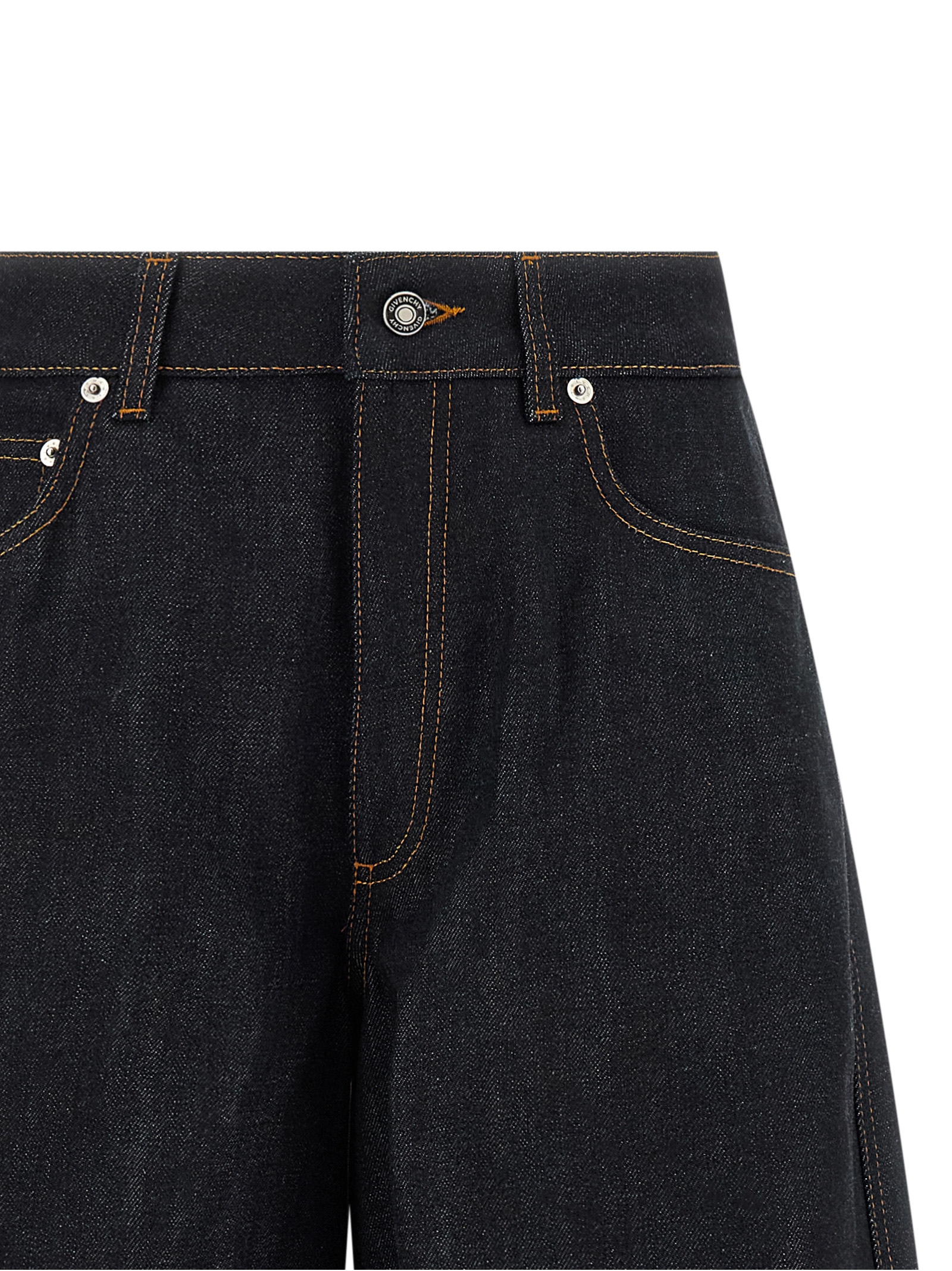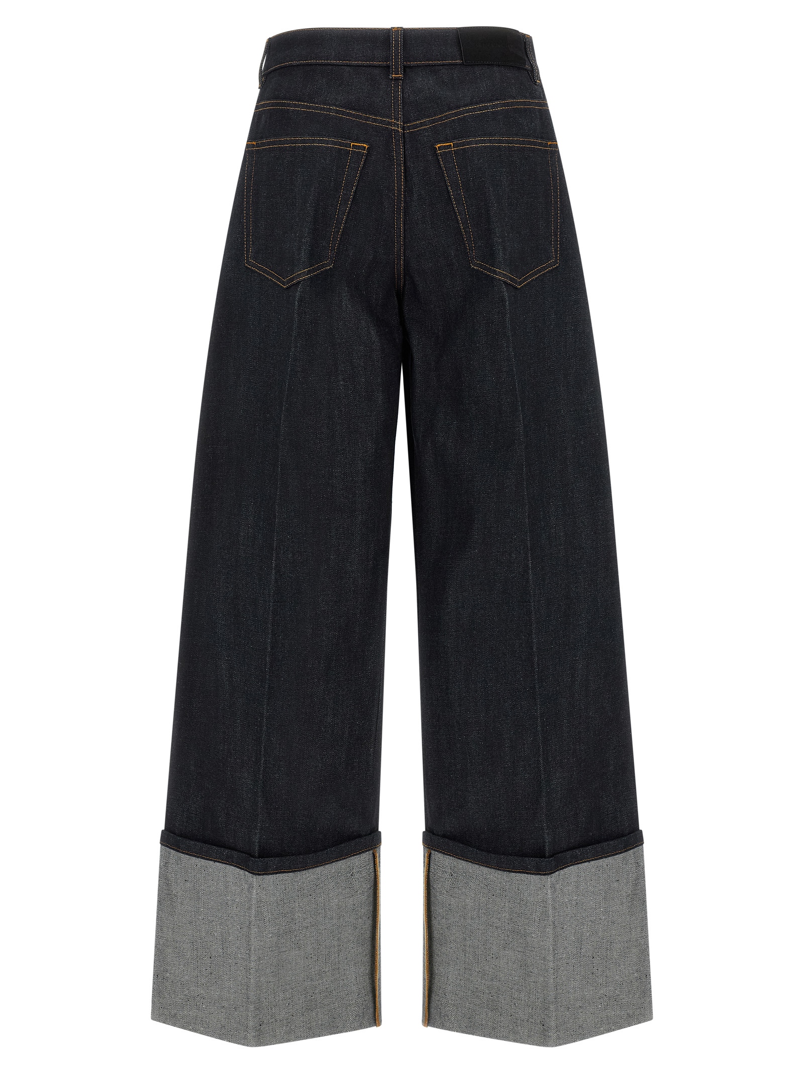 Raw-effect cotton denim jeans, contrast stitching, flared silhouette, extra wide and long leg, stretched pleat, front zip and button closure, five pockets, back suede logo tag, stitched turn-up on the leg bottom.