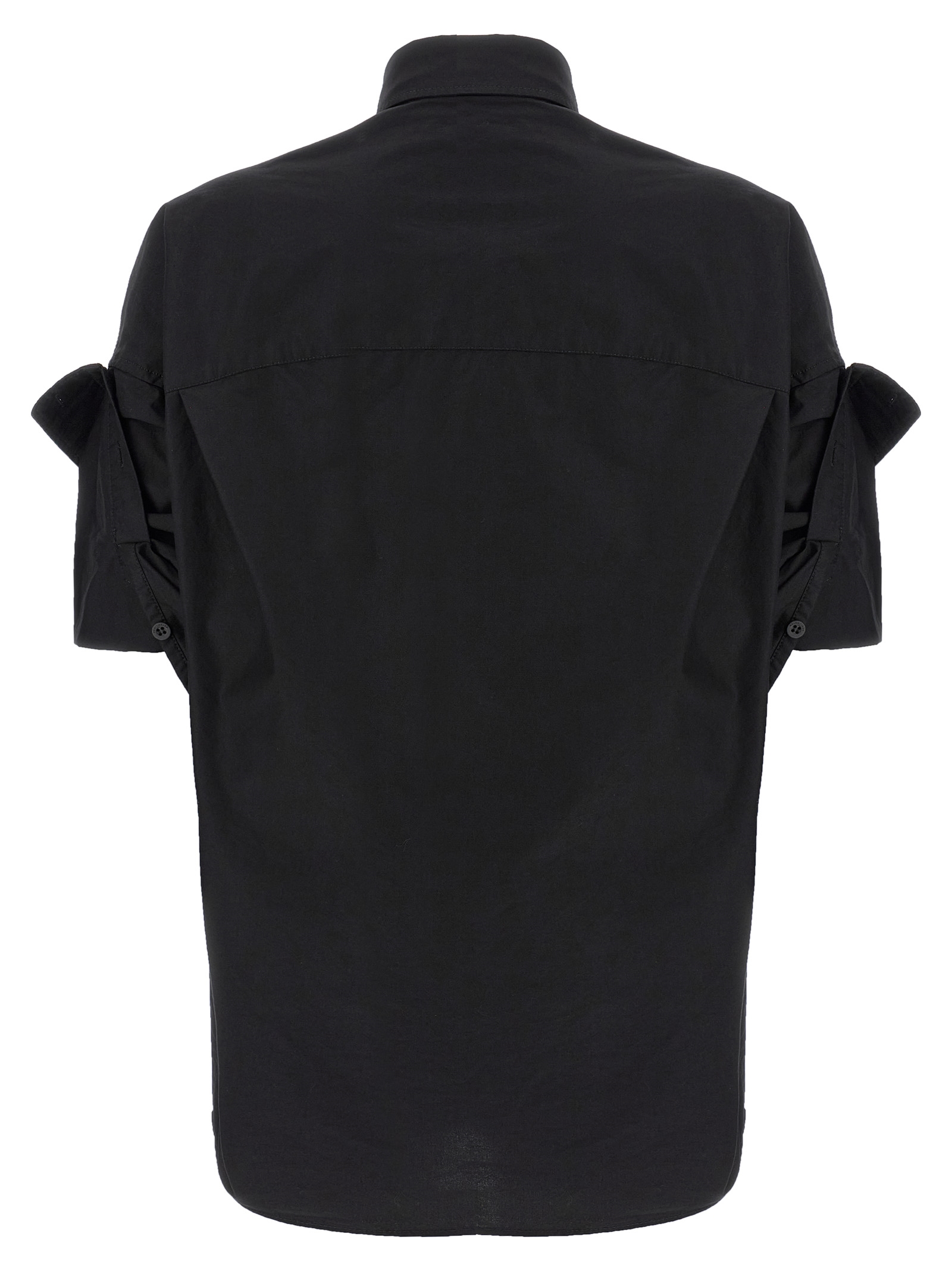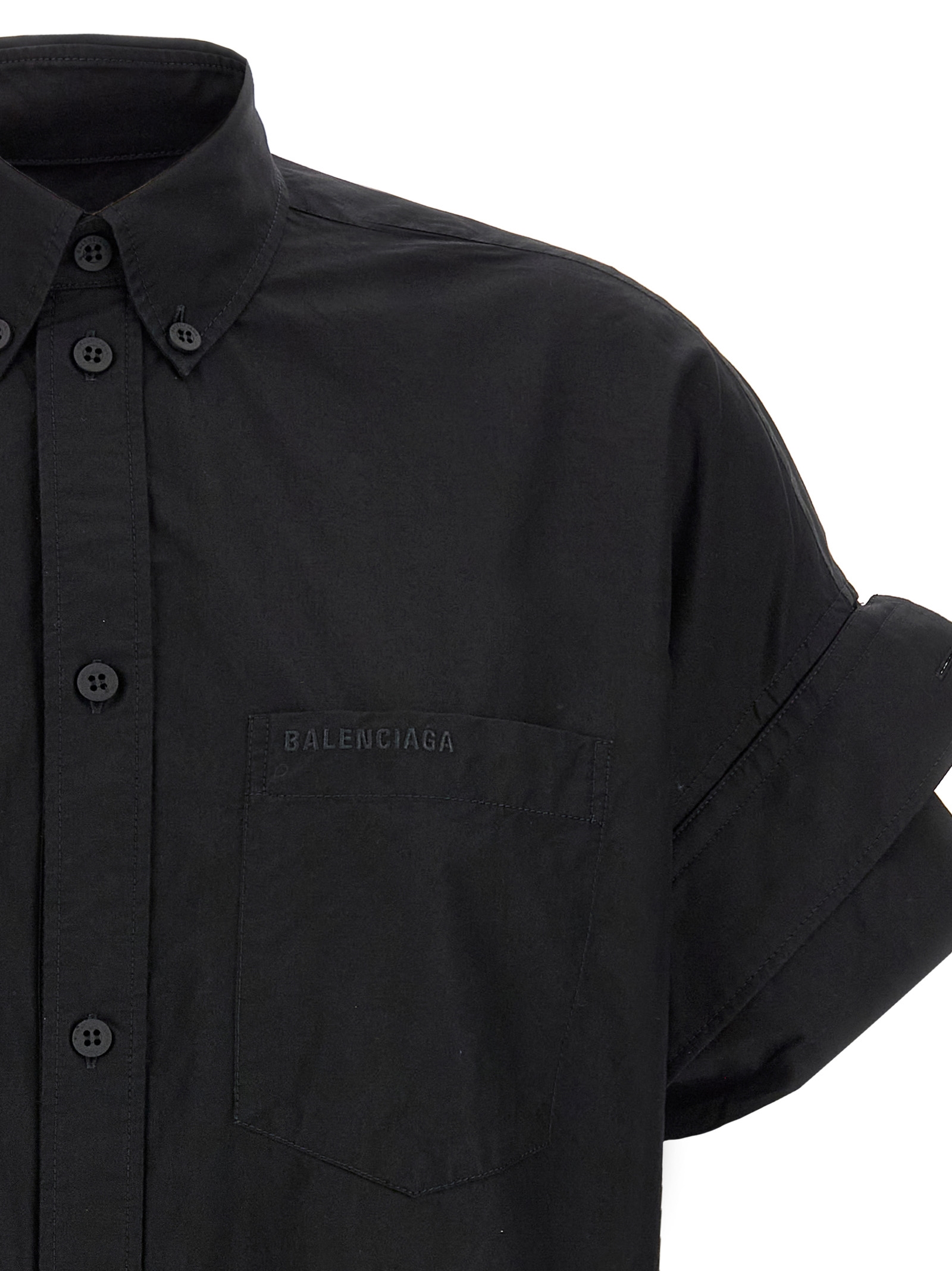Button-down cotton poplin shirt, front button closure, chest pocket with tone-on-tone embroidered logo, and short sleeves with turned-up cuffs.