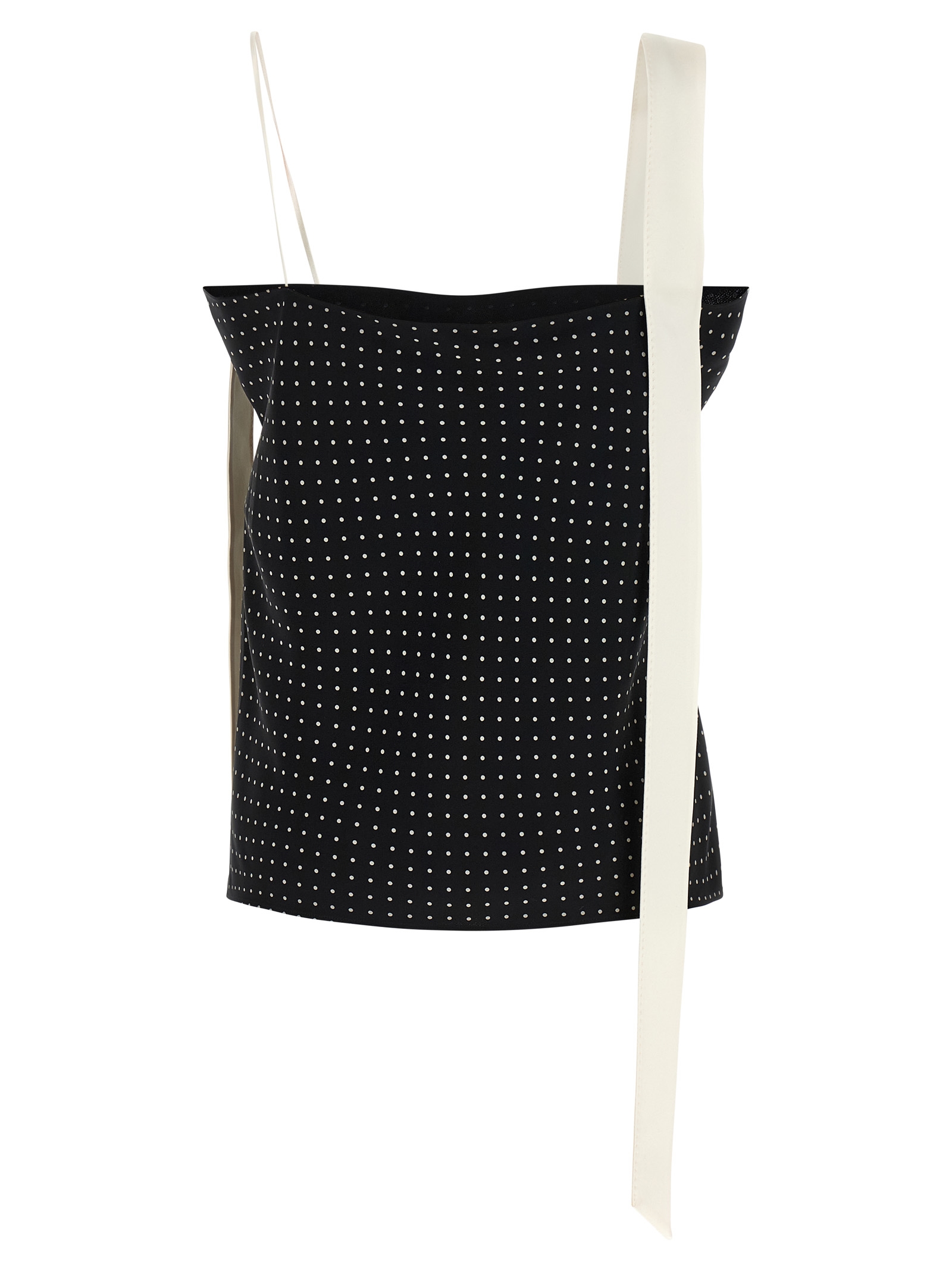 Polka dot patterned silk crêpe top, thin straps with contrast satin tuxedo band detail that runs down the body, square neckline.