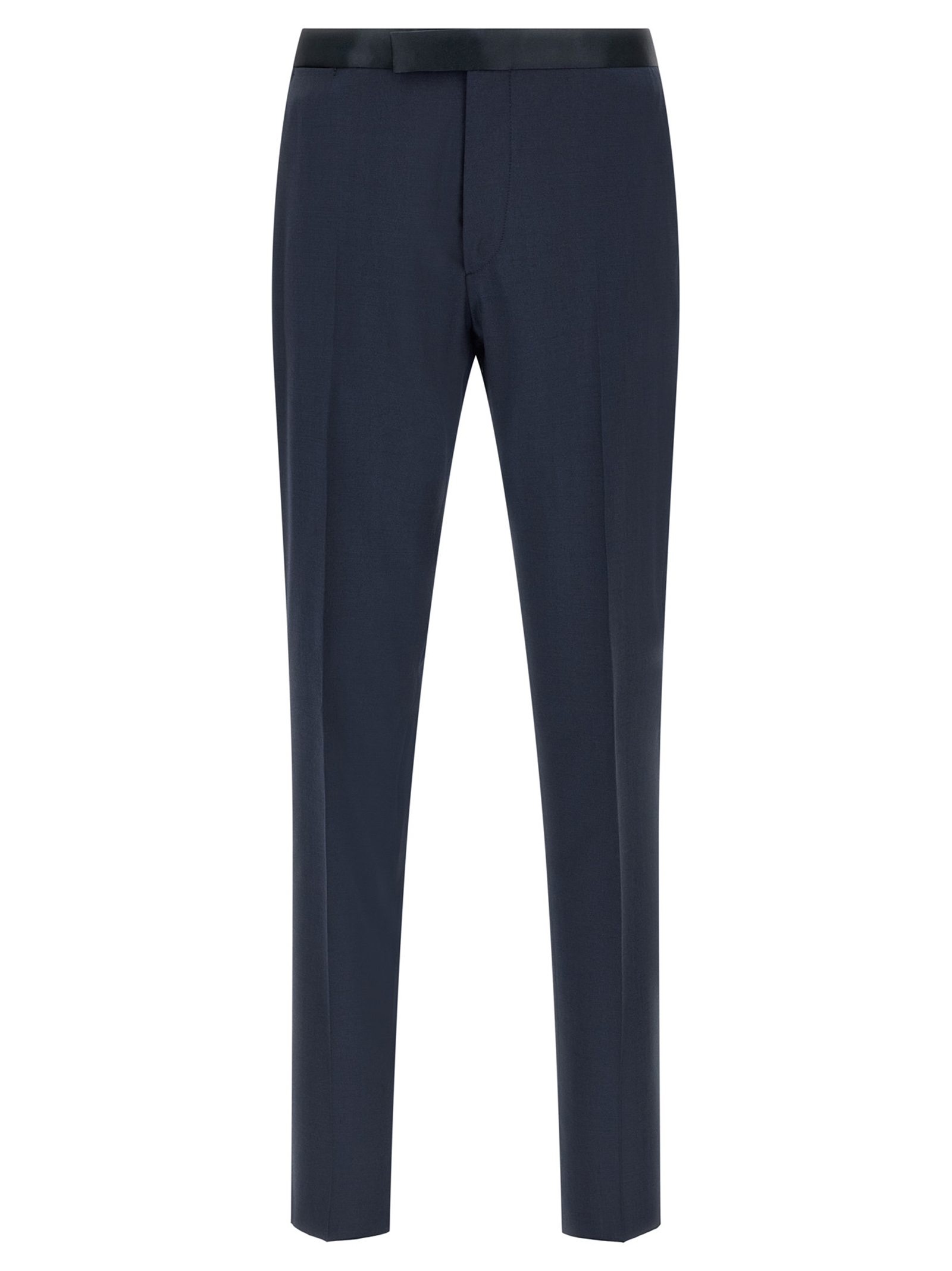 Super 110’S virgin wool tuxedo dress with tone-on-tone satin details, single-breasted blazer with front covered button closure, shawl collar, breast pocket, patch pockets, structured shoulder strap, opening buttonhole cuffs, back split, cupro lining, three inner pockets and trousers with straight leg, stretched pleat, zip closure and front hooks. Front American pockets, back welt pockets, leg bottoms to be finished, cotton lining.