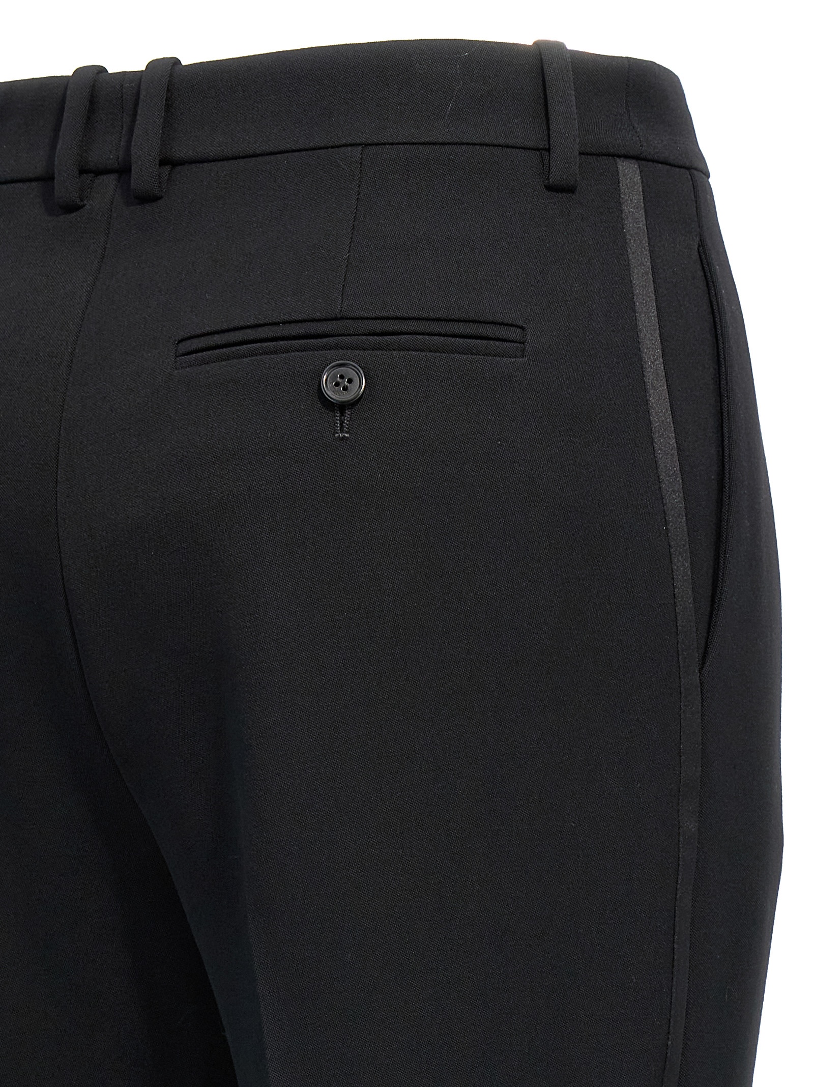 Tuxedo pants in grain de poudre wool, side satin band, zip and button closure, pockets, flared leg with stretched pleat.
