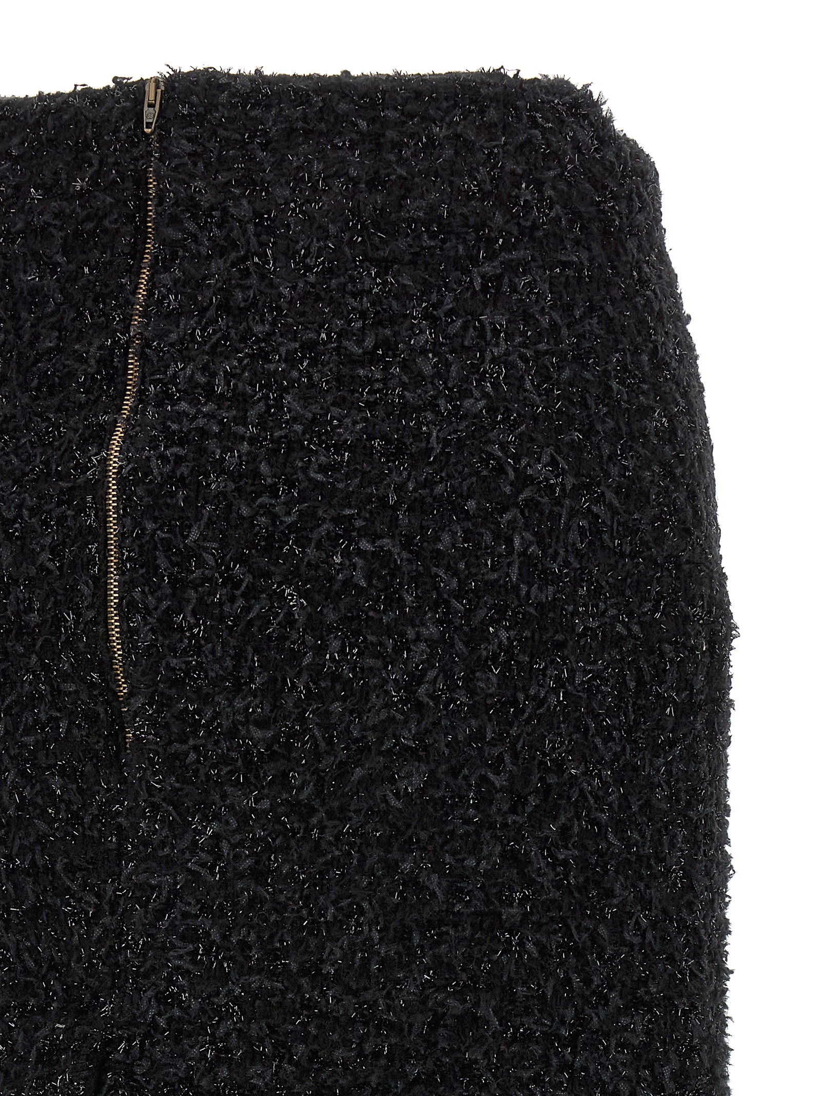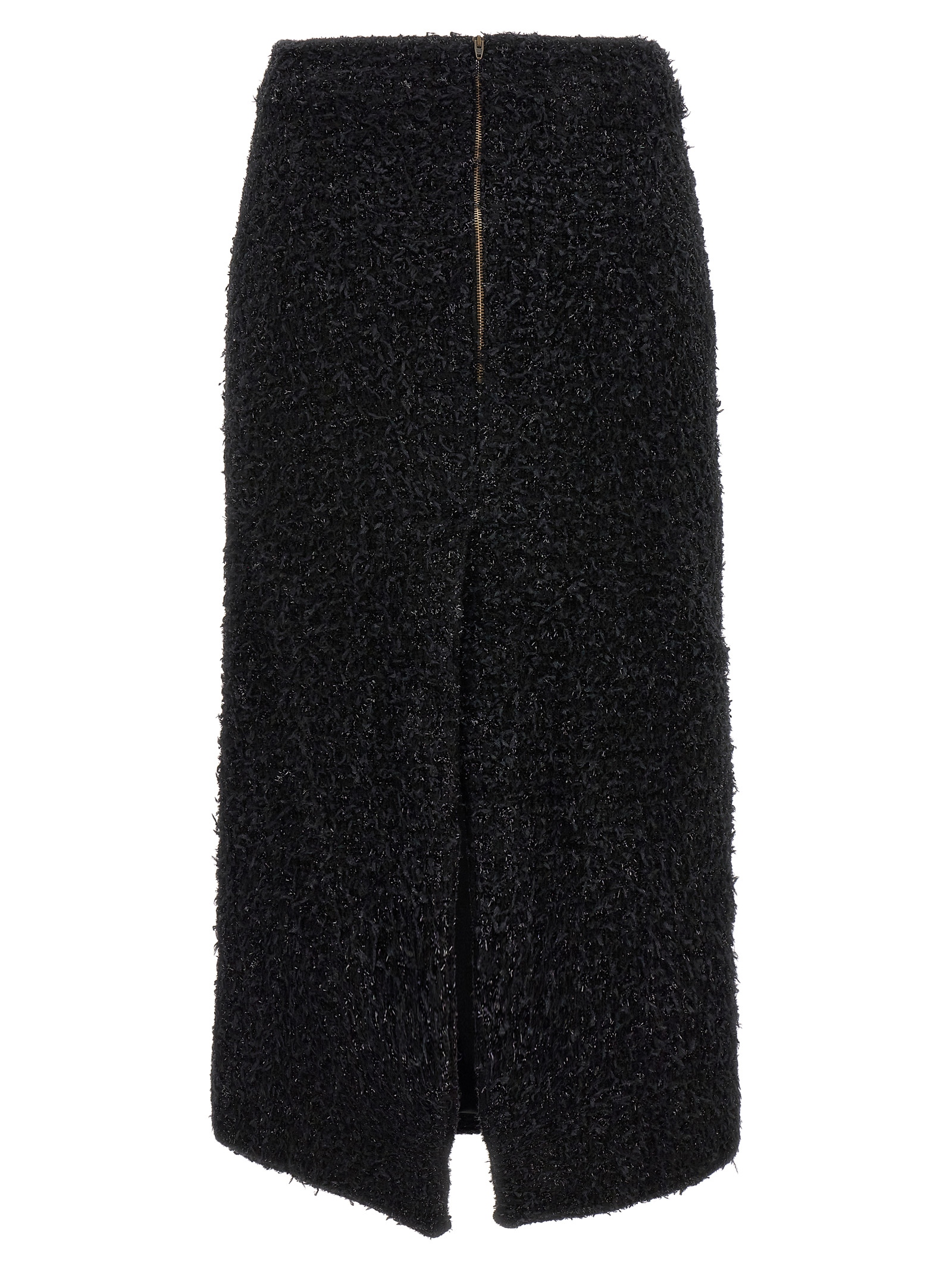 Tweed midi skirt, wide back slit and zip closure.