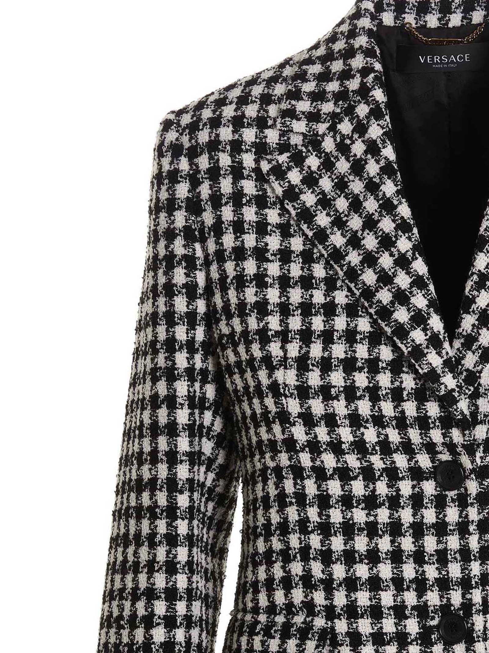 Single breast tweed wool blazer jacket with button closure, pockets, long sleeves and a back split.