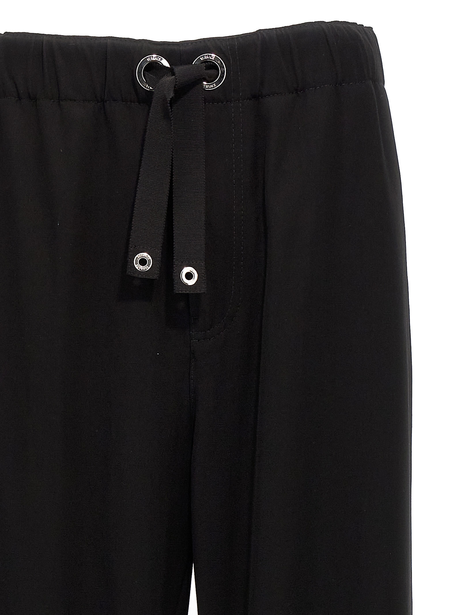 Viscose and cotton blend twill pants with elastic and drawstring at the waist, zippered flap and pockets.