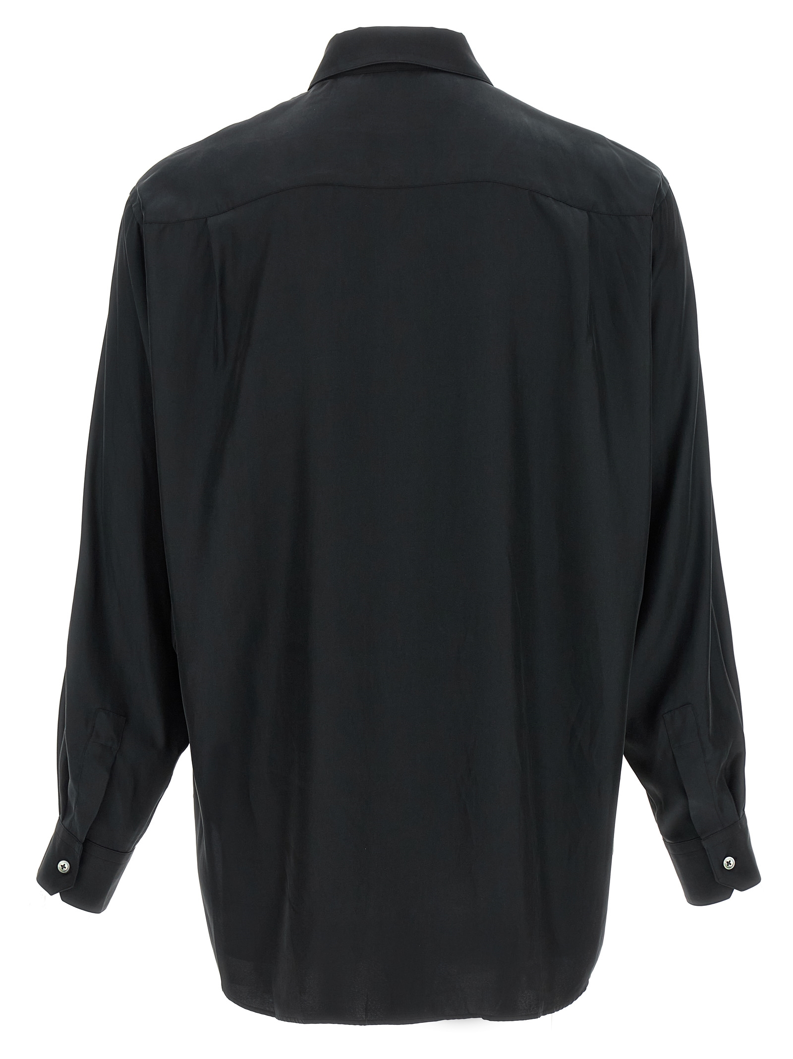 Shiny cupro twill shirt, chest pocket, front mother-of-pearl button closure, long sleeves with blunt cuffs and dropped shoulder, rounded and asymmetrical hem.