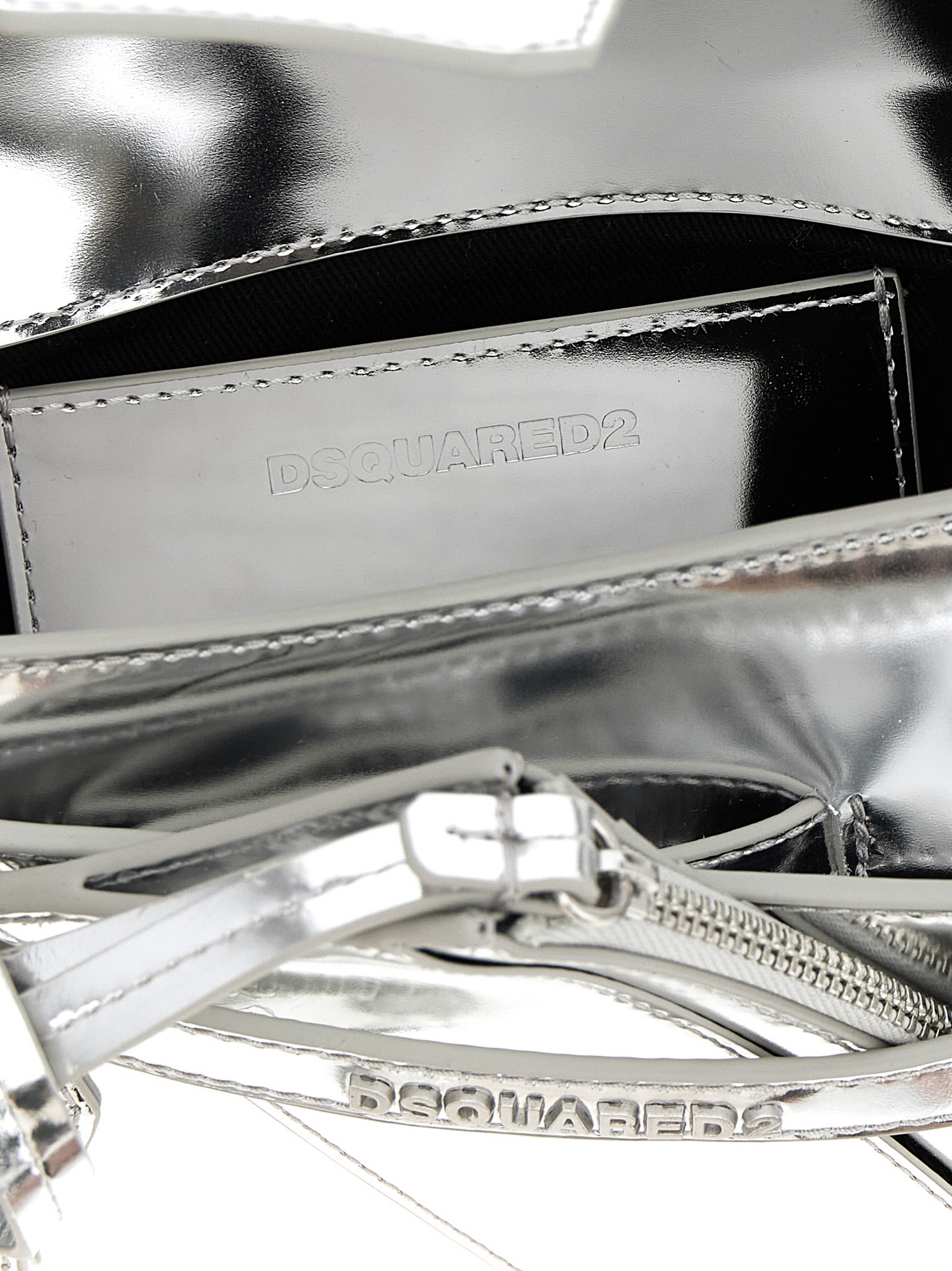 ‘Twin Mini’ laminated leather handbag, front metal lettering logo, inner snap button closure, double fixed handle, adjustable and removable shoulder strap, removable inner clutch bag with magnetic flap closure and wrist handle, removable coin purse.