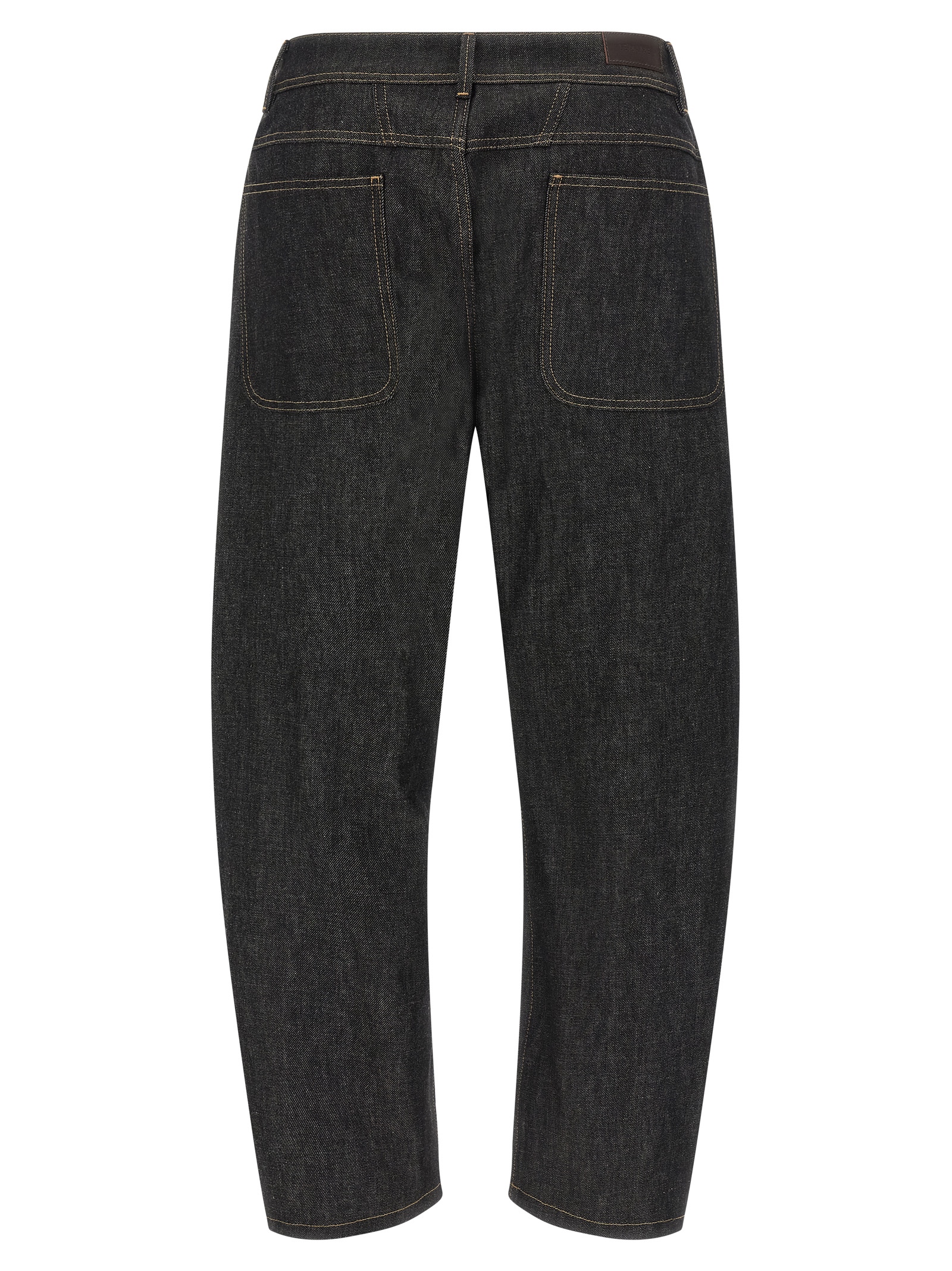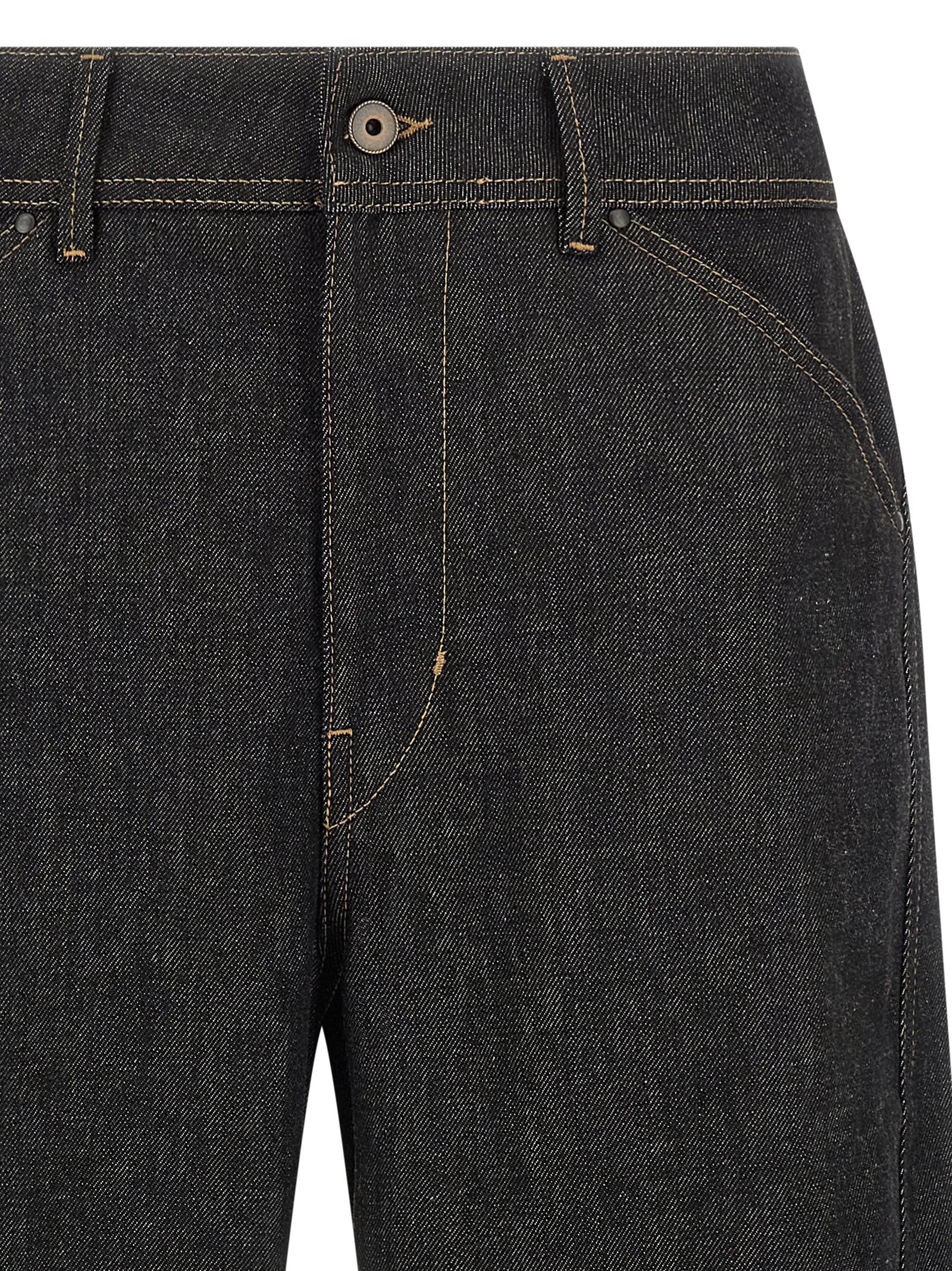 ‘Twisted Workwear’ thick cotton denim jeans with contrast stitching, twisted silhouette, front zip and button closure, pockets, back leather logo tag.