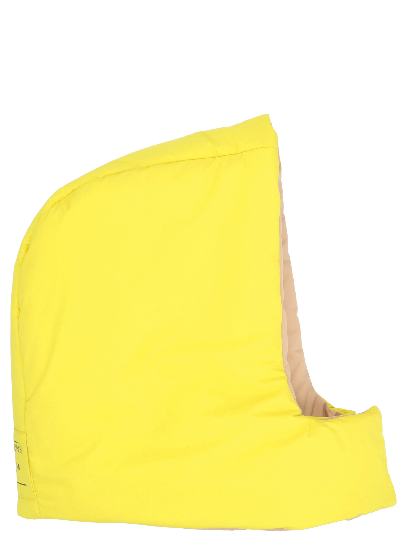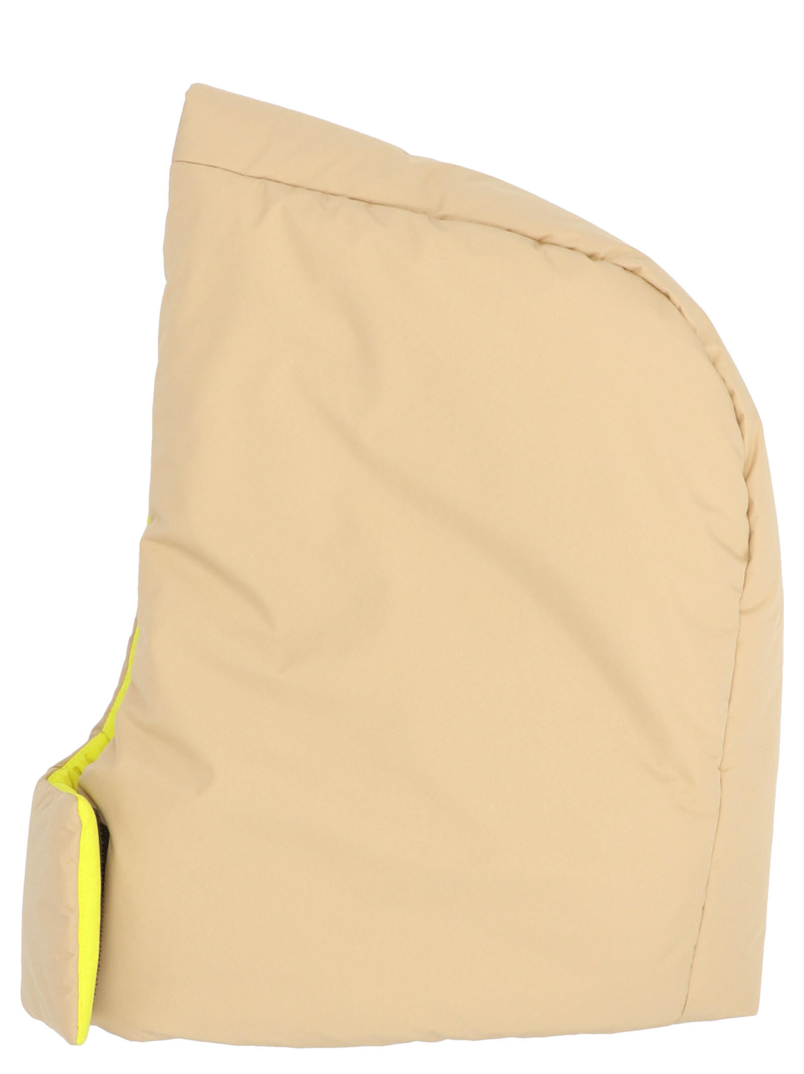 Two-color, beige and yellow, padded reversible hood featuring a velcro strap.