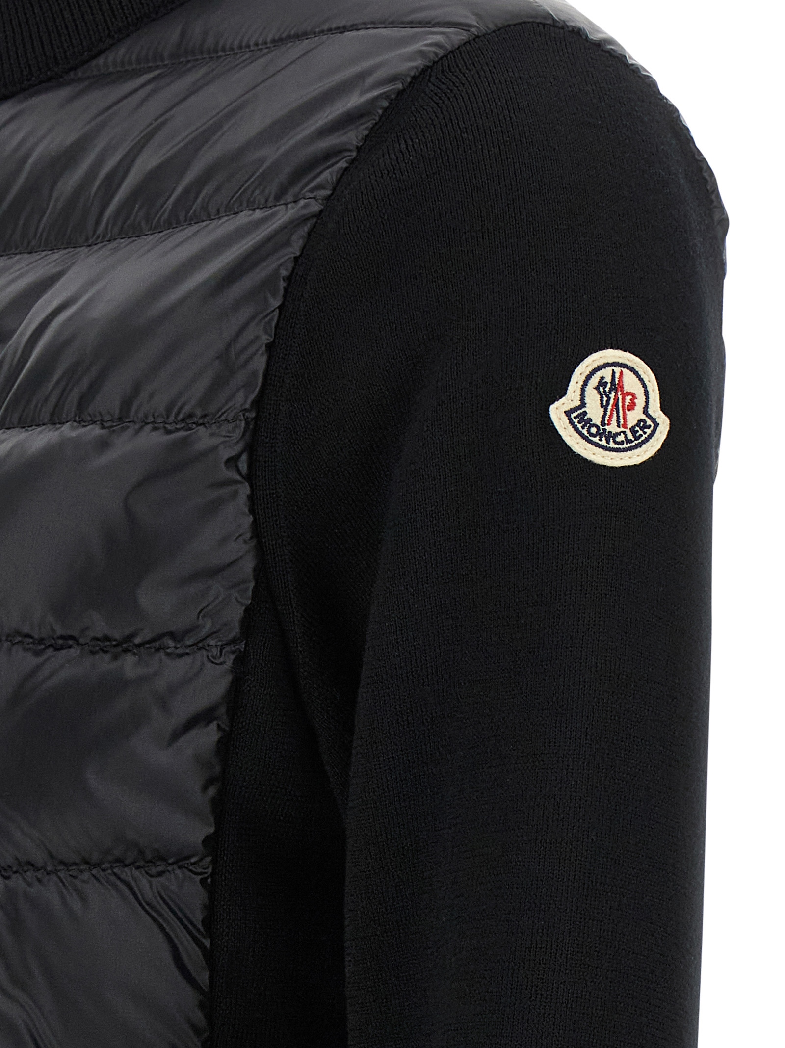Two-material cardigan in extra fine wool yarn 14 fineness, quilted saison longue vest with feather padding, high neck, zip closure, pockets, long cuffed sleeves and felt logo patch.