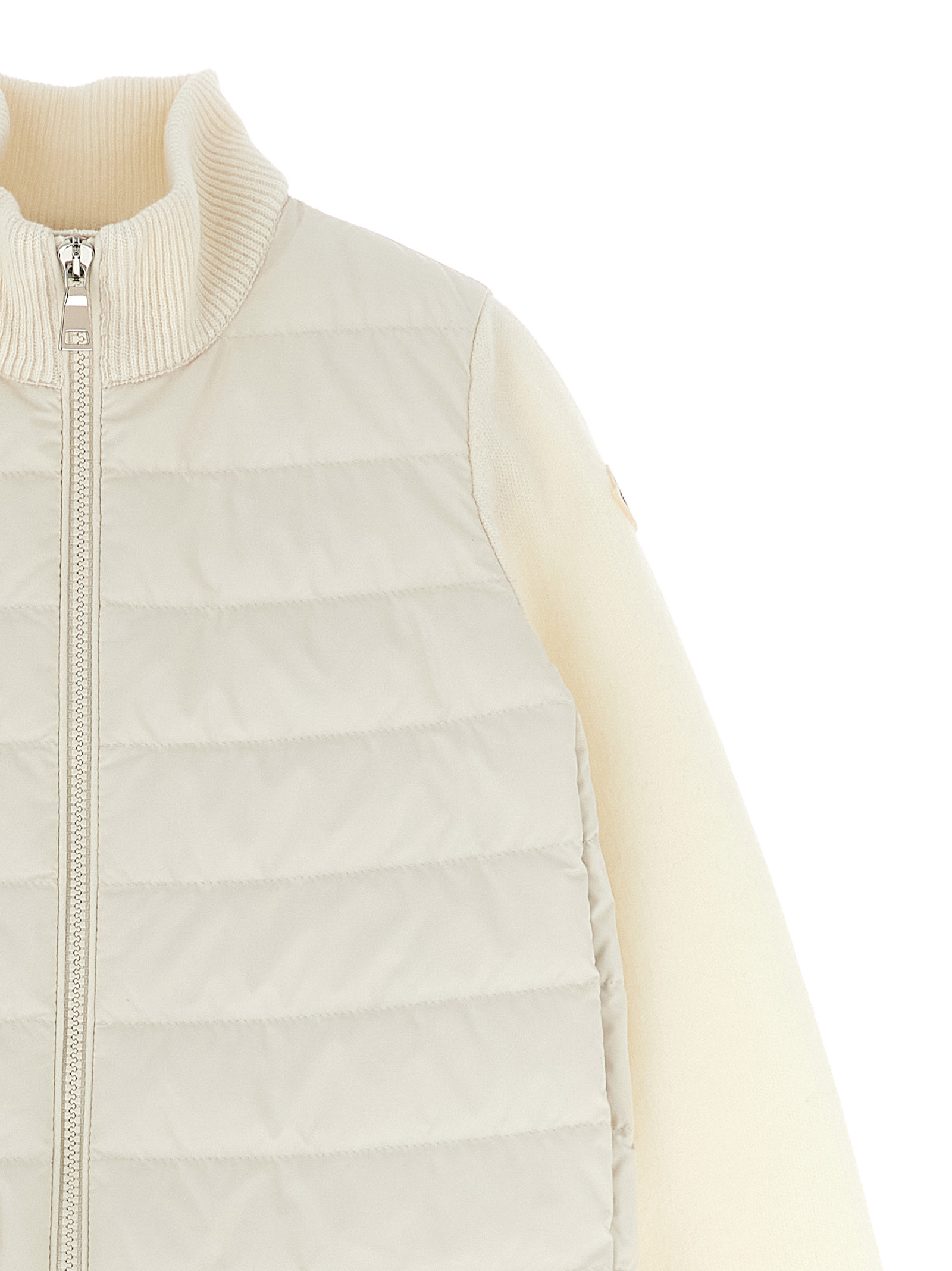 7 fineness carded wool cardigan with synthetic fabric vest with goose down padding, high neck, front zip closure, pockets, long cuffed sleeves and felt logo patch appliqué.