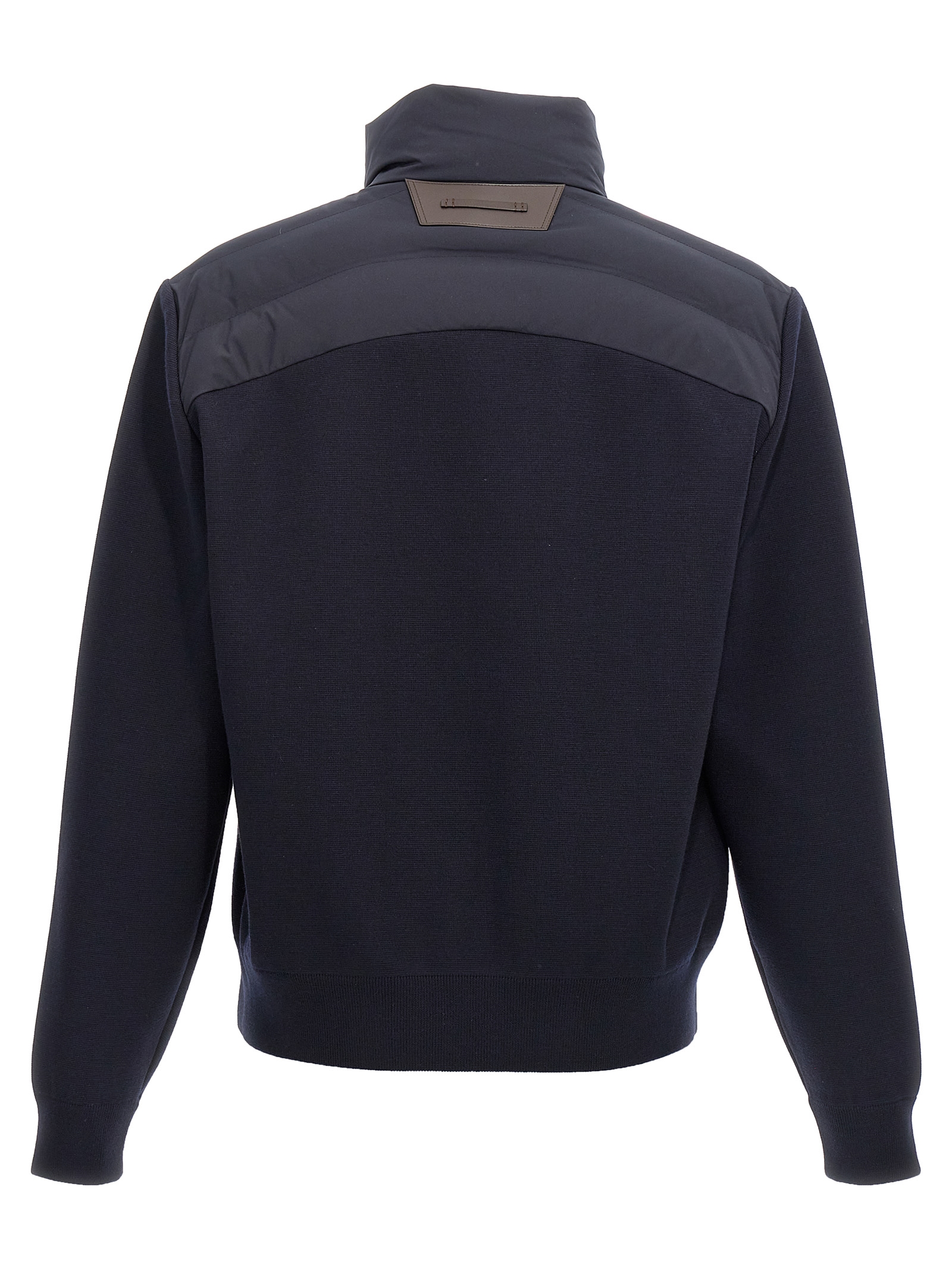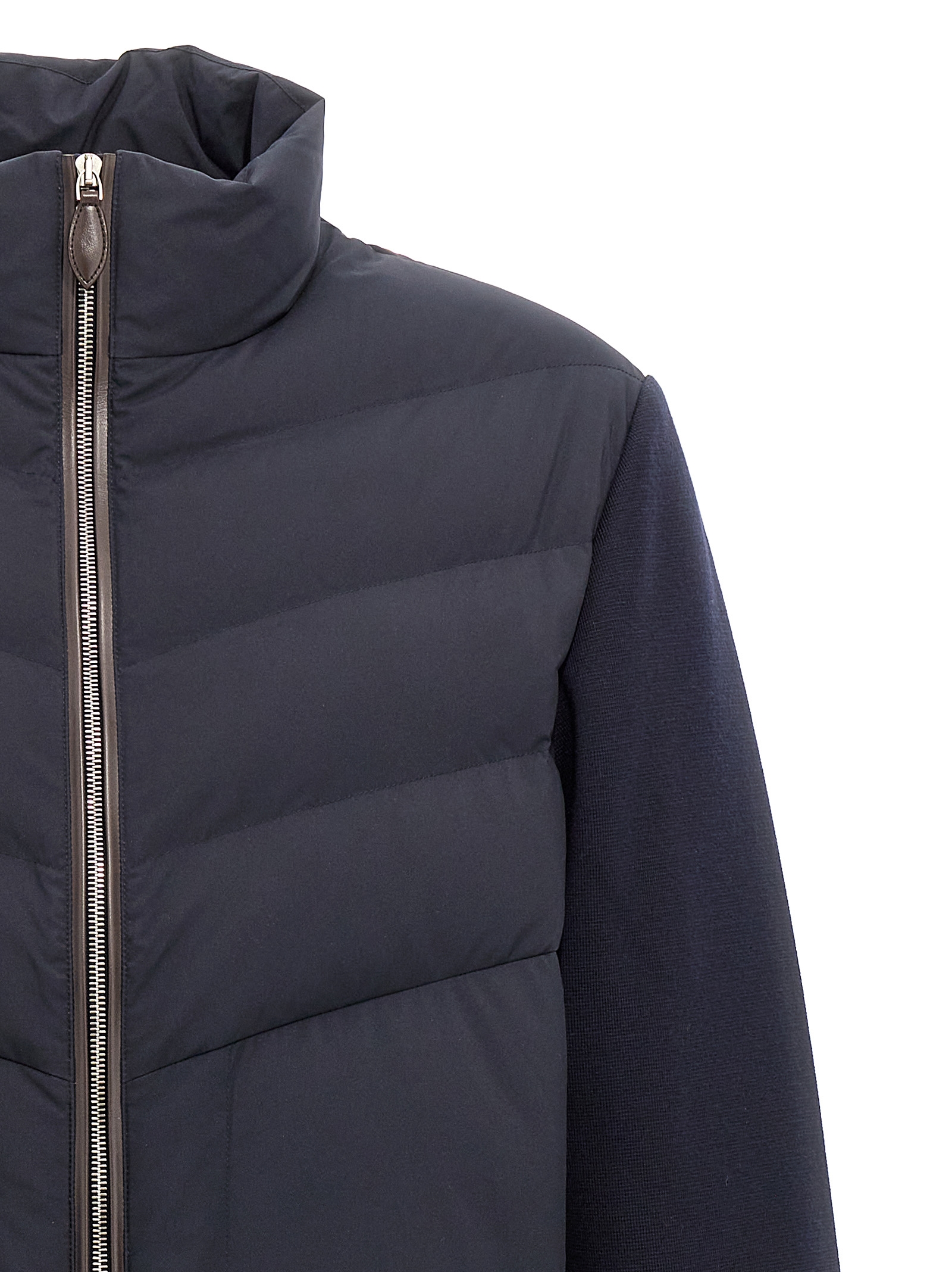 Two-material nylon down jacket, wool knit inserts and leather details, zip closure, long cuffed sleeves.