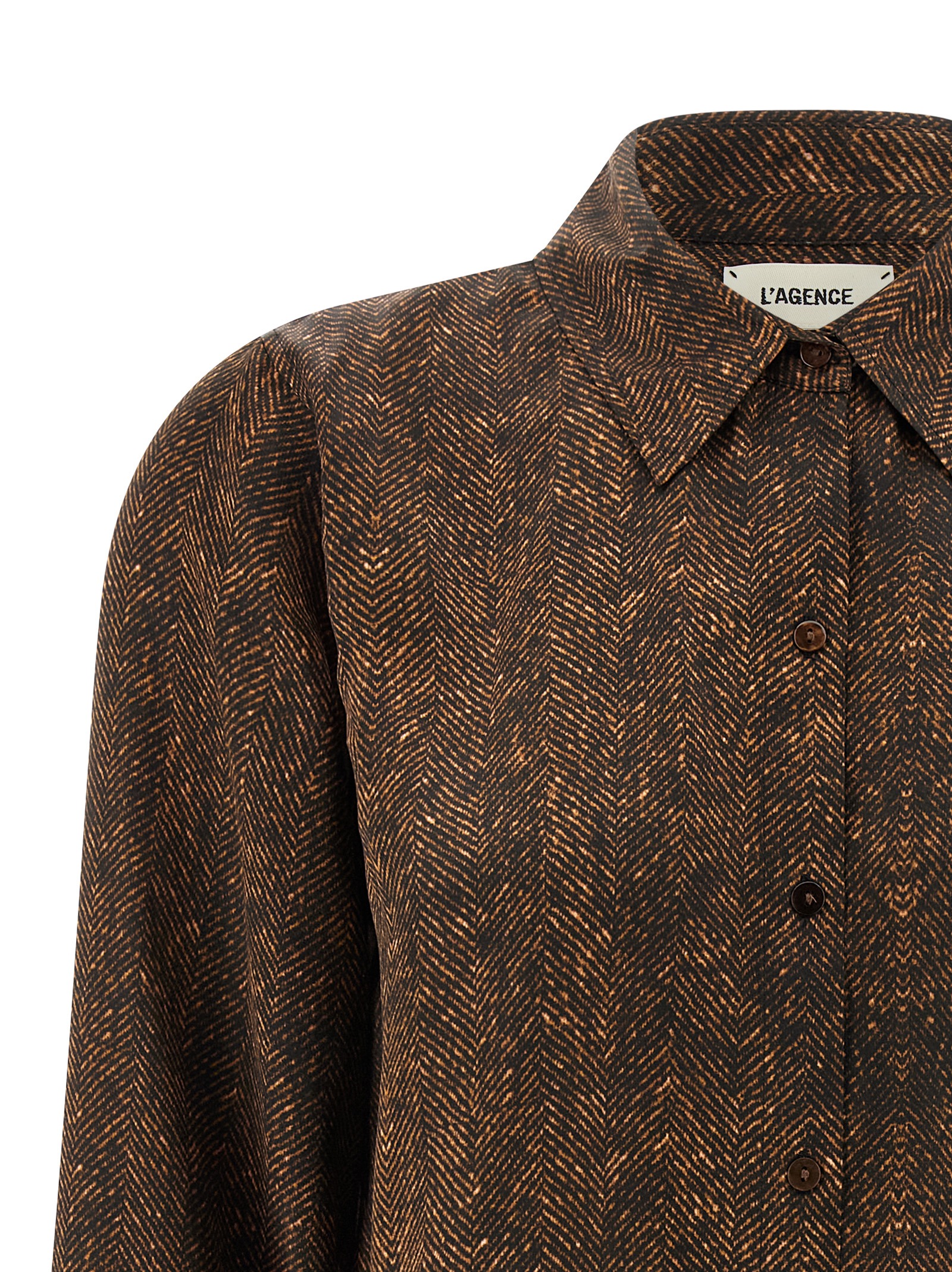 ‘Tyler’ herringbone patterned charmeuse silk shirt, front button closure, long cuffed sleeves.