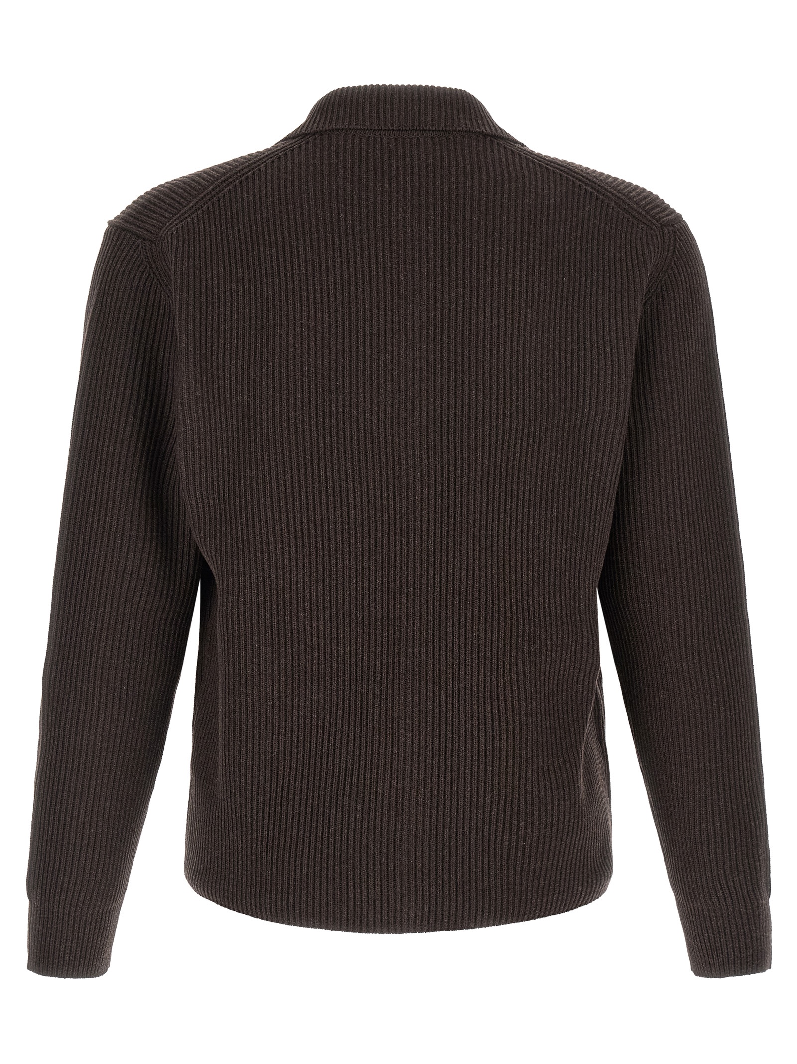 Super 160 ultra-fine knit cardigan with ribbed finish, shirt collar, front button closure, long cuffed sleeves.