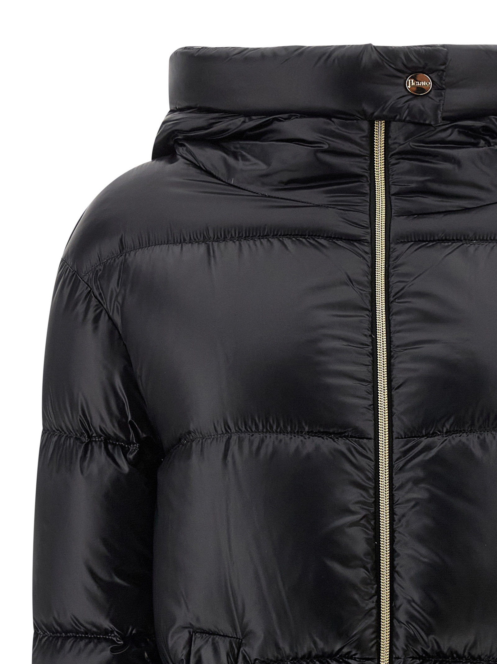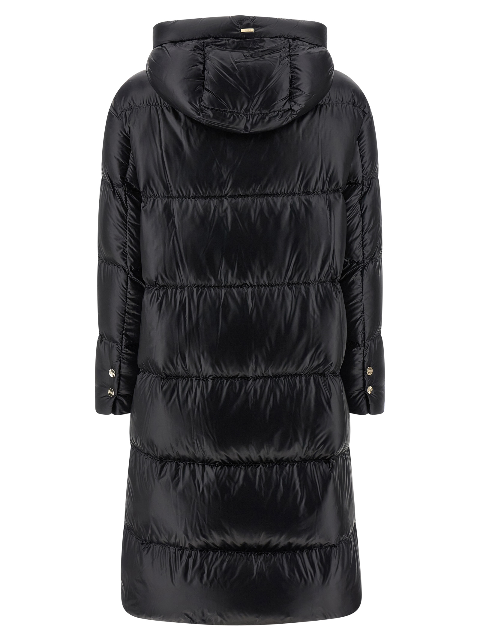 Long down jacket in ultralight quilted nylon with goose feather padding, hood, high neck, front zip closure, pockets, long sleeves.