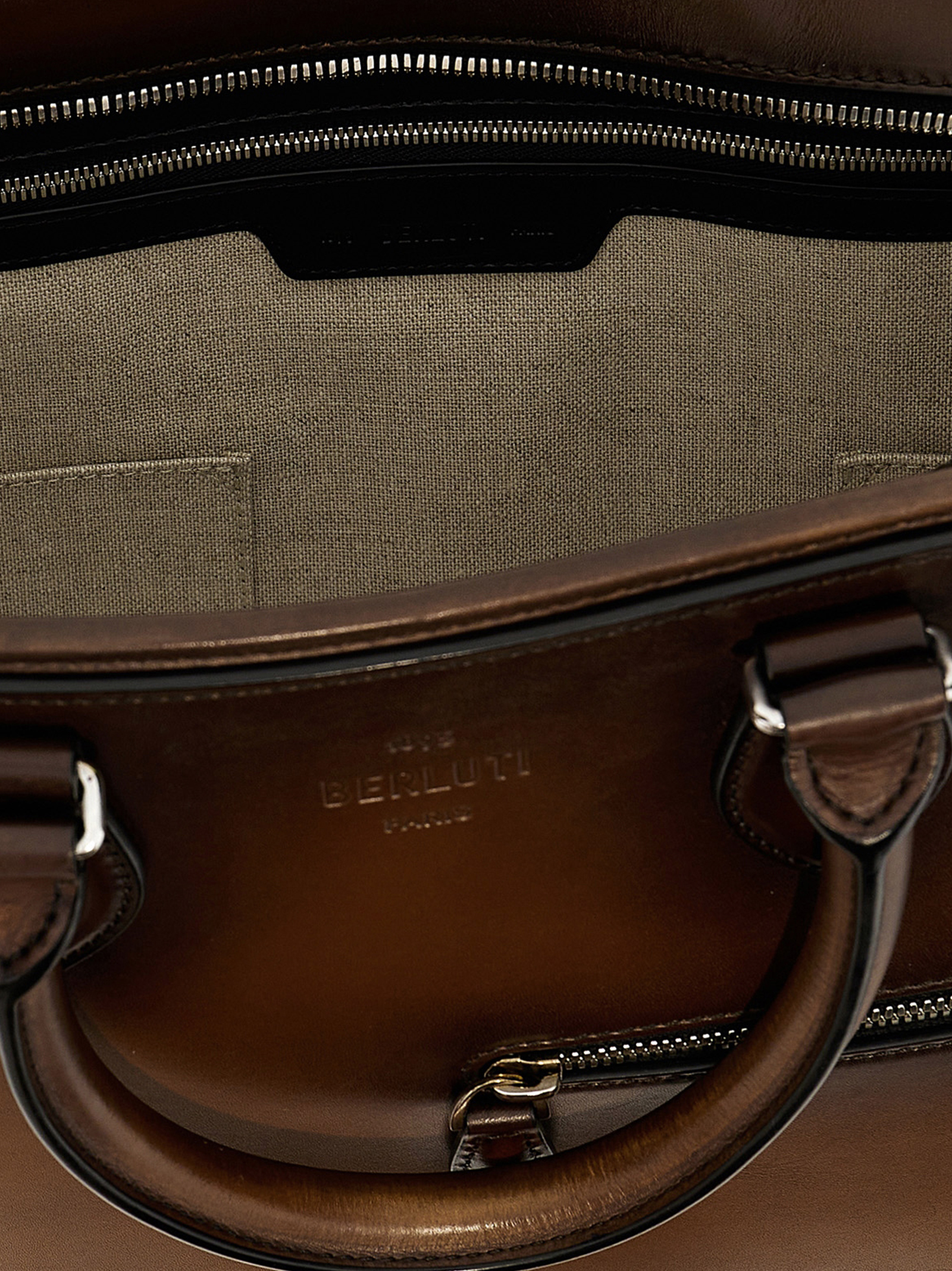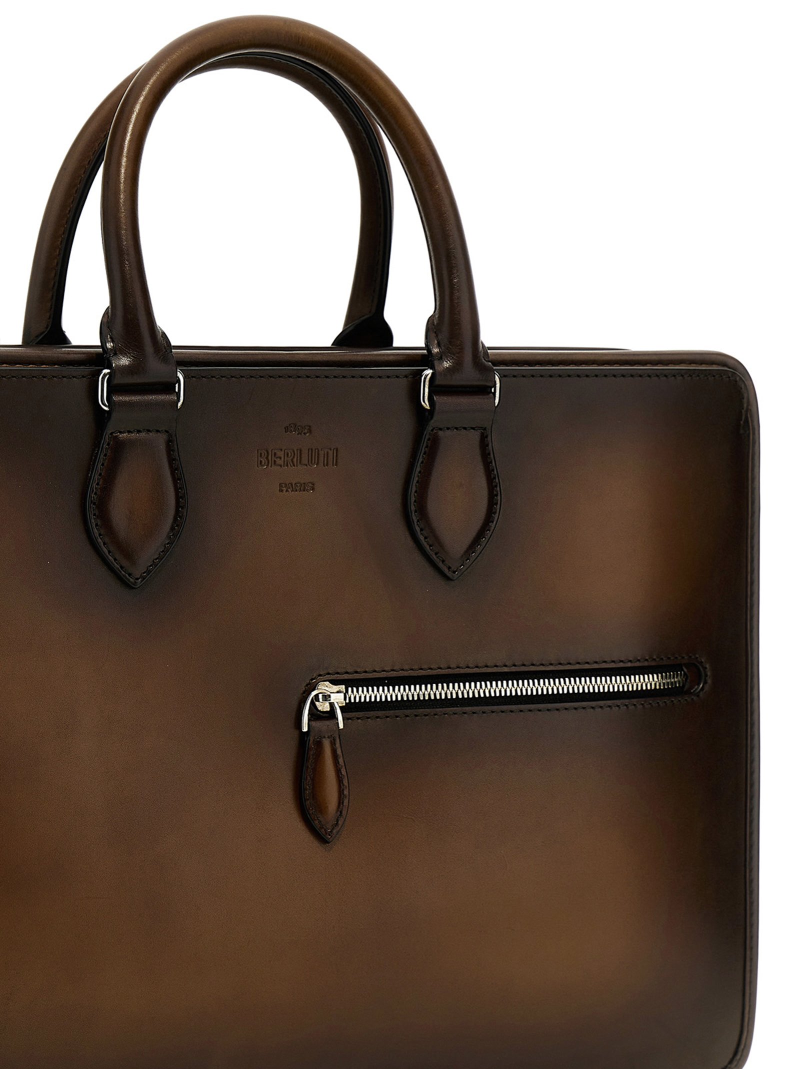 ‘Un Jour’ leather briefcase with double slider zipper closure, front zip pocket, and adjustable and removable shoulder strap.