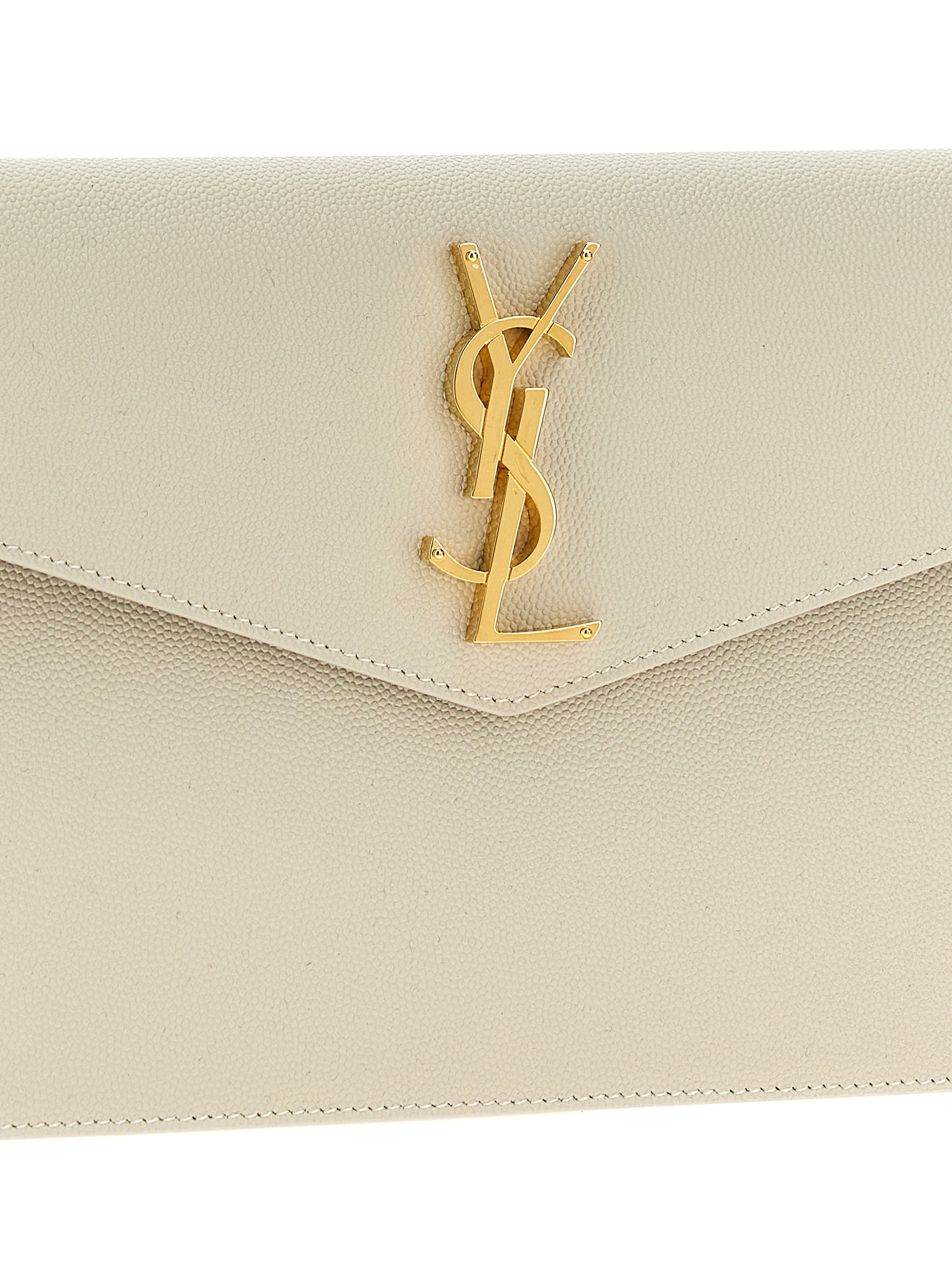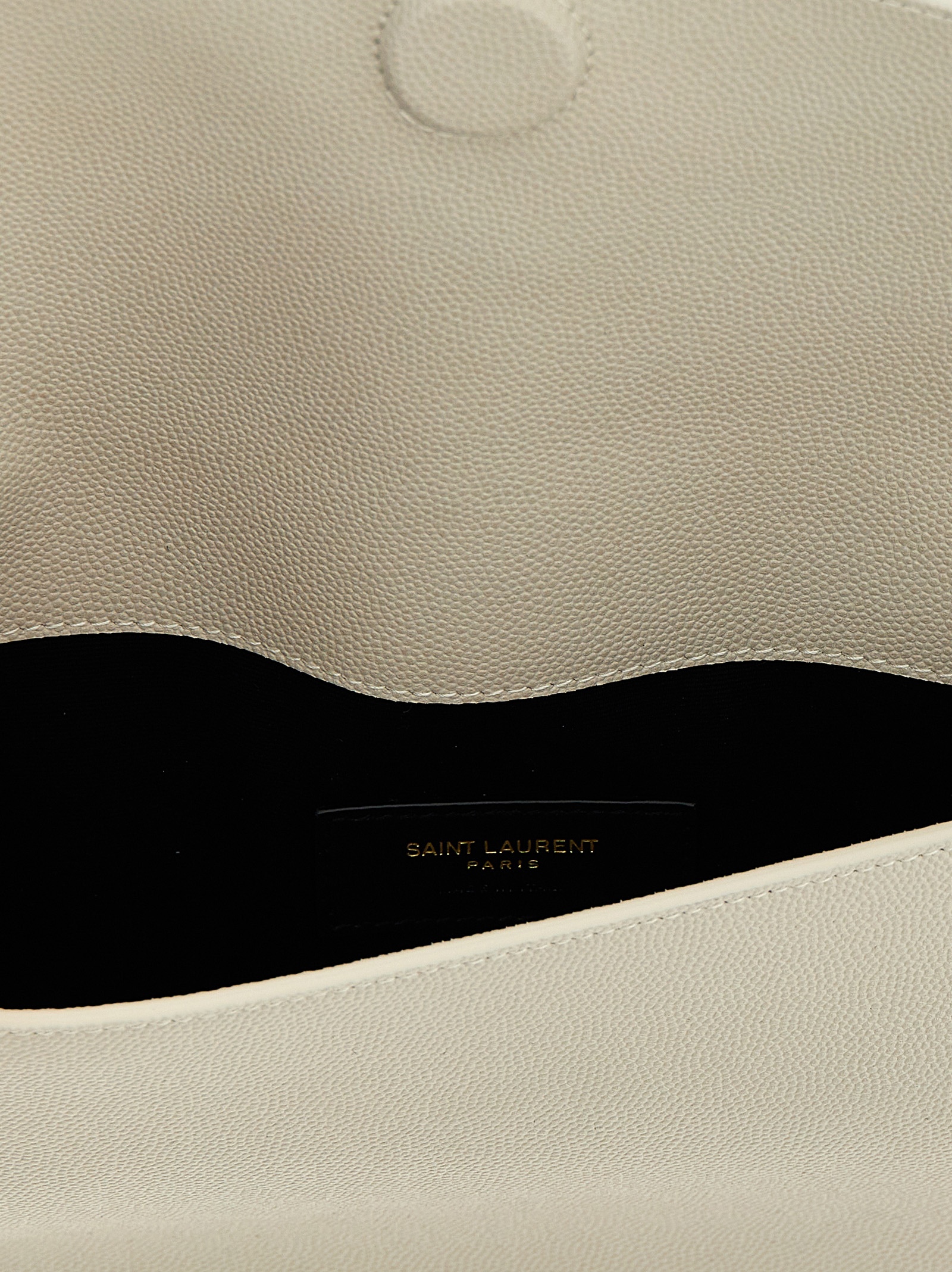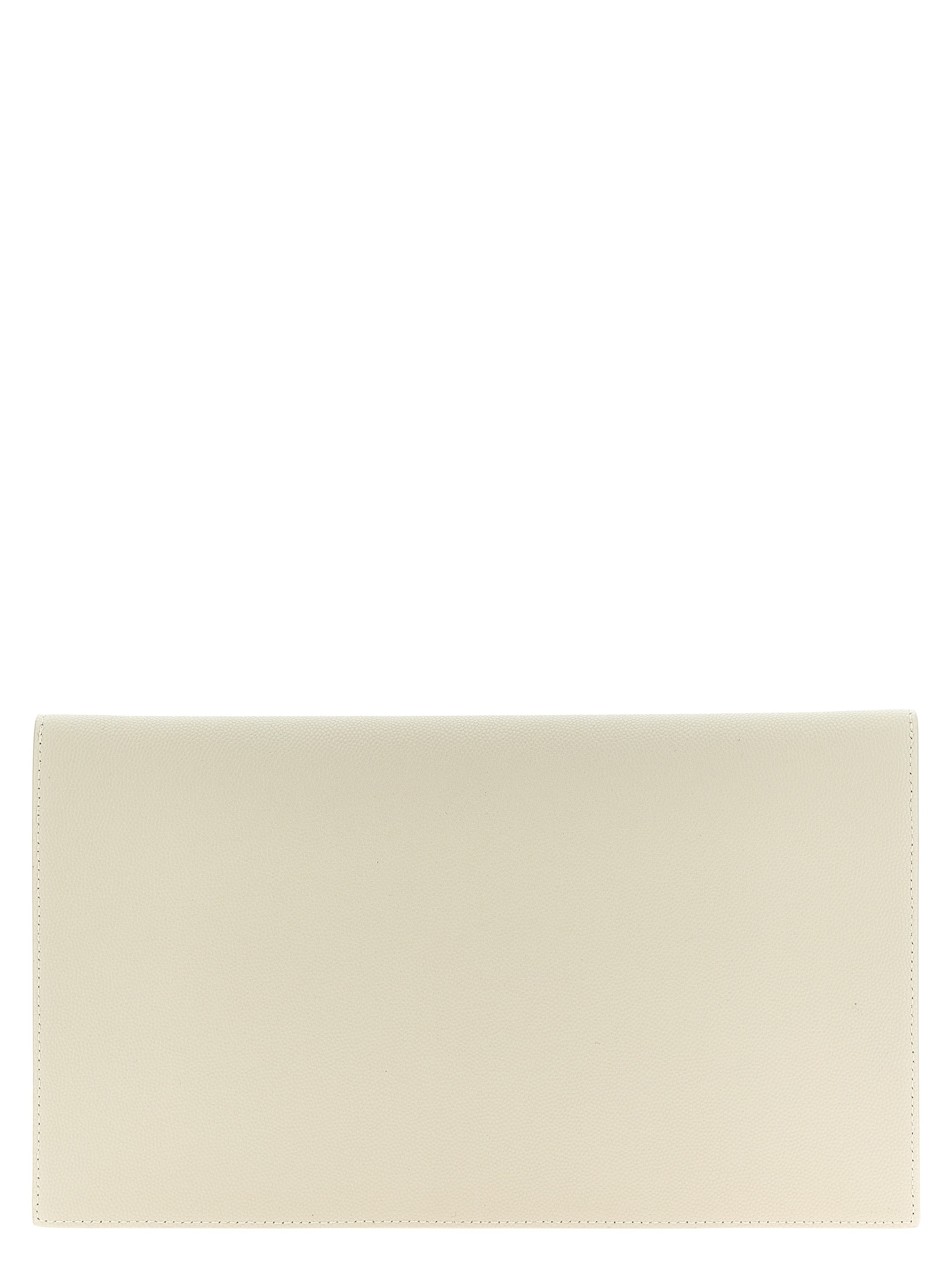 ‘Uptown’ clutch bag in grain de poudre leather with magnetic flap closure, maxi front metal logo, envelope style.