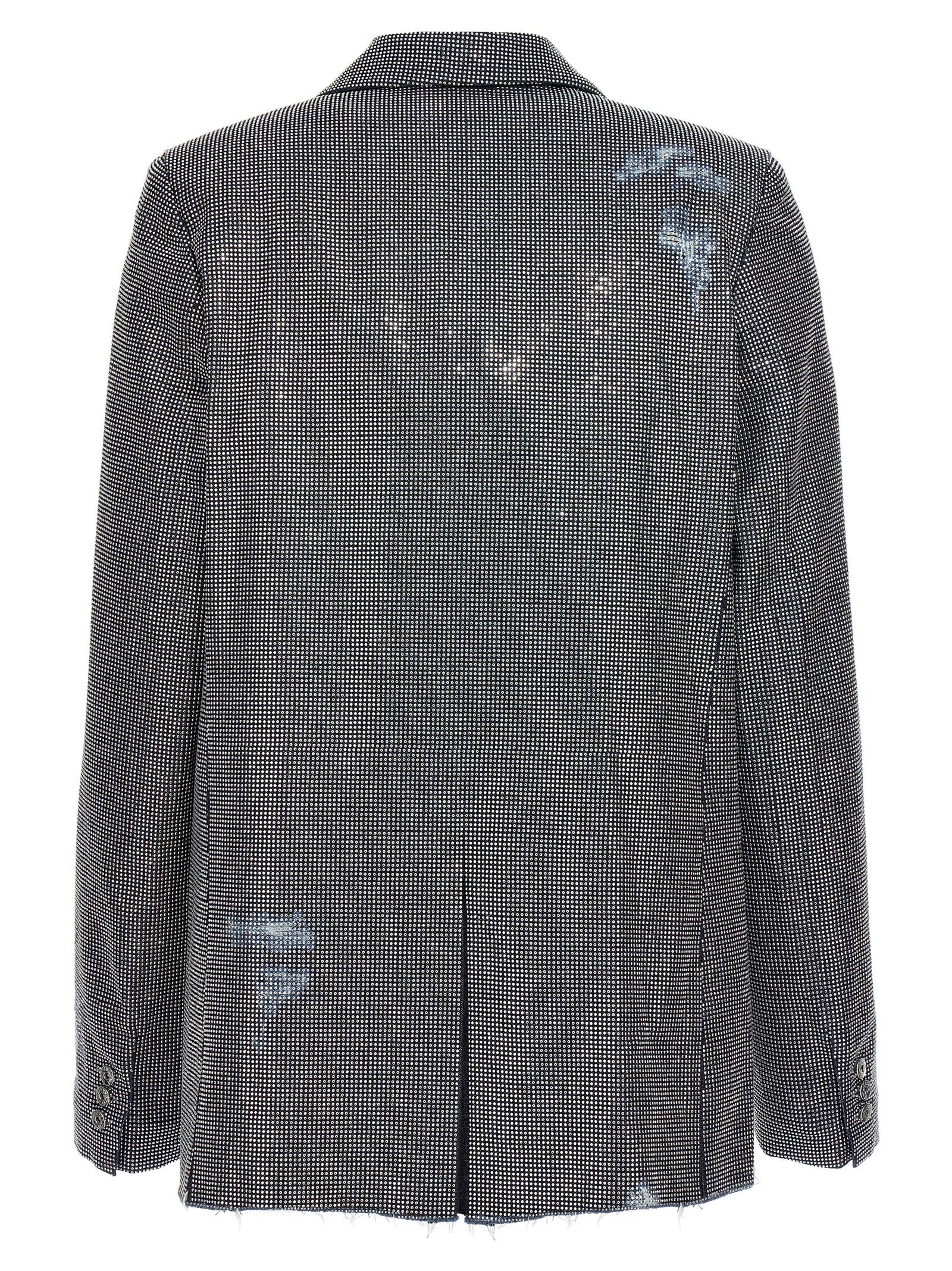Used-effect cotton denim blazer jacket with all-over sequin appliqués, a single breast style with button closure, pockets, long sleeves, back split and frayed hem.
