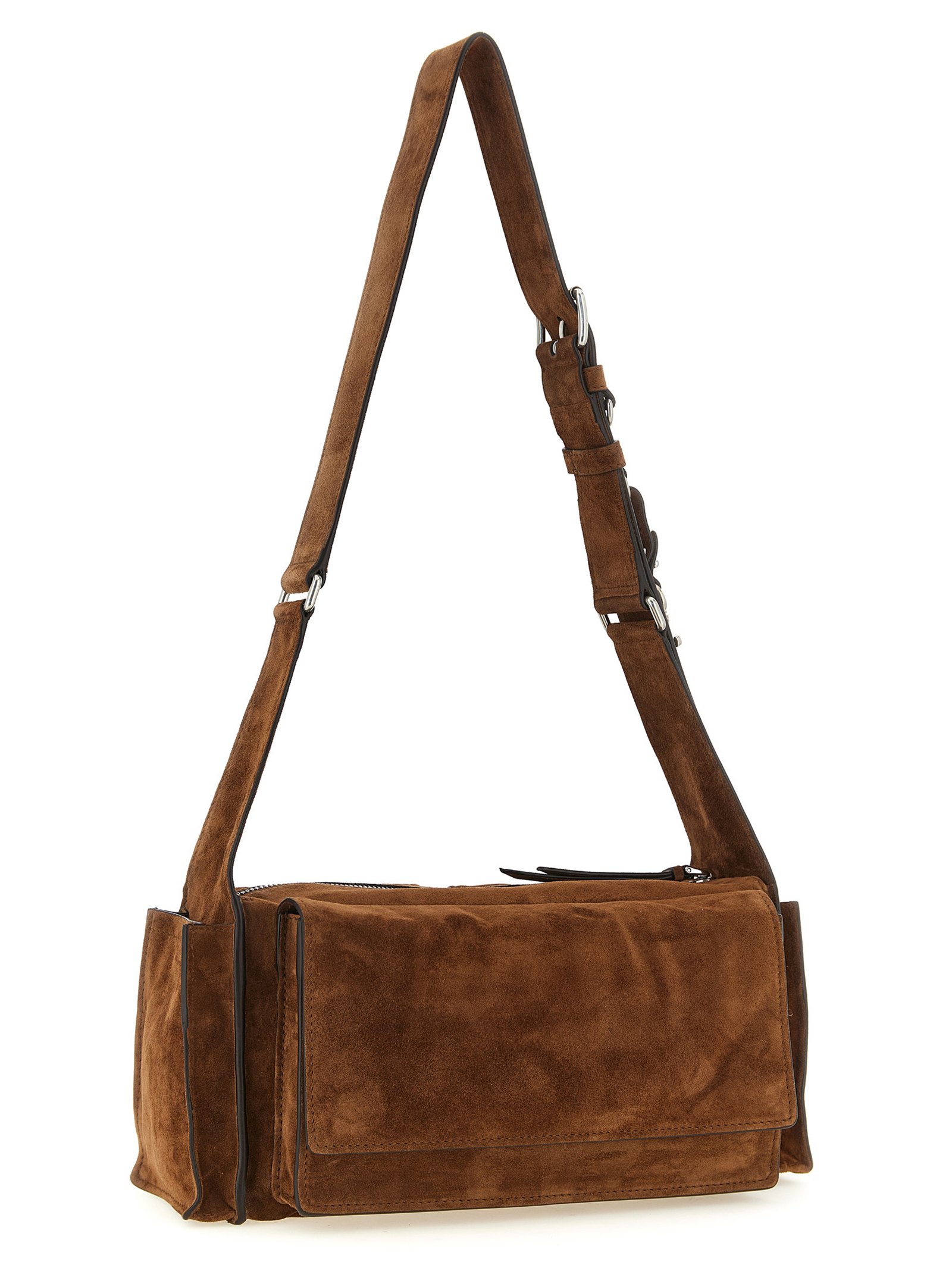 ‘Utilitaire’ suede crossbody bag, multi-pocket style, tone-on-tone lettering logo patch on the front, top zip closure, cotton satin lining, inner pocket, adjustable shoulder strap.