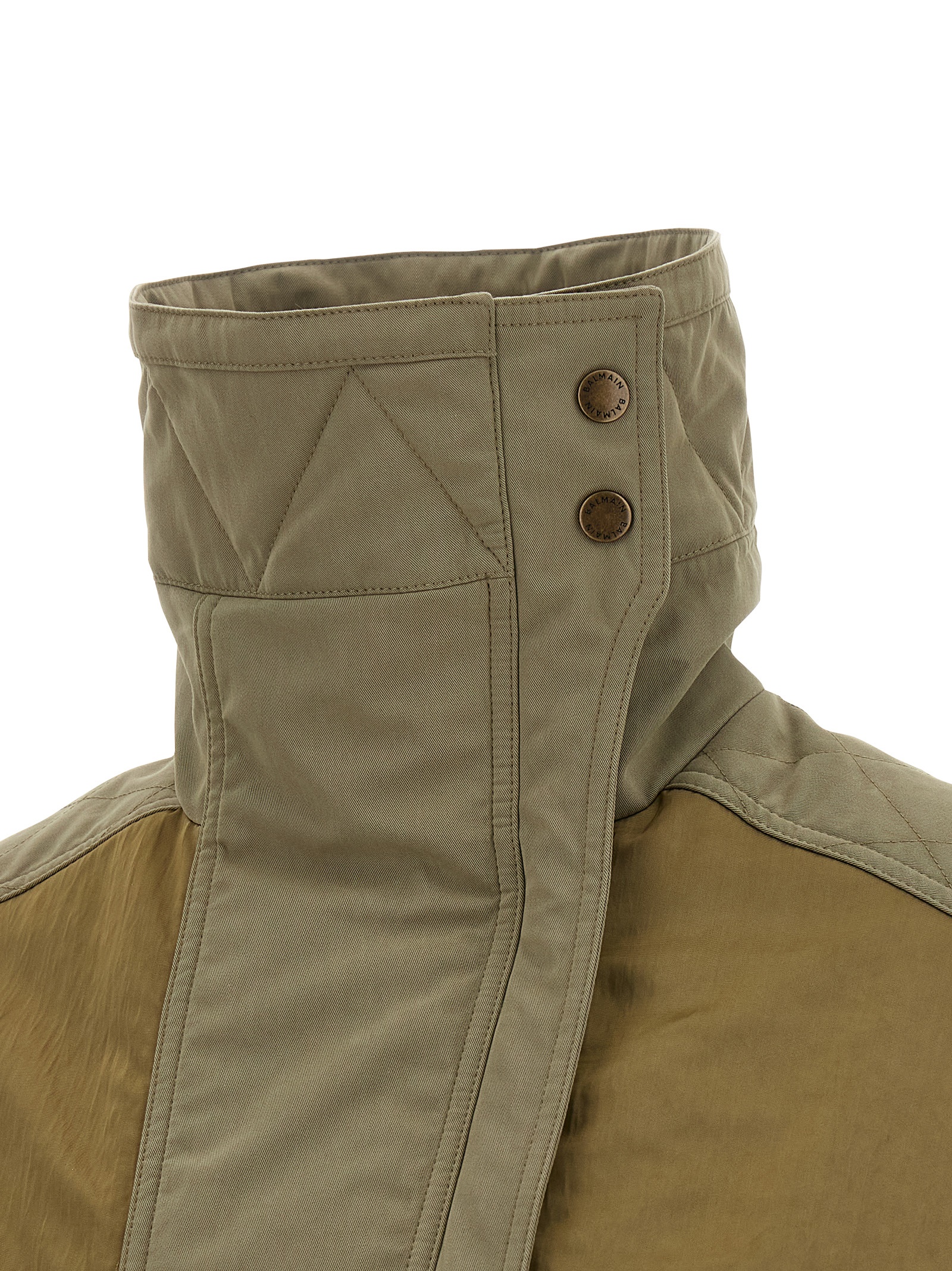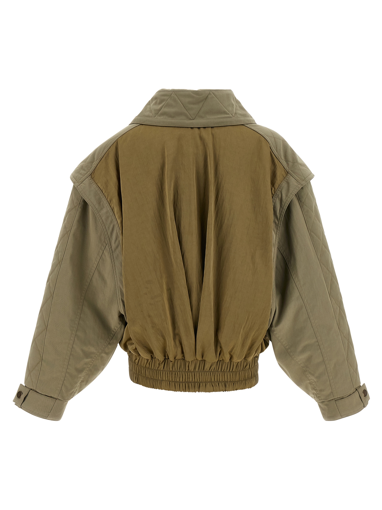 ‘Utility’ inspired cotton and serge bomber jacket, high neck with zigzag stitching, drawstring and snap button closure, pockets, wide long sleeves with adjustable cuffs and dropped shoulder, front zip closure, elastic and drawstring on the hem, lining.