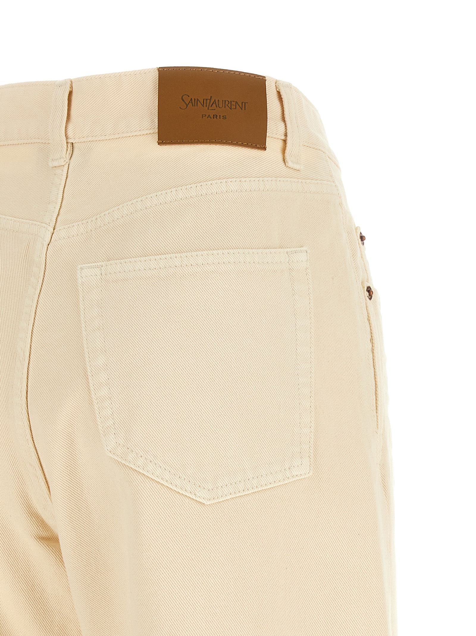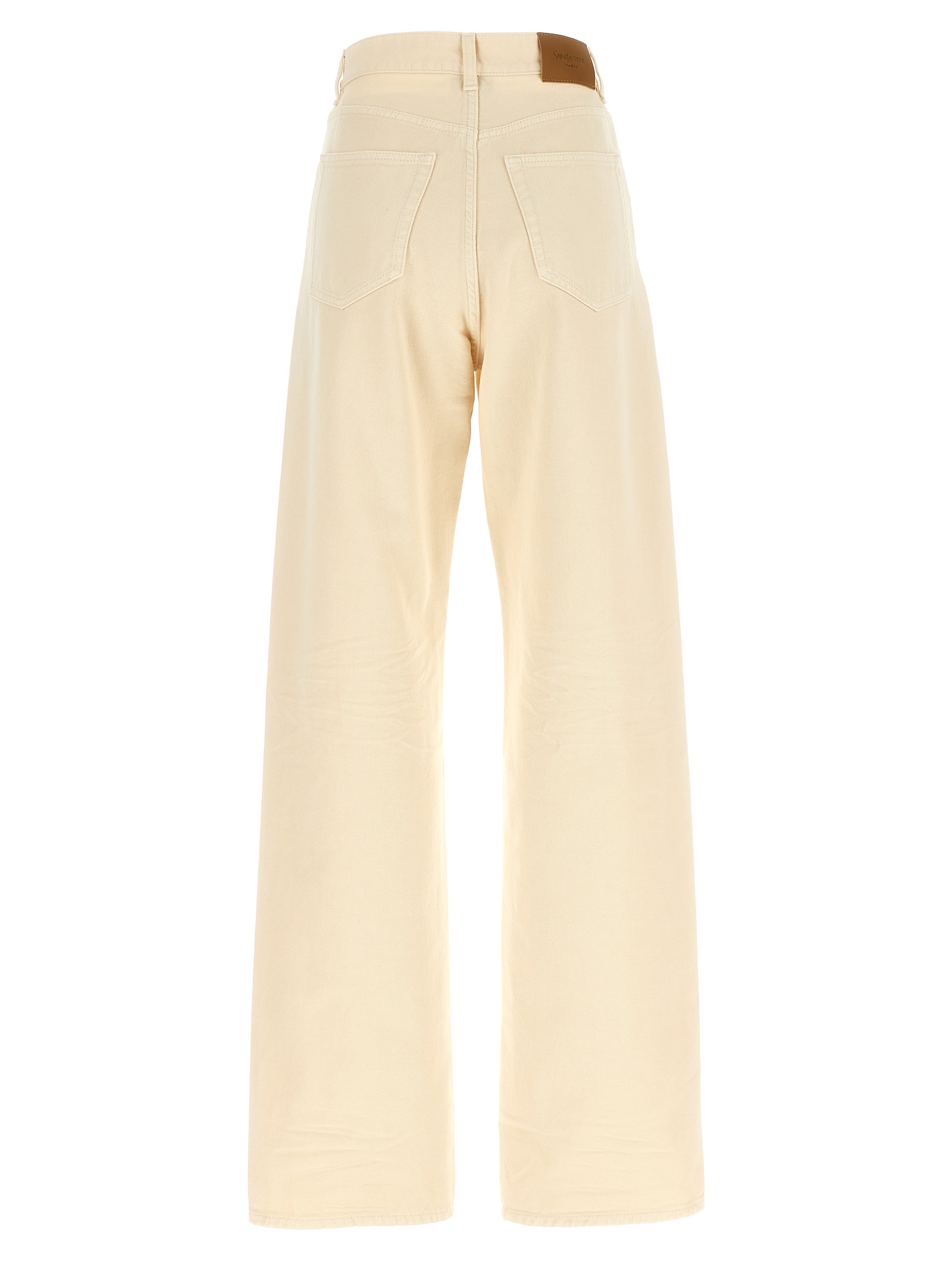 French denim jeans with wrinkled effect details, high waist with V-shaped front, wide straight leg, front button closure, five pockets, and leather logo label at the back.