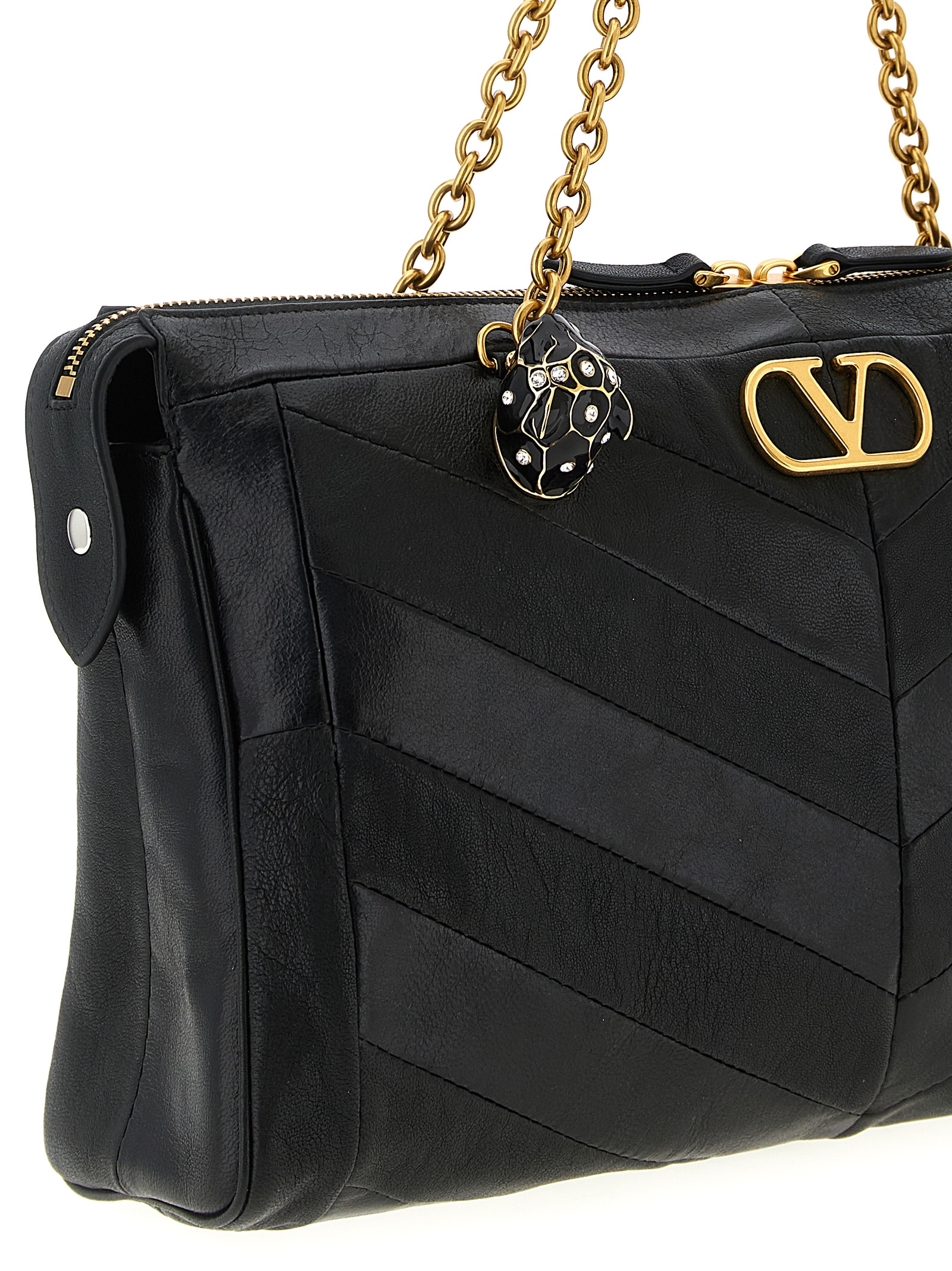 ‘Panthea’ patchwork shoulder bag in glossy nappa leather and matte chevron pattern, double fixed chain handle with glazed feline heads decorated with Swarovski® crystals, VLogo Signature metallic antiqued effect on the front, top zip closure, adjustable and removable shoulder strap.