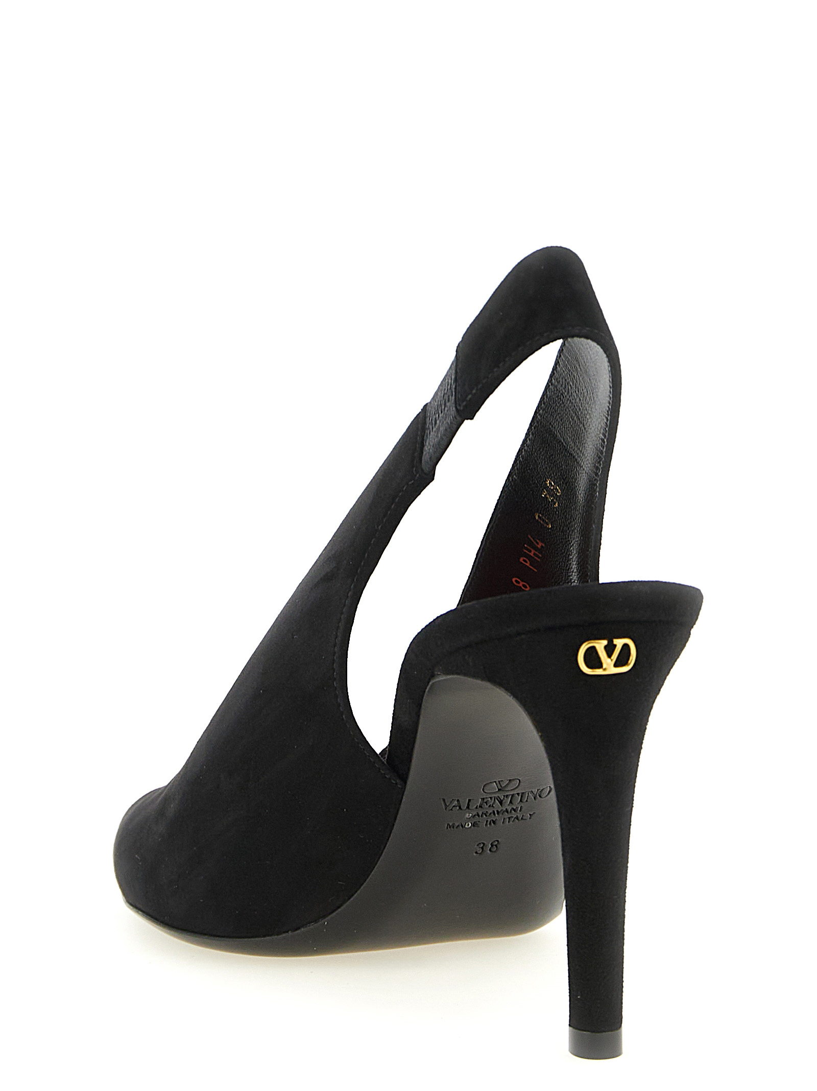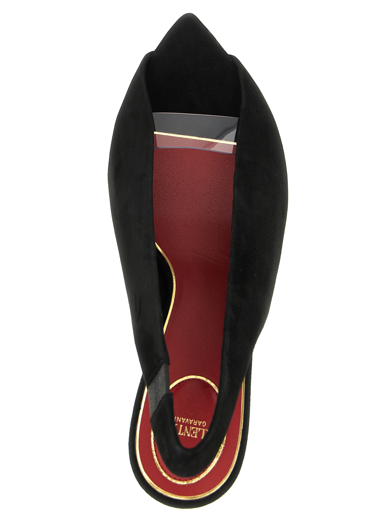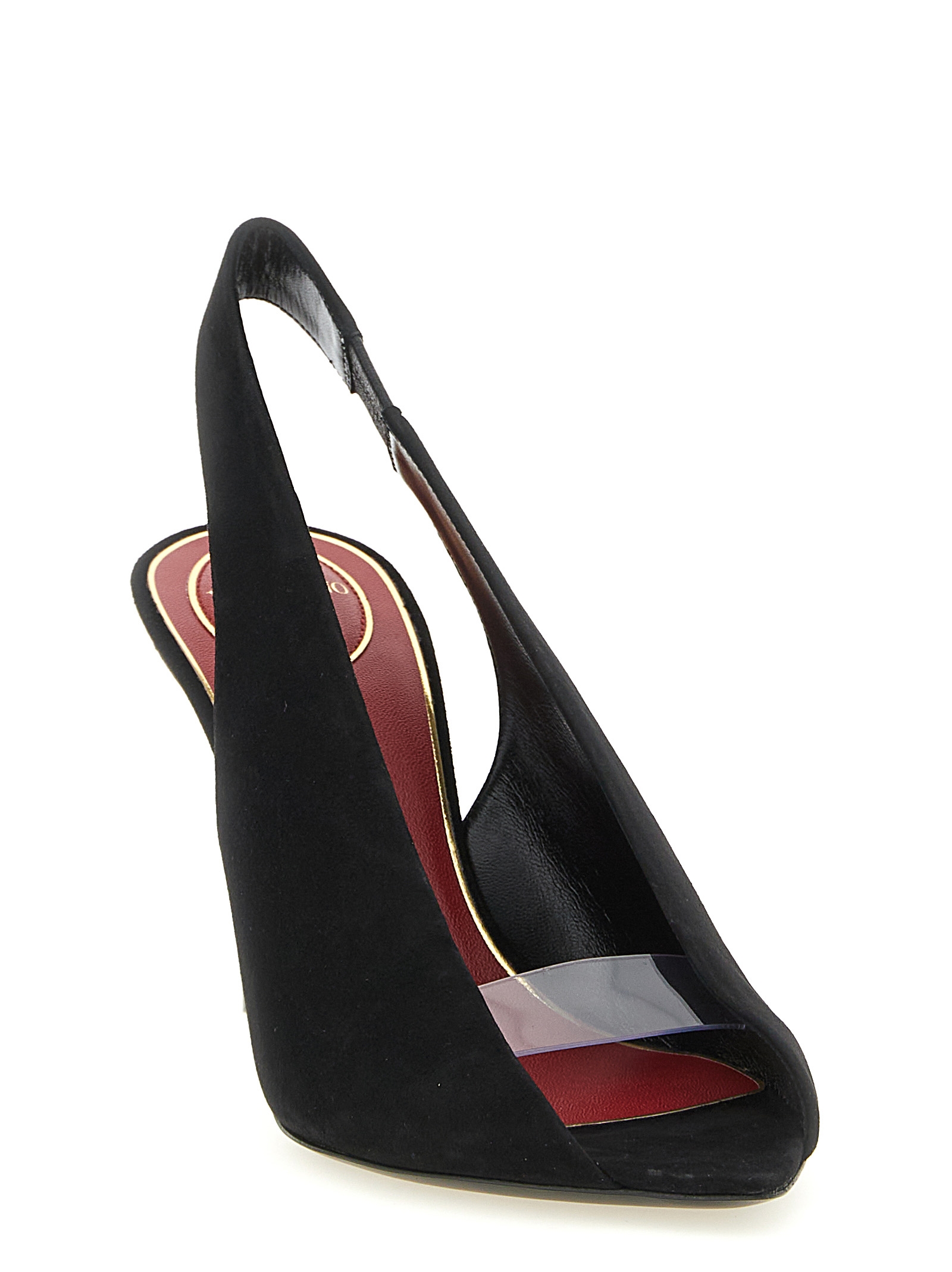 ‘Révélé’ suede slingbacks, open-toe pointed model with transparent polymer material band, heel with antiqued brass finish metal ‘VLogo Signature’ applied, leather sole.
