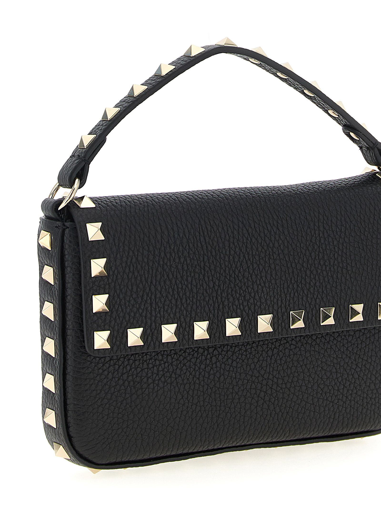 ‘Rockstud’ mini handbag in calf leather with elk effect effect with stud application, fixed handle, magnetic flap closure, back embossed logo, removable shoulder strap.