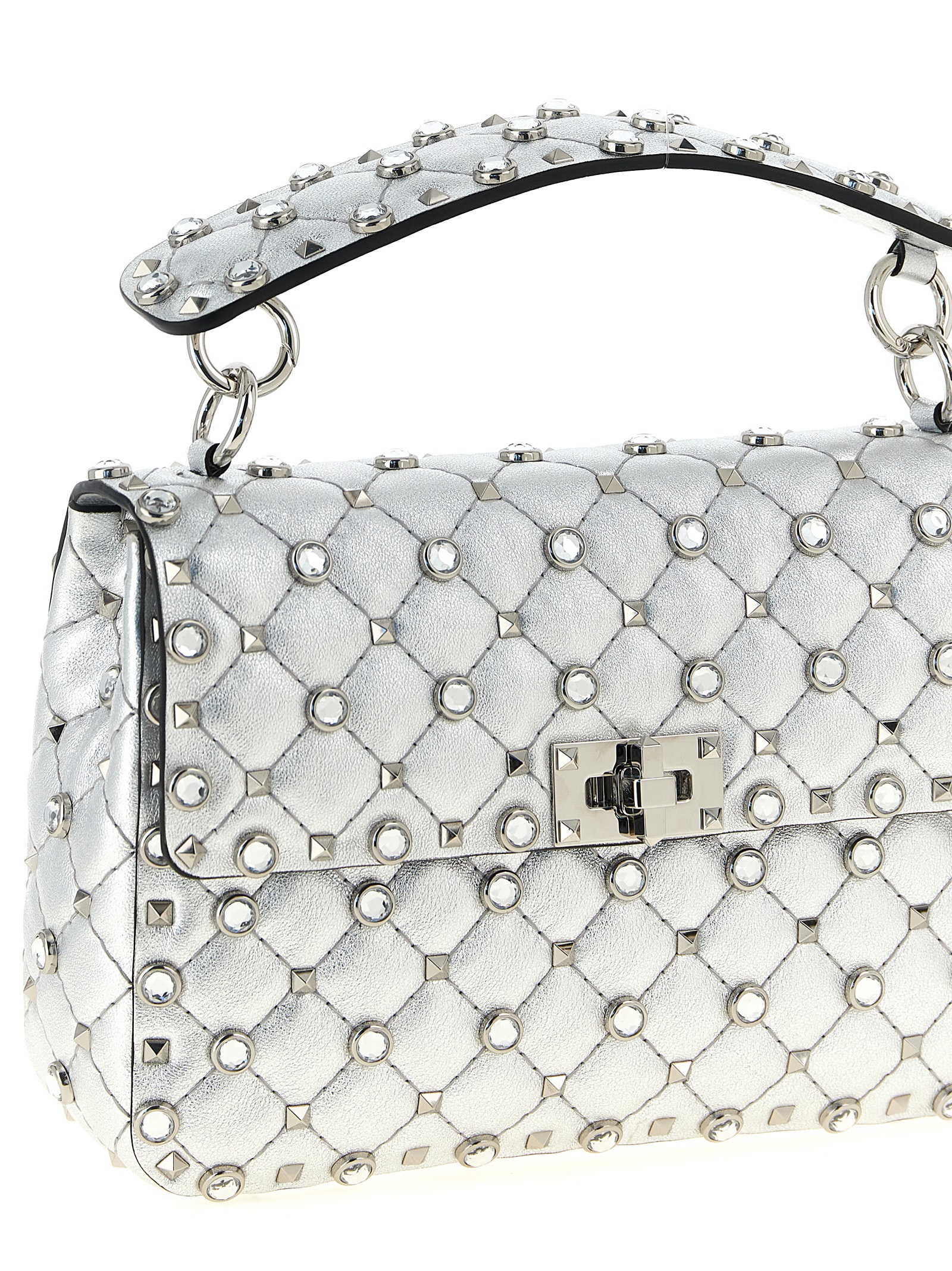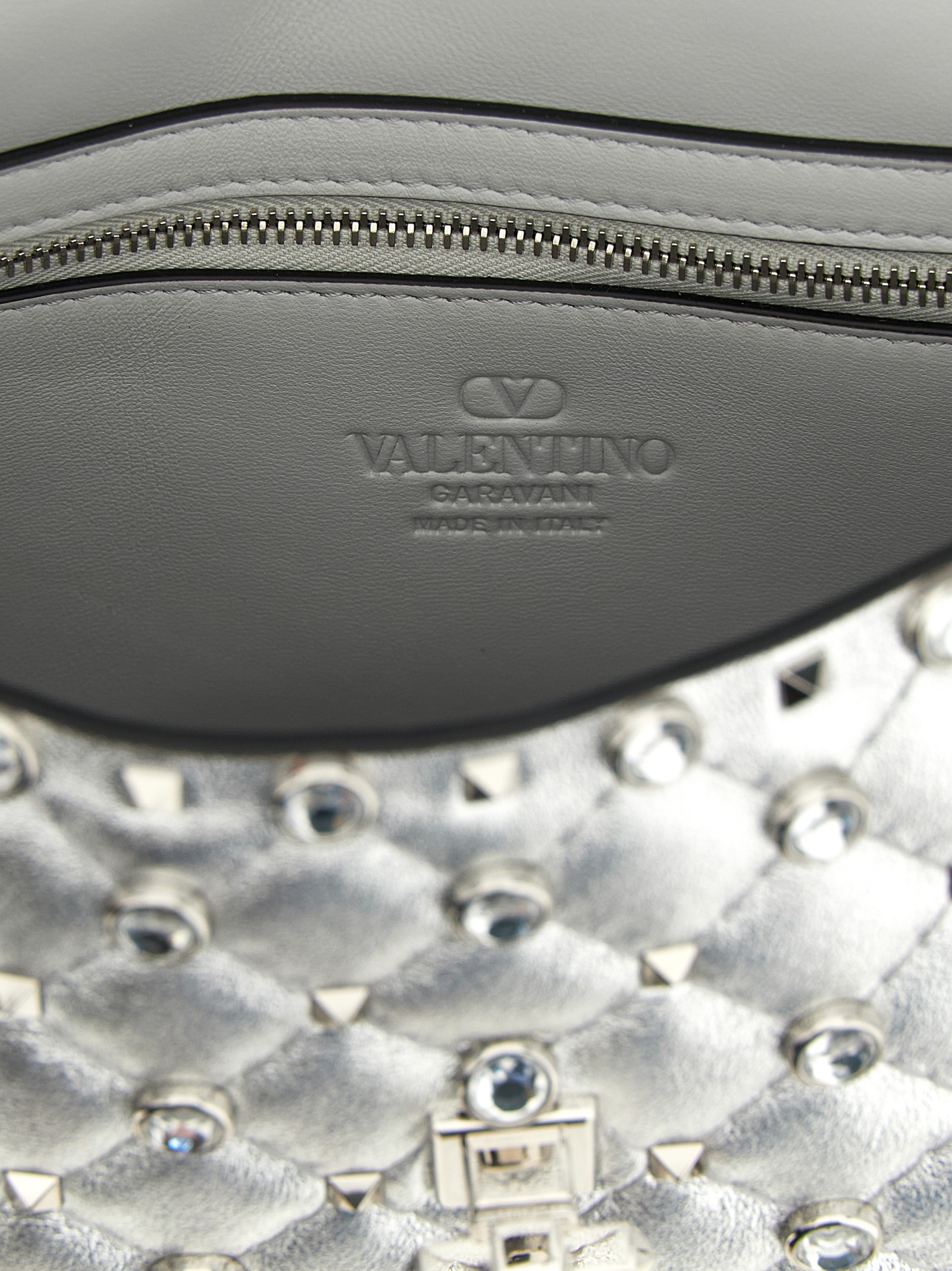 ‘Rockstud Spike’ shoulder bag in laminated soft nappa leather with metalicche studs and all-over cabochon, flap closure with metal spin, removable handle, nappa lining, two inner pockets, removable chain shoulder strap.