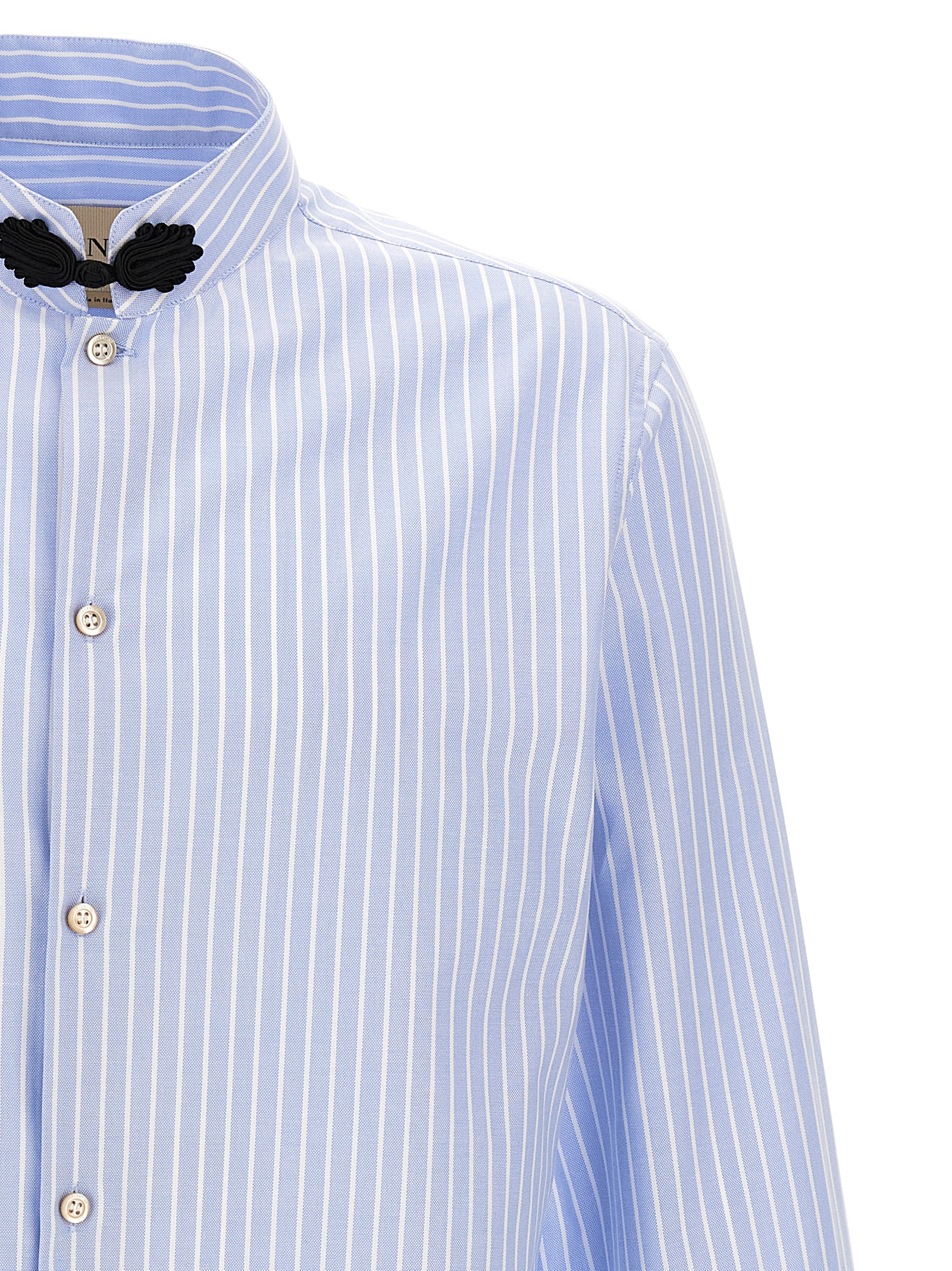 Striped Oxford cotton shirt, with mandarin collar with frog closure, front button closure, long cuffed sleeves, side slits.