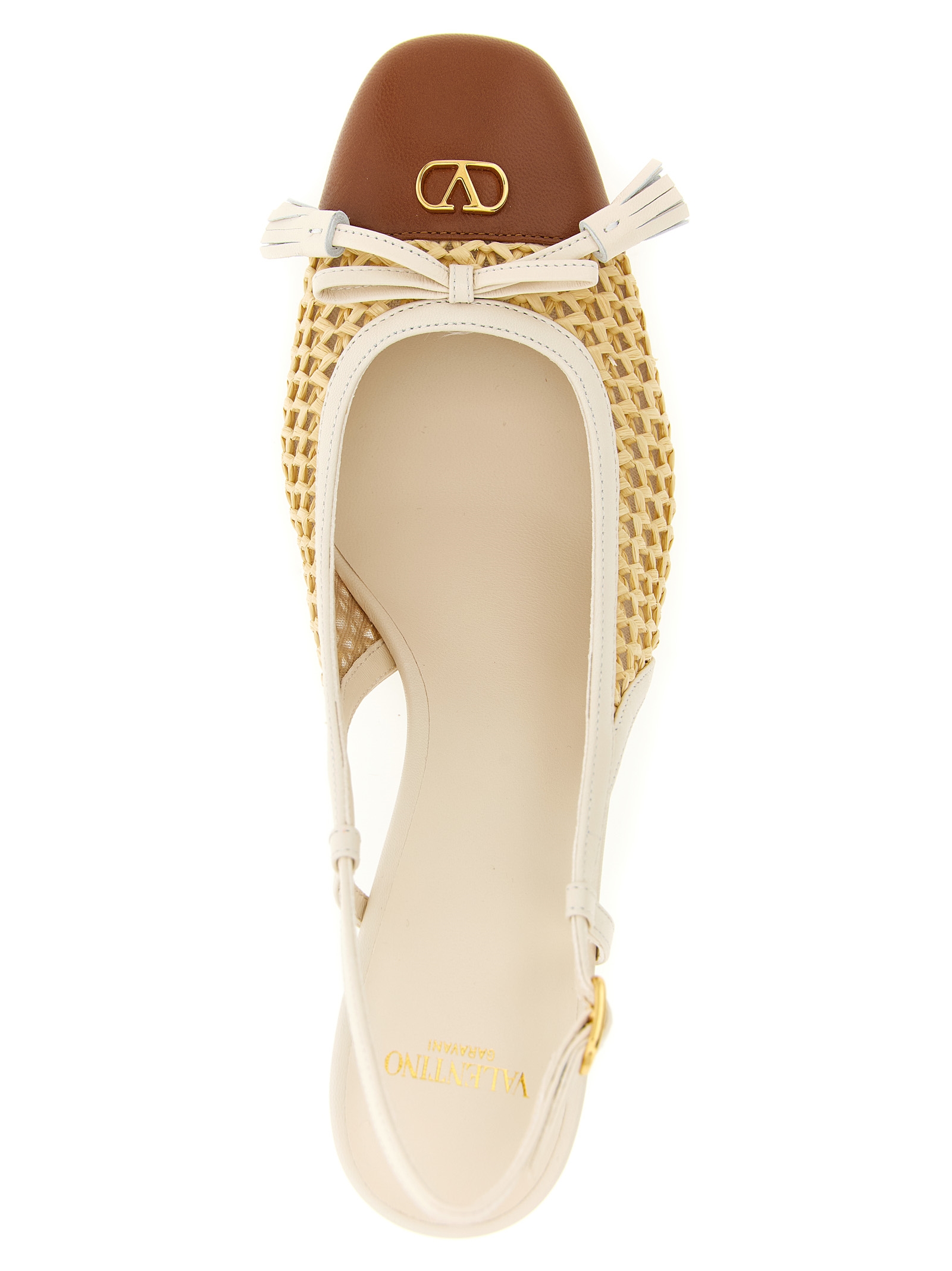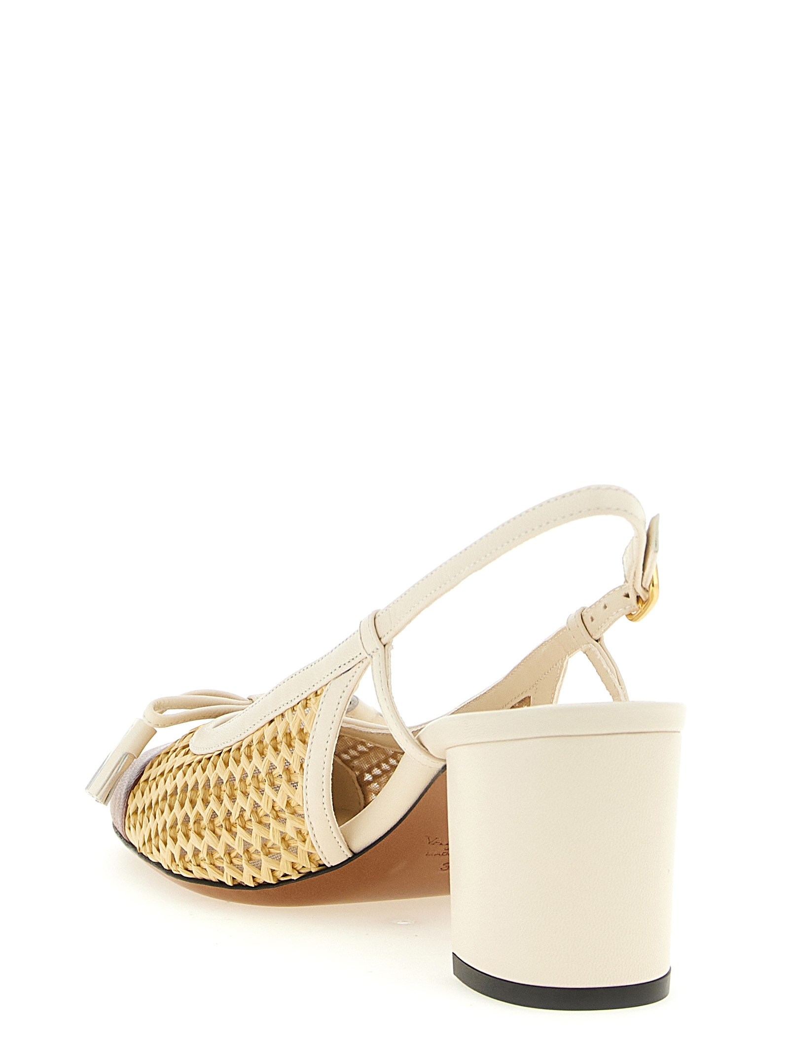 ‘Valet Du Roi’ mesh slingbacks covered with woven raffia and kid leather, square toe contrast with antiqued metallic ‘VLogo Signature’ and bow with front tassels, adjustable strap, wide heel, leather sole.