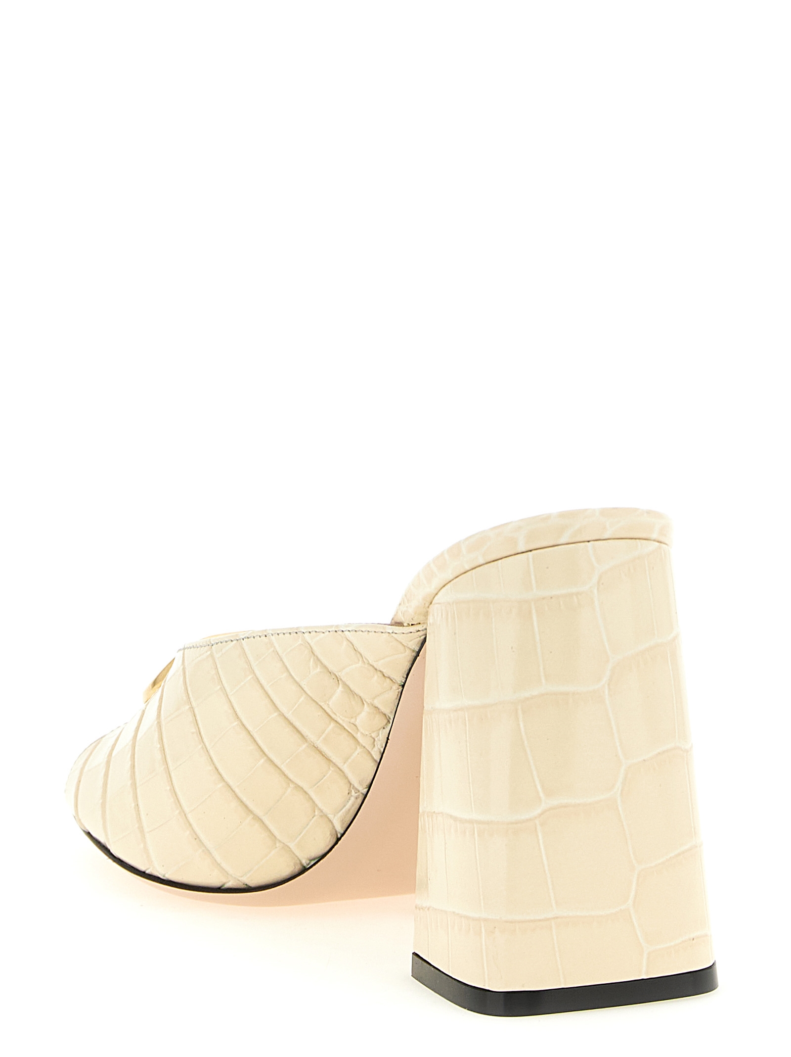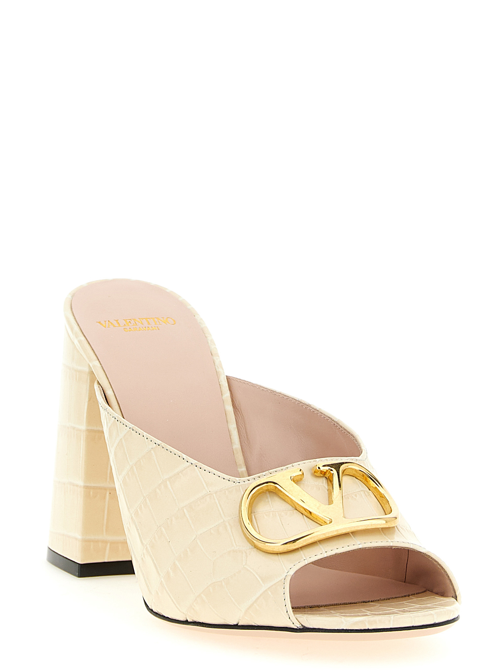 Slides in calf leather with crocodile effect print, metallic ‘Vlogo Signature’ brass finish with antique effect on the front, wide covered heel, leather sole with rubber heel.
