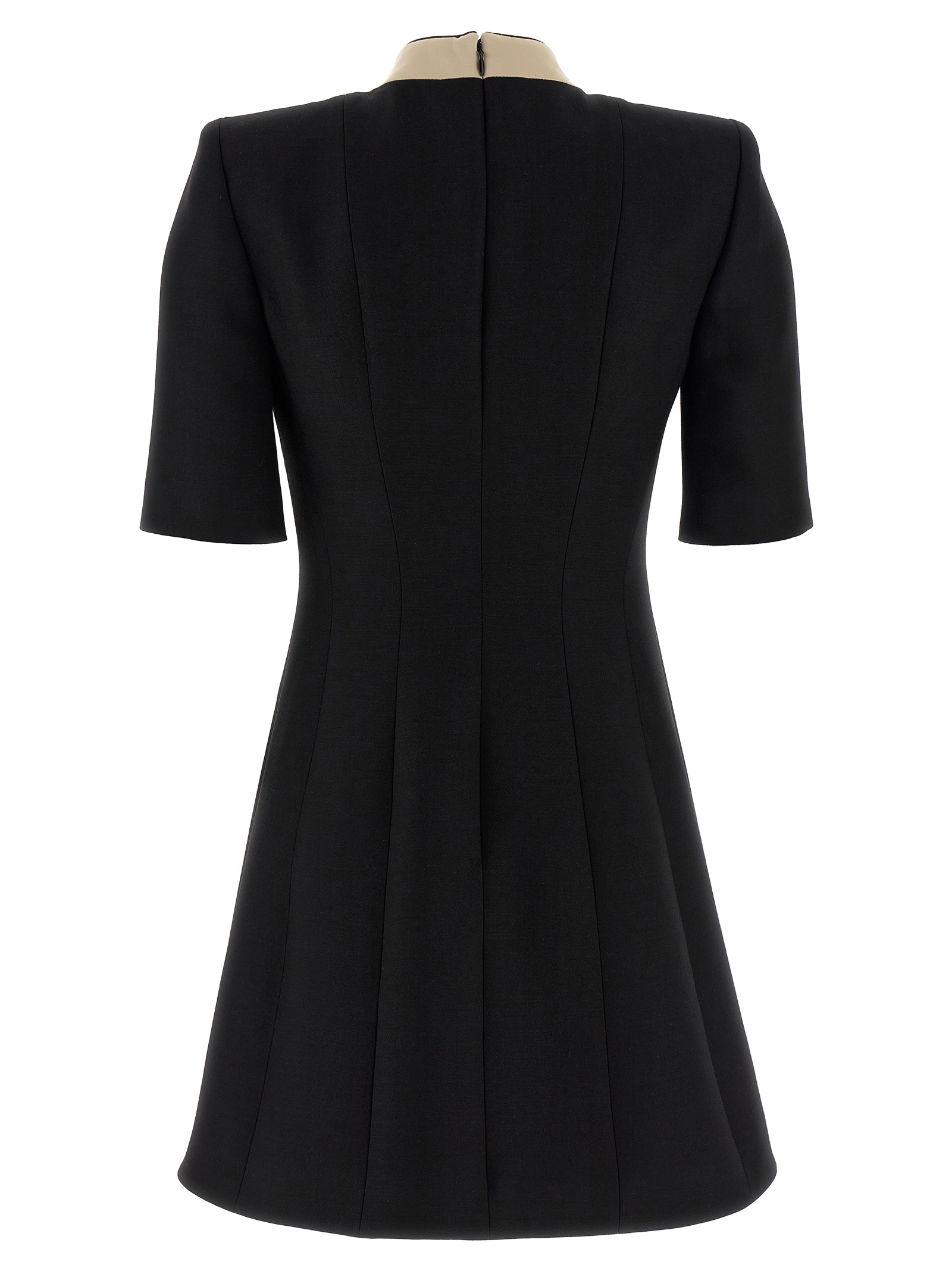 Virgin wool mini dress with hourglass silhouette, front and back pincer, high neck and contrast silk bow detail, short sleeves with padded shoulder straps, back zip closure, monogram lining.
