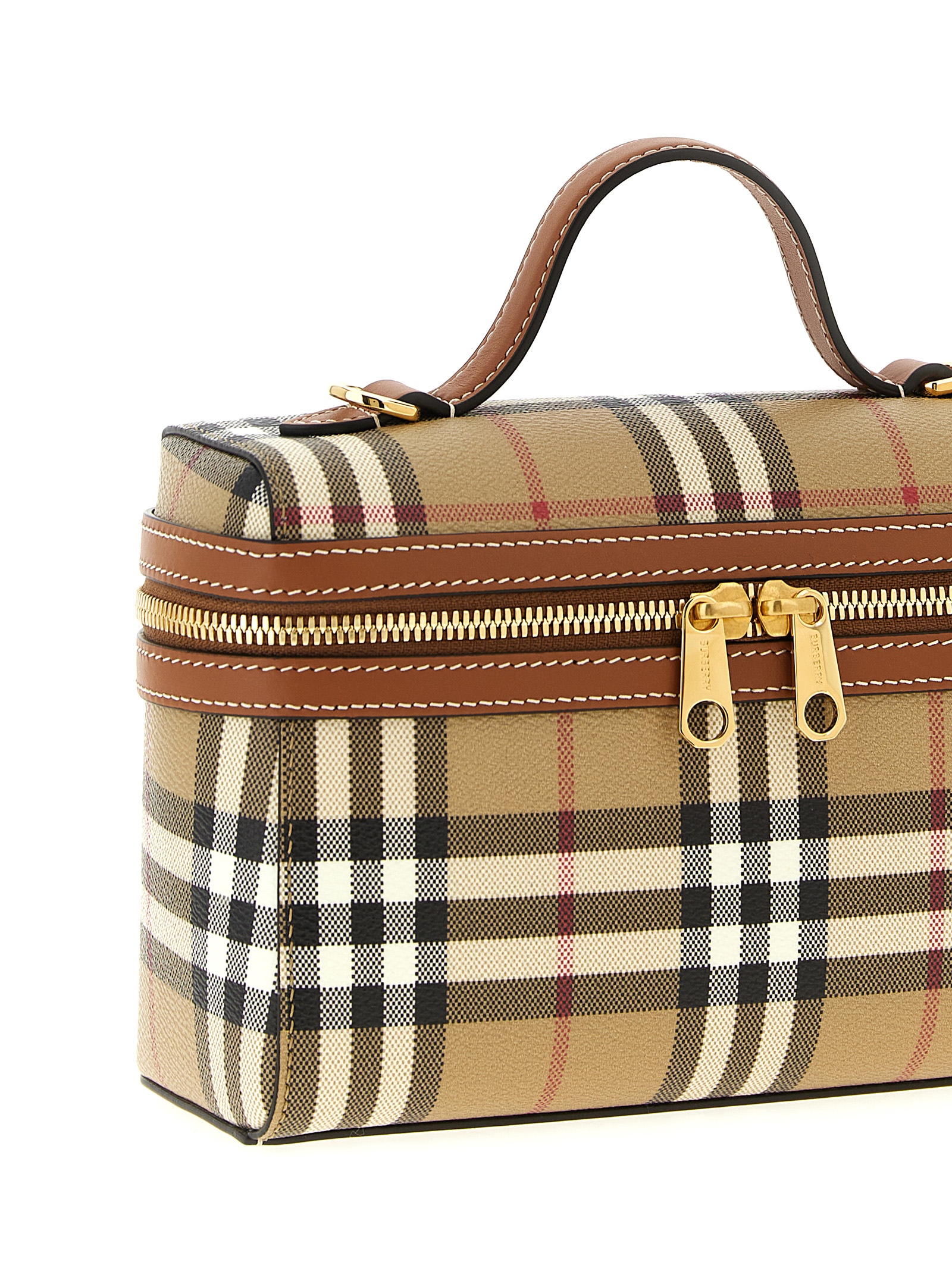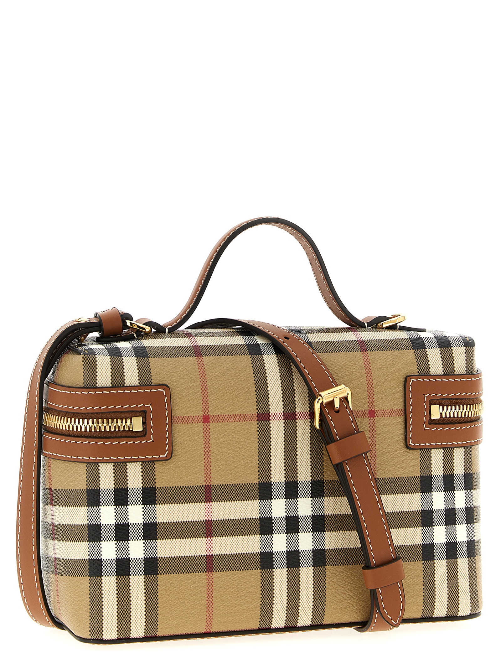 ‘Vanity case’ checkered leather crossbody bag with top case model with fixed handle, double slider zip closure, adjustable and removable leather shoulder strap.