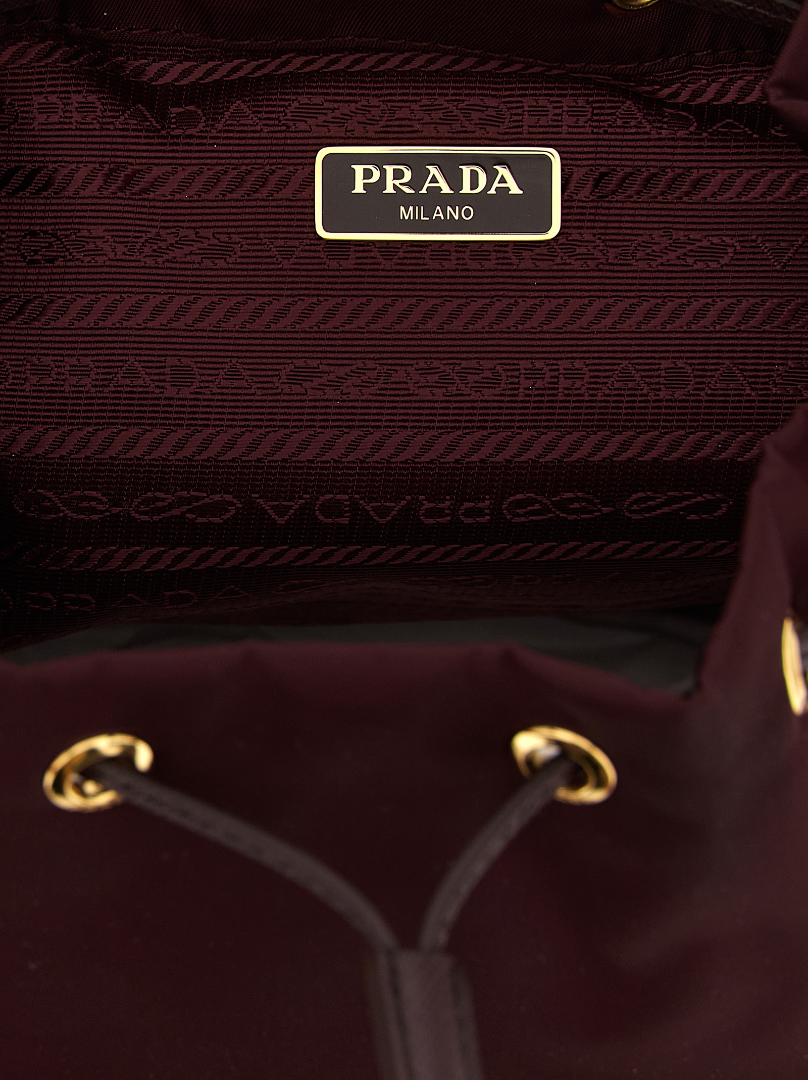 Bucket bag in vela fabric with drawstring closure, fixed handle in saffiano leather, zipped pocket and enamelled triangle logo.
