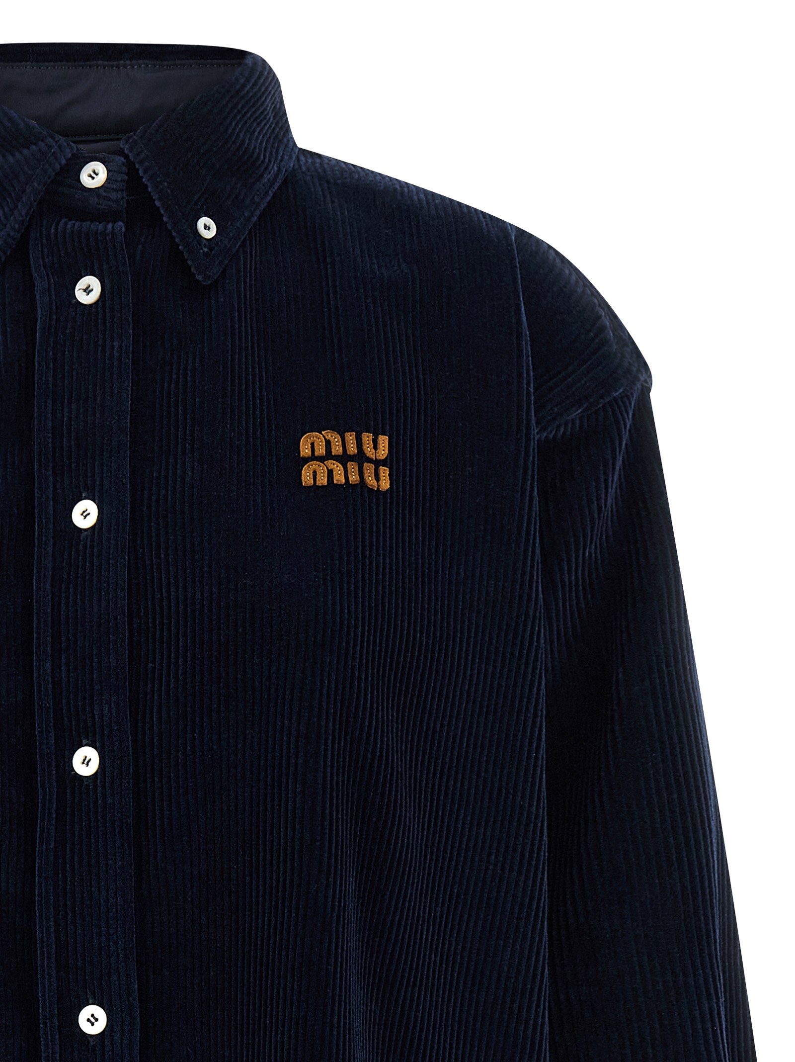 Heavy corduroy shirt, logo patch and suede elbow patch, button-down model, front mother-of-pearl button closure, long cuffed sleeves, rounded hem.