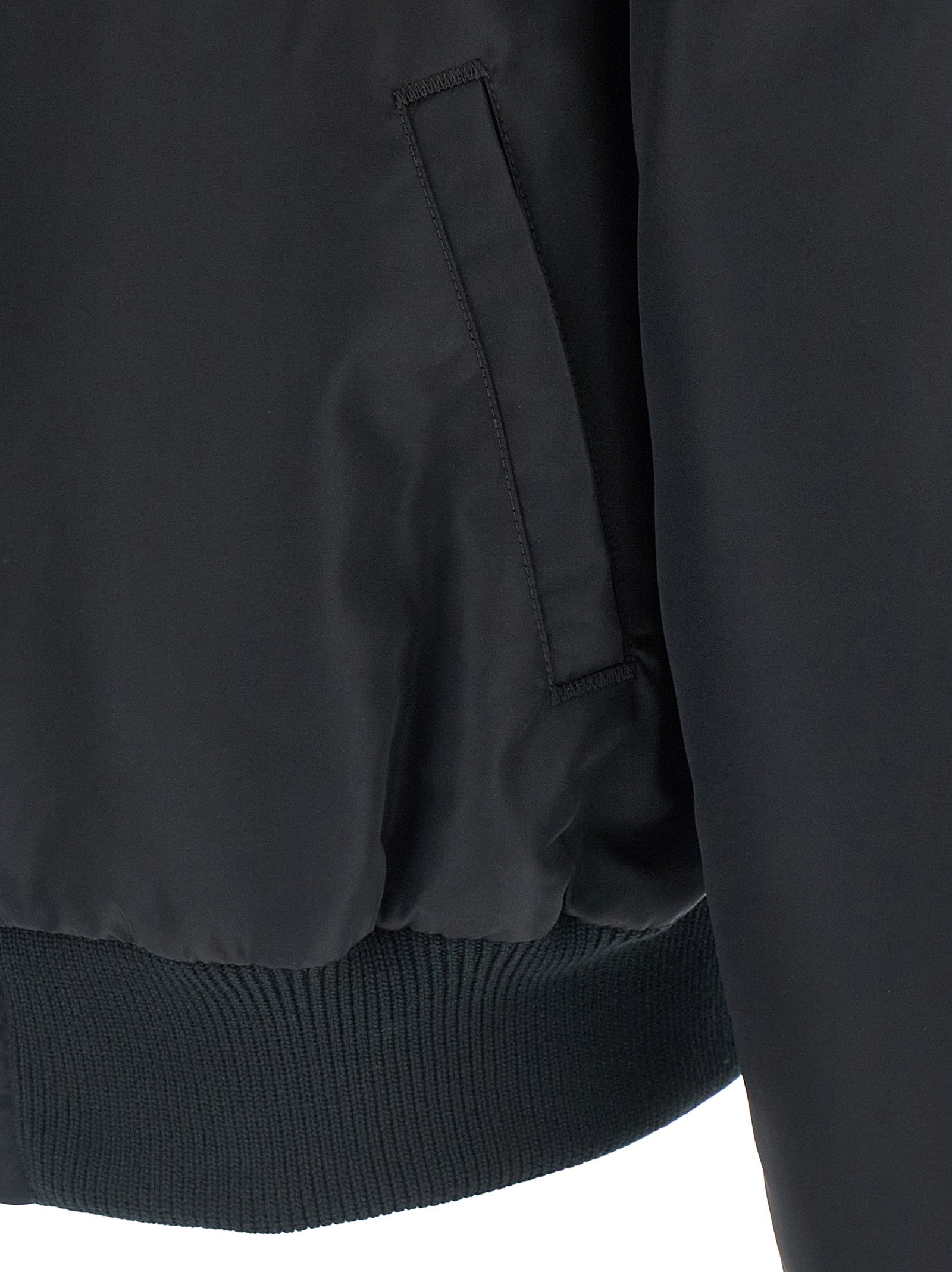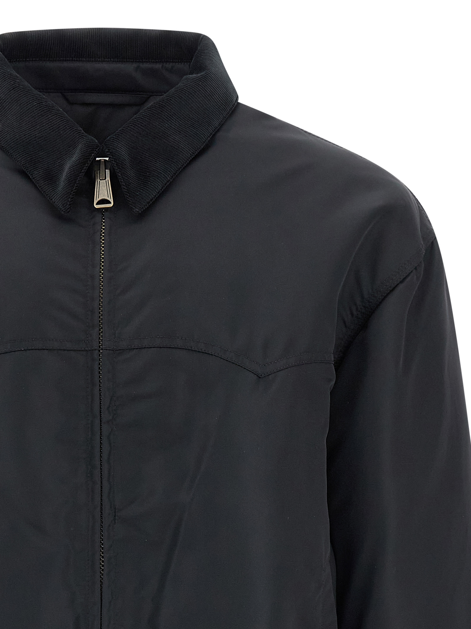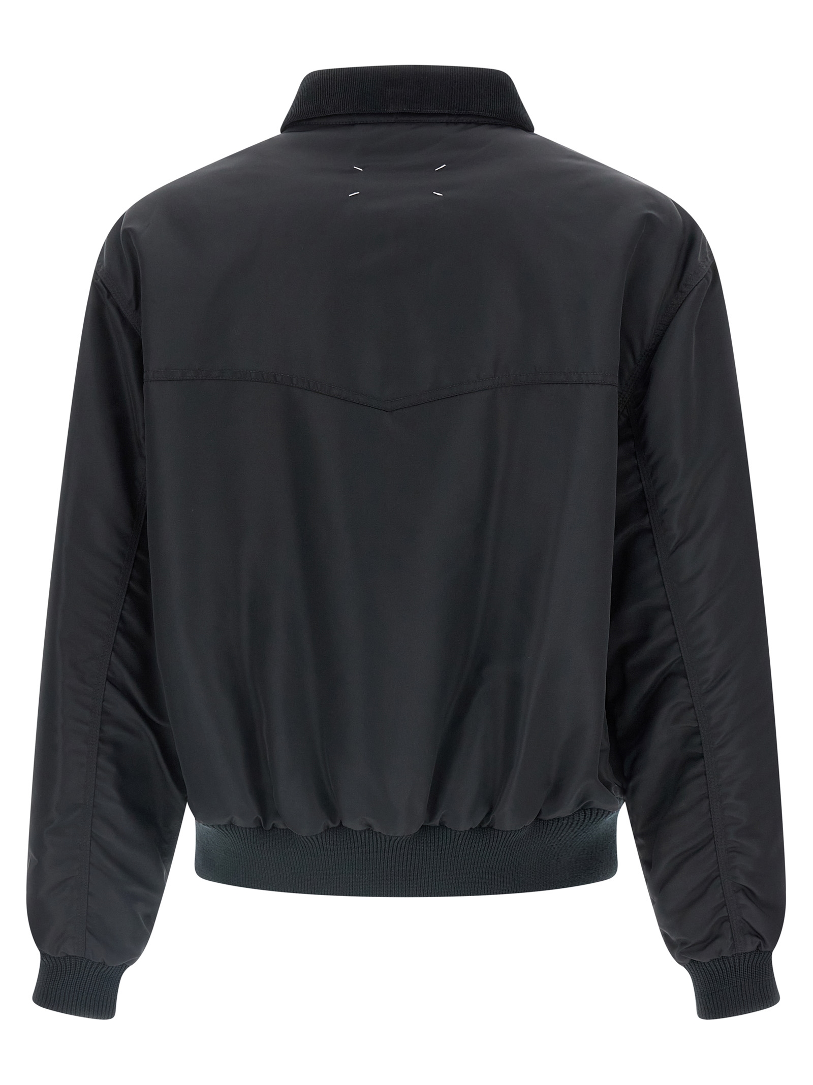 Padded nylon bomber jacket with stretch ribbed knit details, tone-on-tone corduroy collar, front zip closure, pockets, long cuffed sleeves, headband, ‘Four stitches’ at the back.