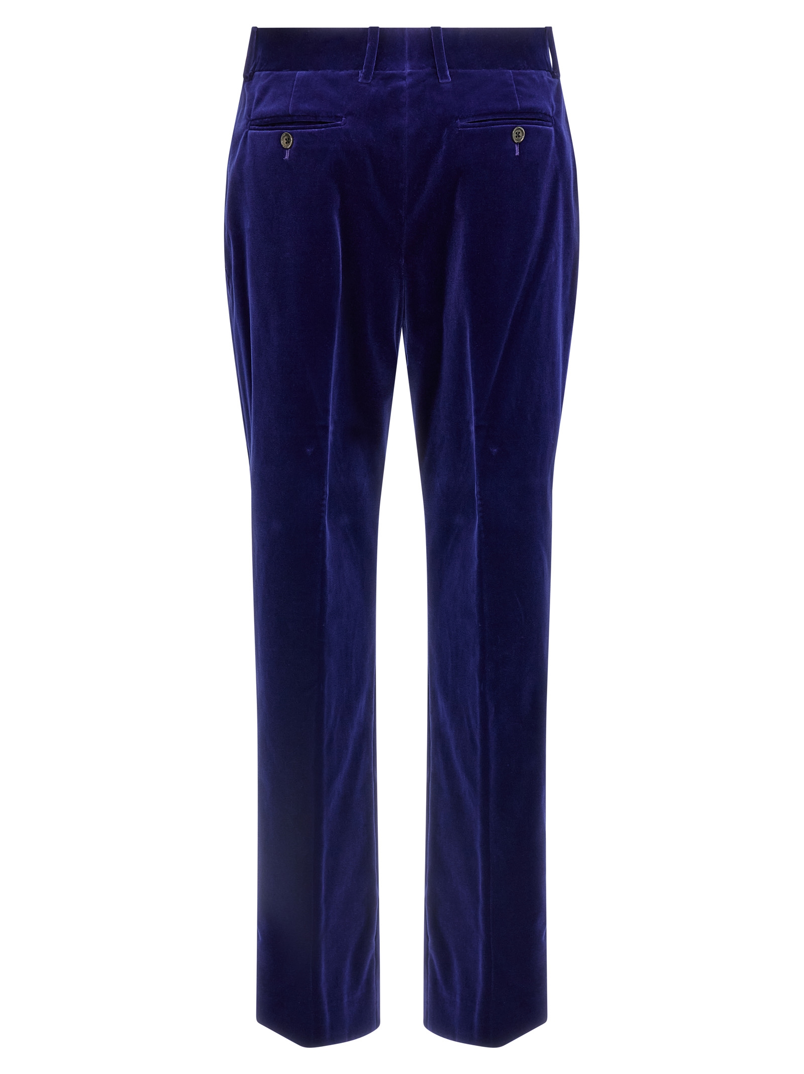 Velvet trousers, zipper hook and front button closure, pockets, straight leg.