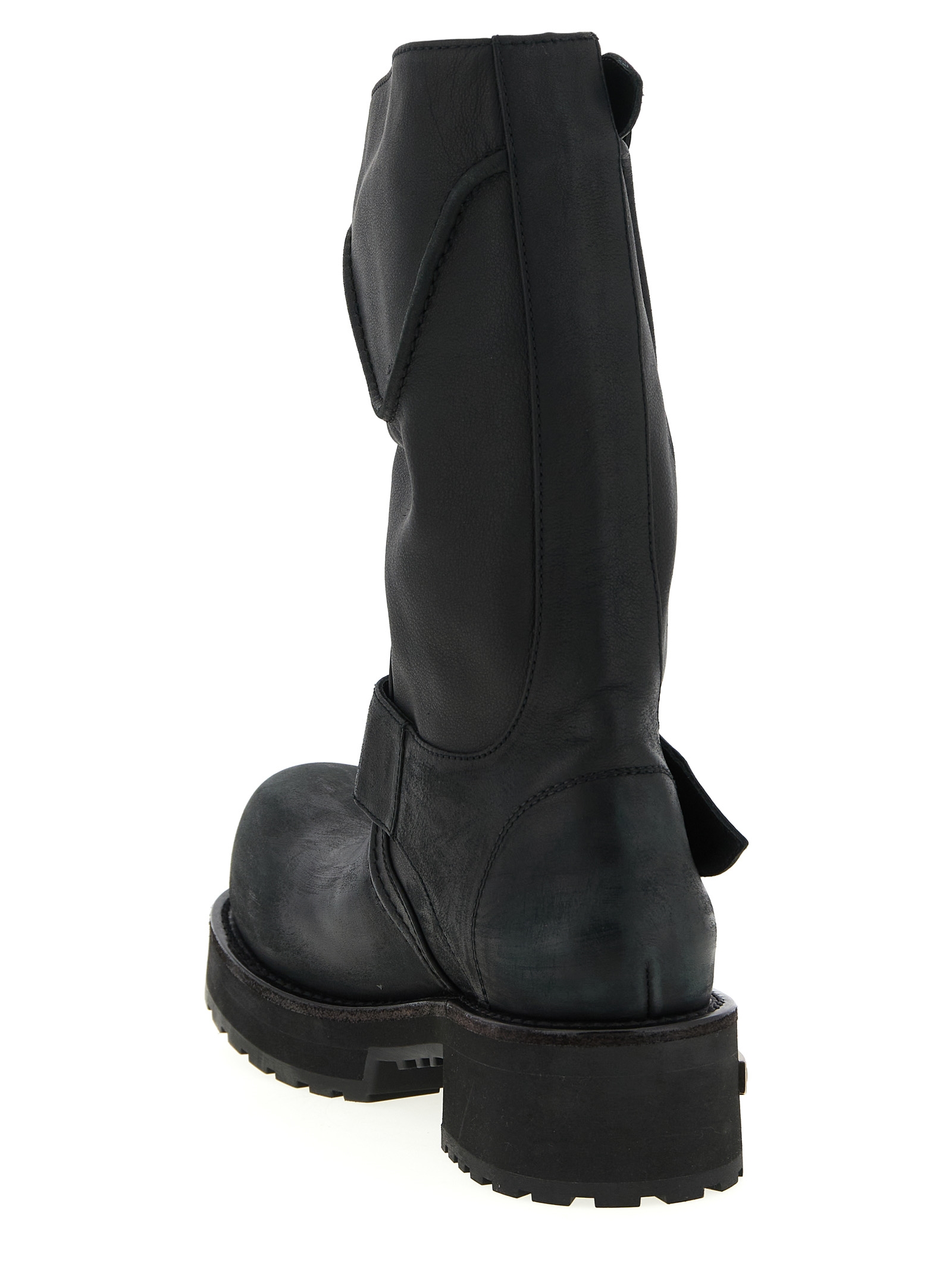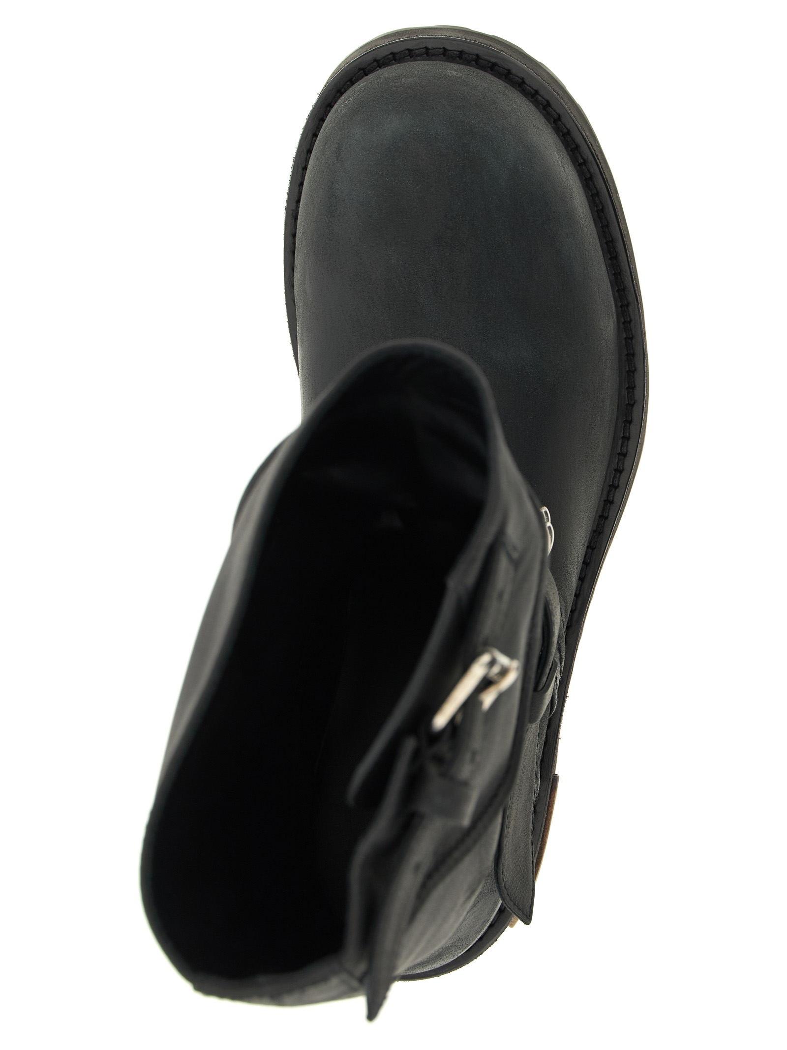 ‘Venom’ used-effect leather boots, ultra-rounded toe, straps with adjustable buckles, embossed side logo, thick notched rubber sole.
