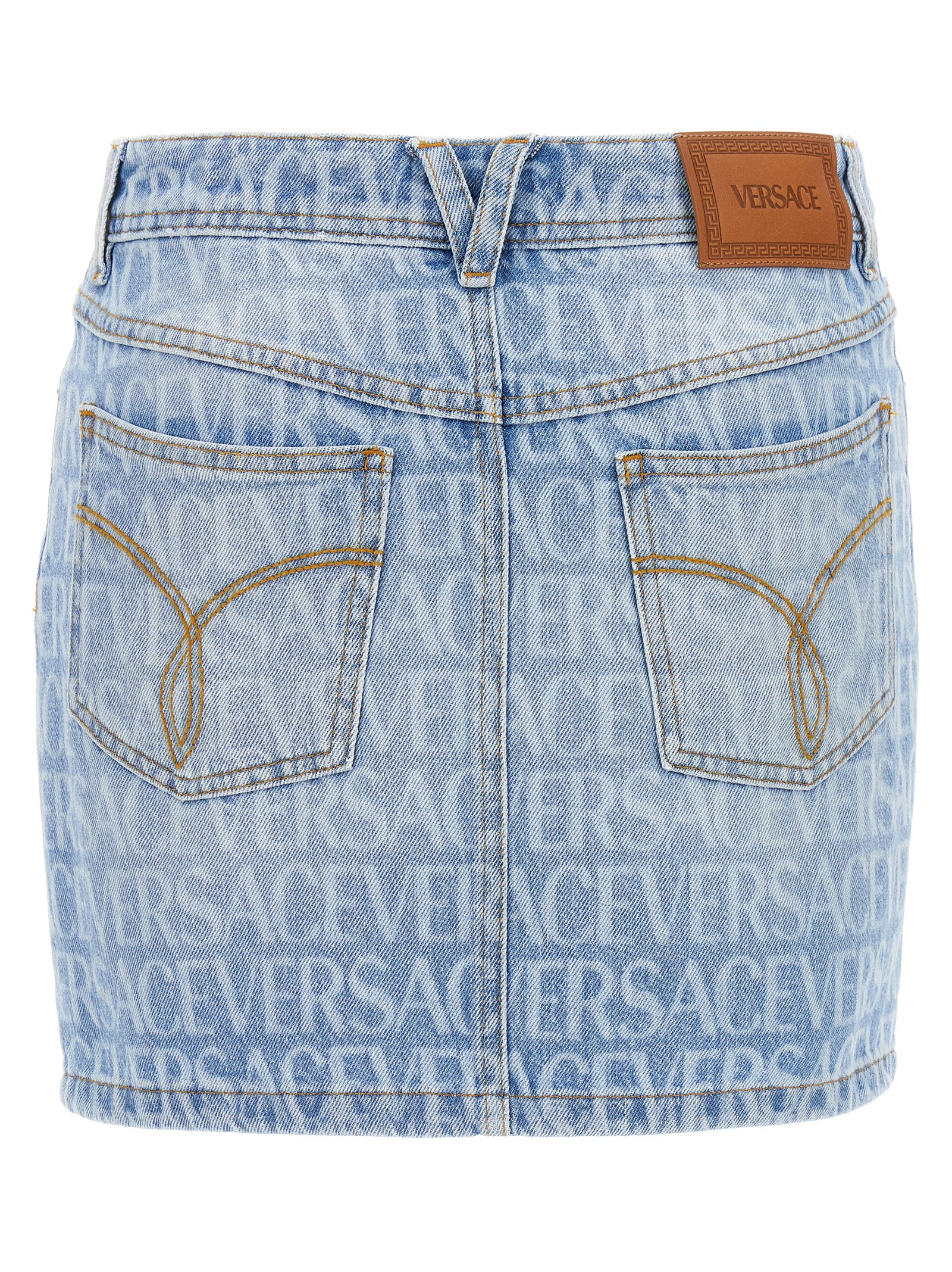 Stone washed denim skirt with ‘Versace Allover’ print, a zip and button closure, five pockets.
