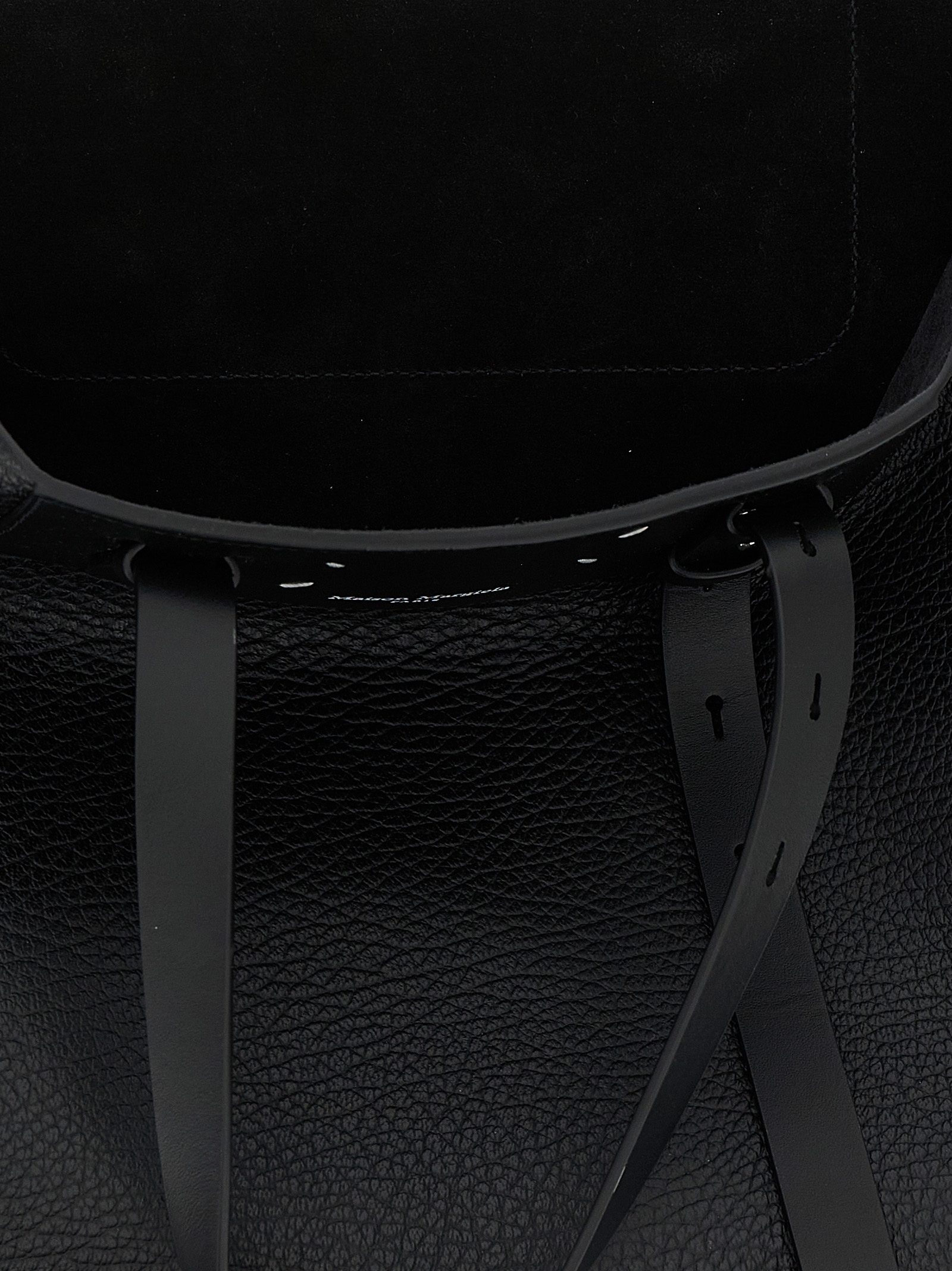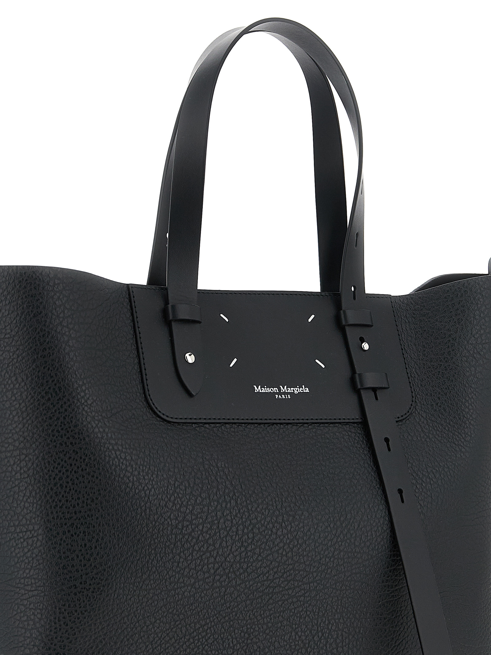 ‘Vertical’ shopping bag in grainy and smooth leather, double adjustable handle, ‘Four stitches’ and embossed logo on the front, metal D-ring on the back.