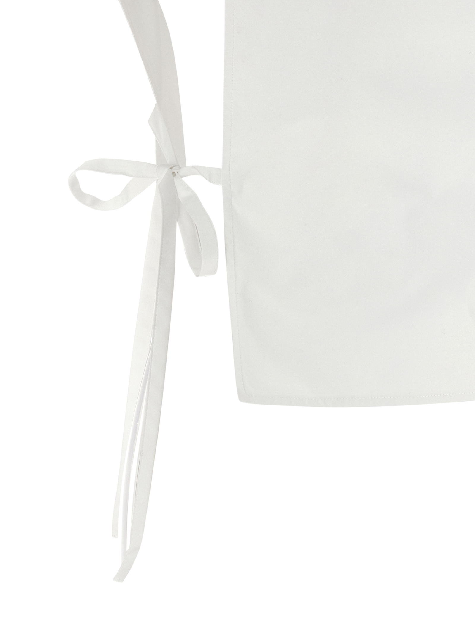 Cotton poplin shirt, vest style with side openings and ribbon closure, button-down collar, tone-on-tone logo embroidery and front button closure, and asymmetric hem.