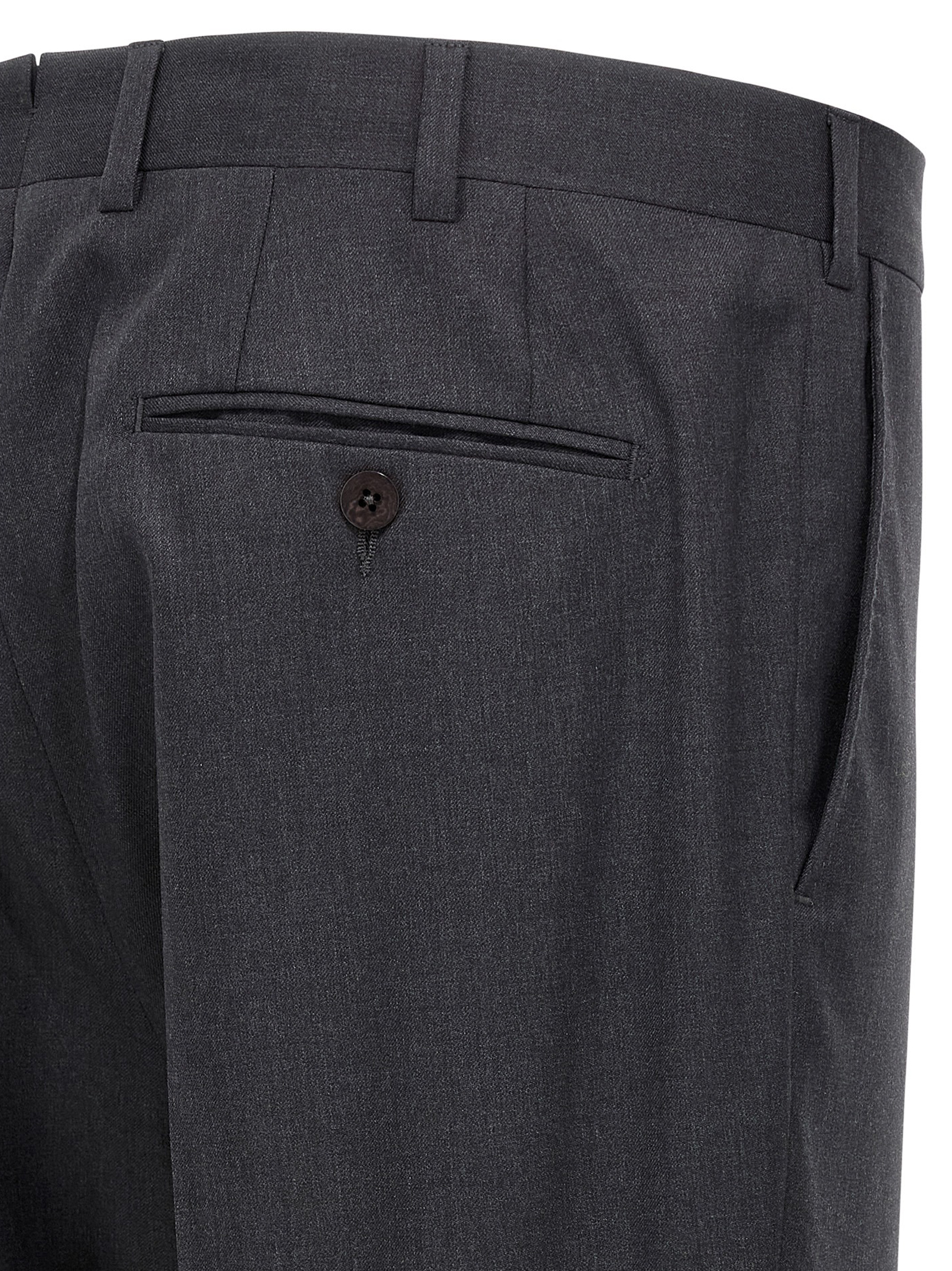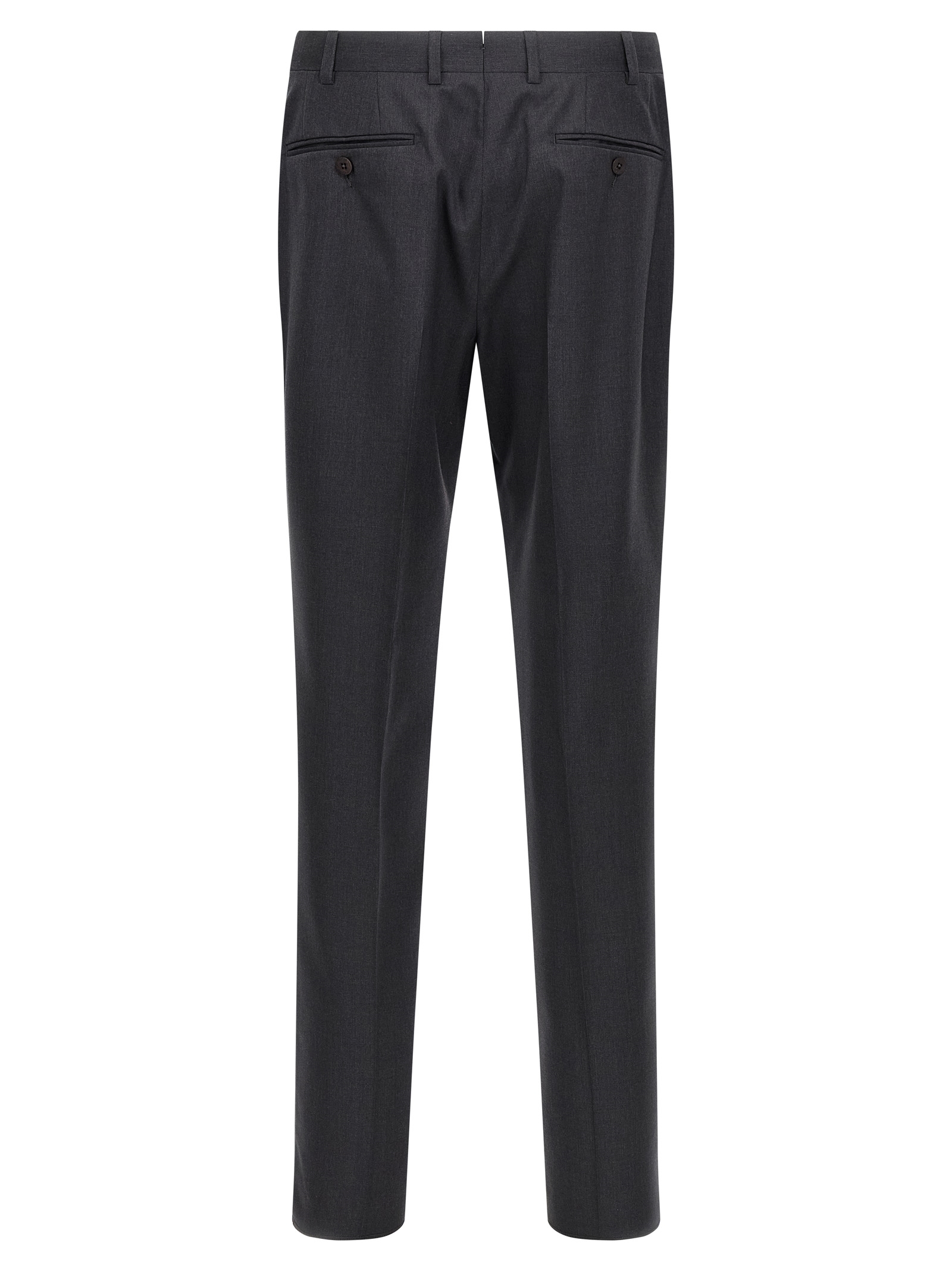 ‘Vicenza’ wool dress consisting of single-breasted blazer with front button closure, mirror lapels with removable metal brooch, breast pocket, flap pockets, cupro lining, two inner pockets, cuffs with opening buttonholes, back slits and trousers with stretched pleat, front ‘americane pockets’, back welt pockets, front zip and button closure, viscose lining.