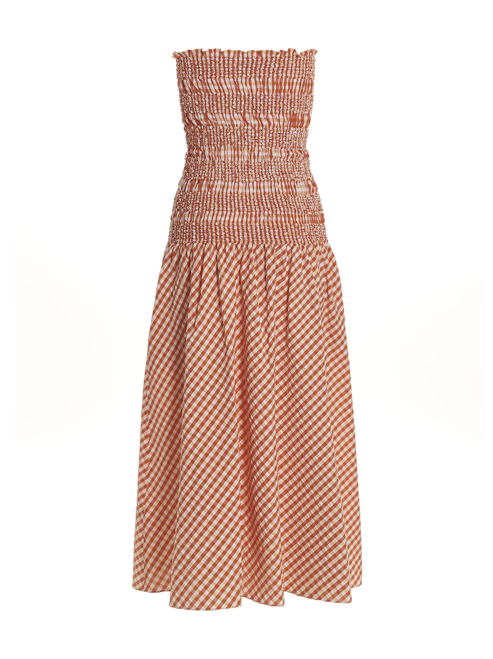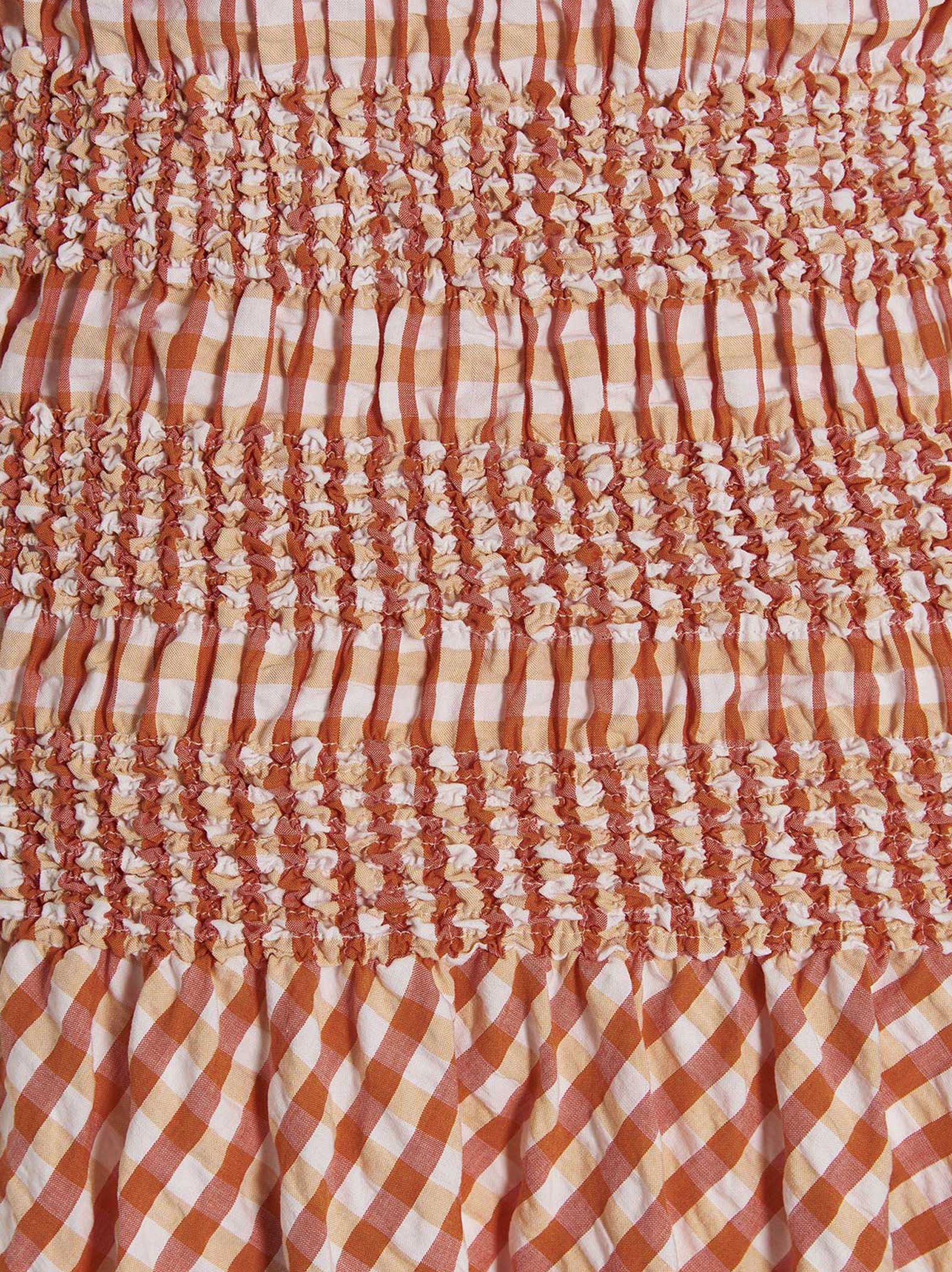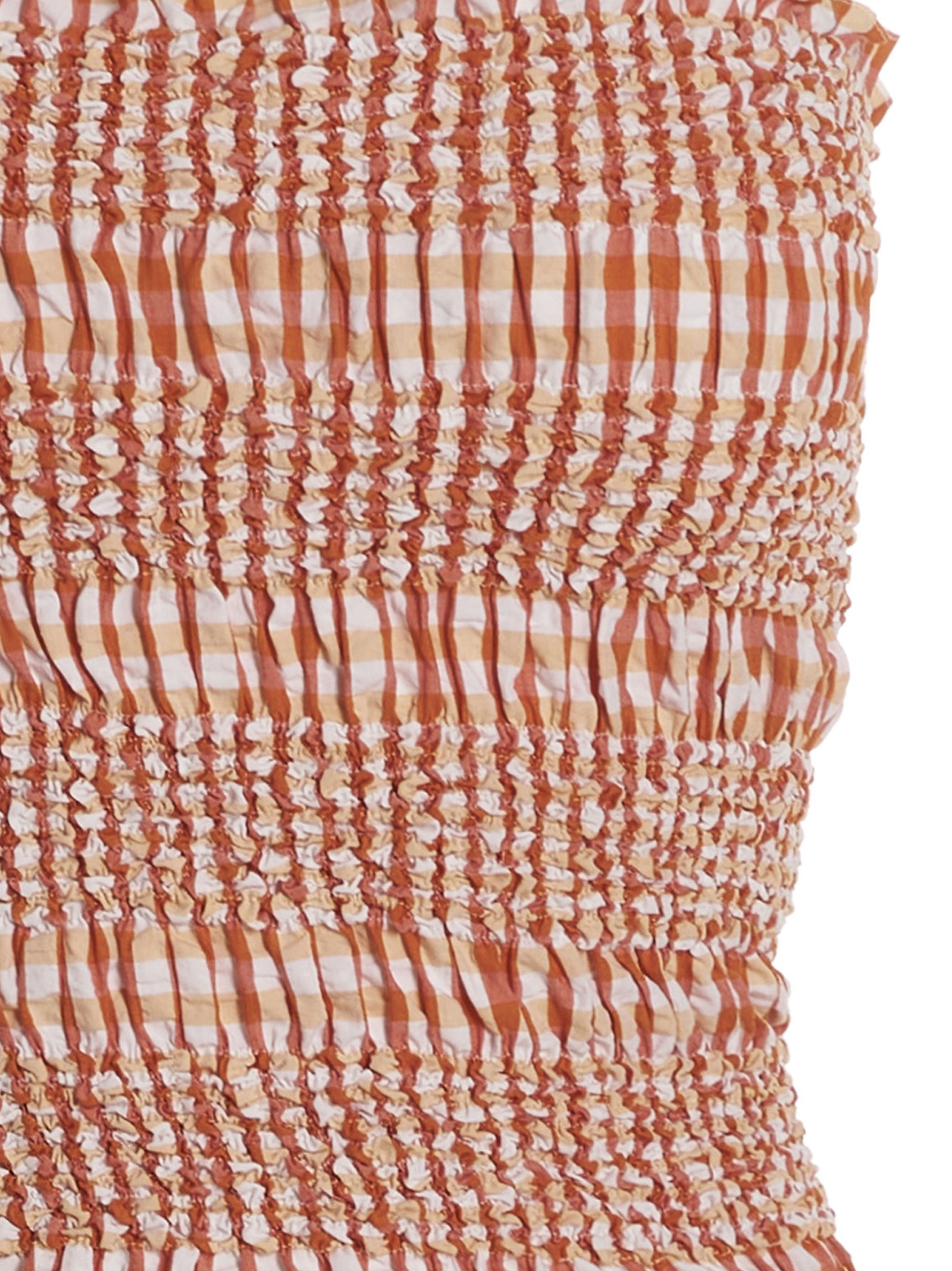 All over vichy cotton print dress featuring an off-the-shoulder style with a smock stitch top and pockets.